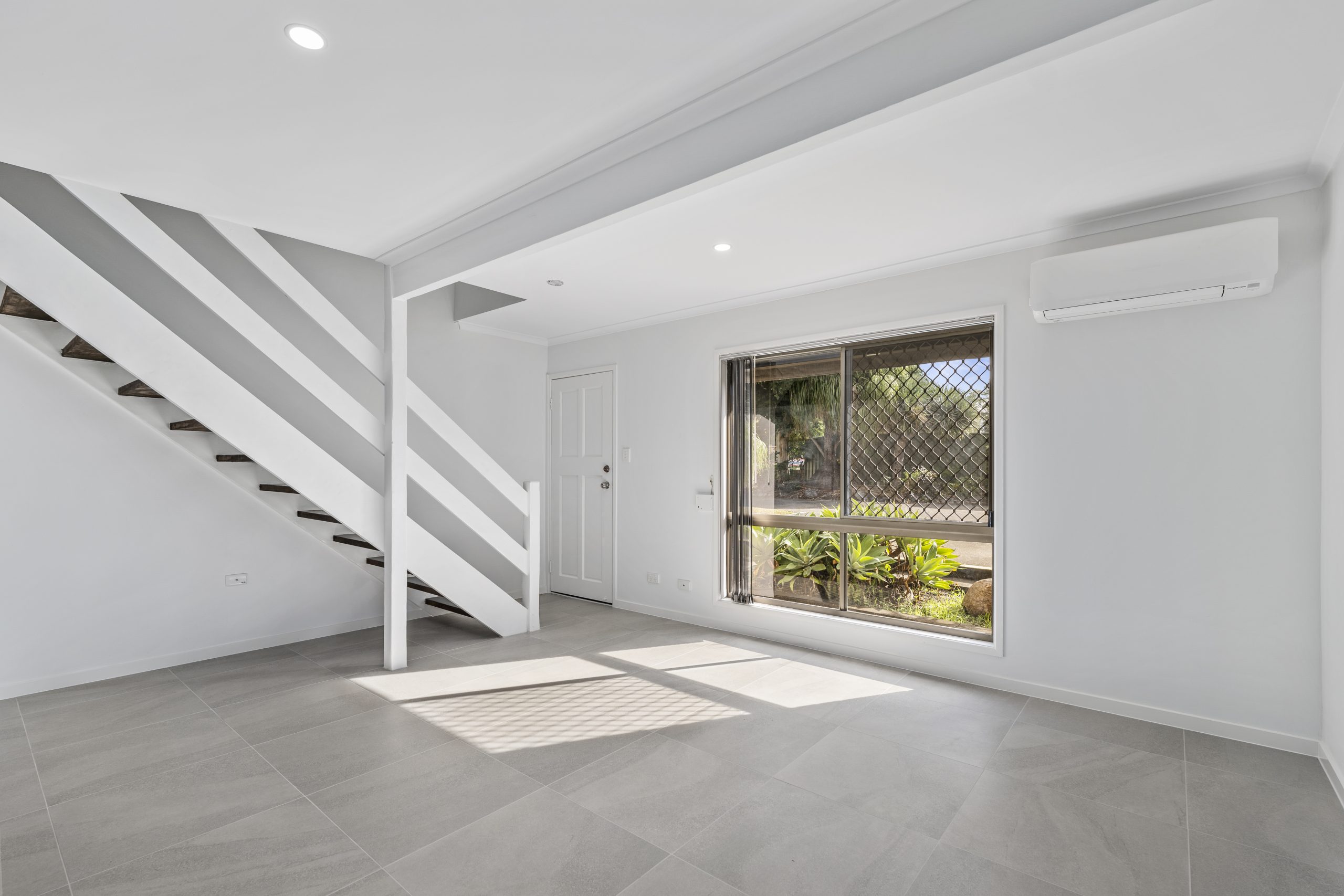 The lower level features a functional family kitchen overlooking the air conditioned open plan living areas, creating a welcoming space for everyday living. Upstairs, two well-sized bedrooms provide comfortable accommodation, each fitted with built-in wardrobes & ceiling fans and separated from the living zones below.