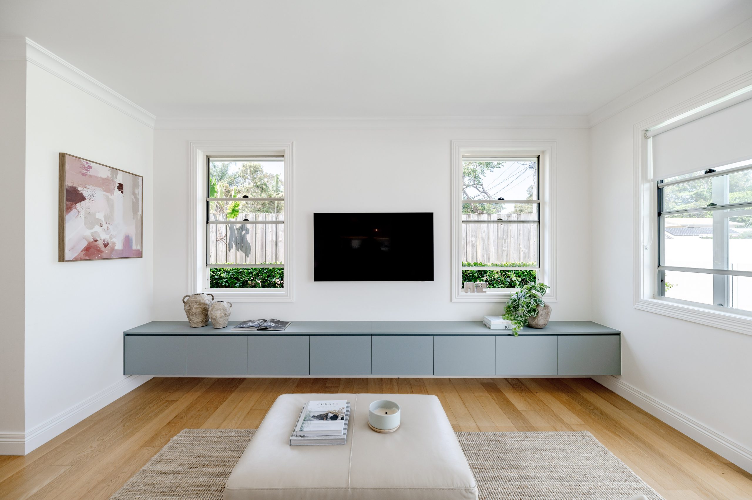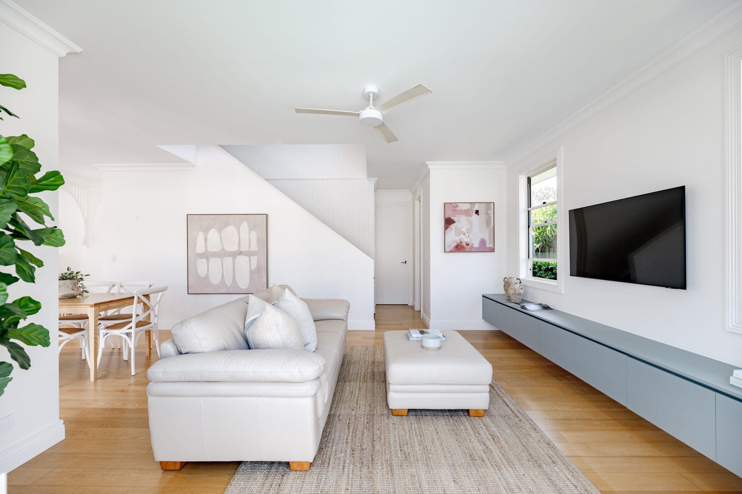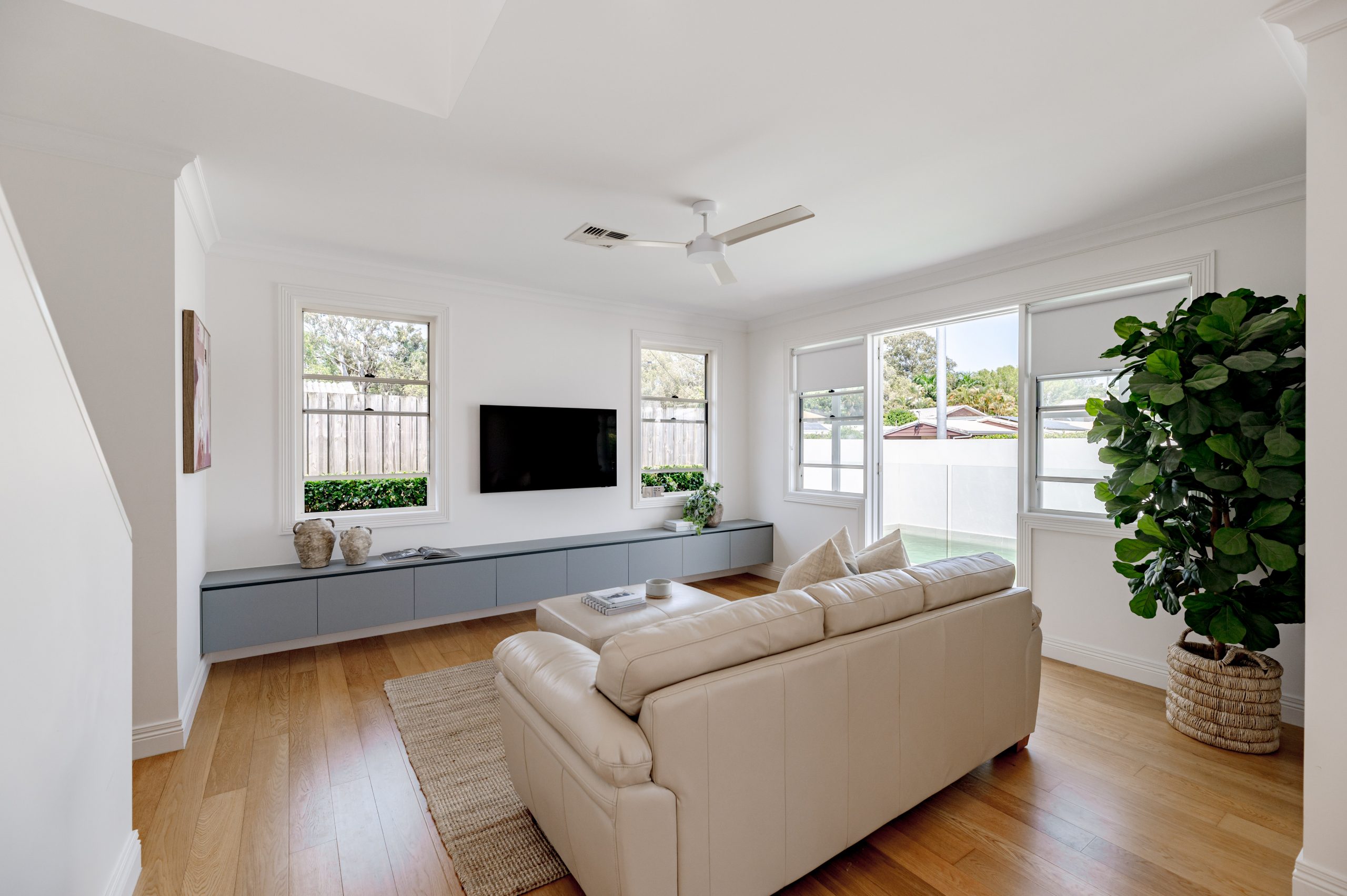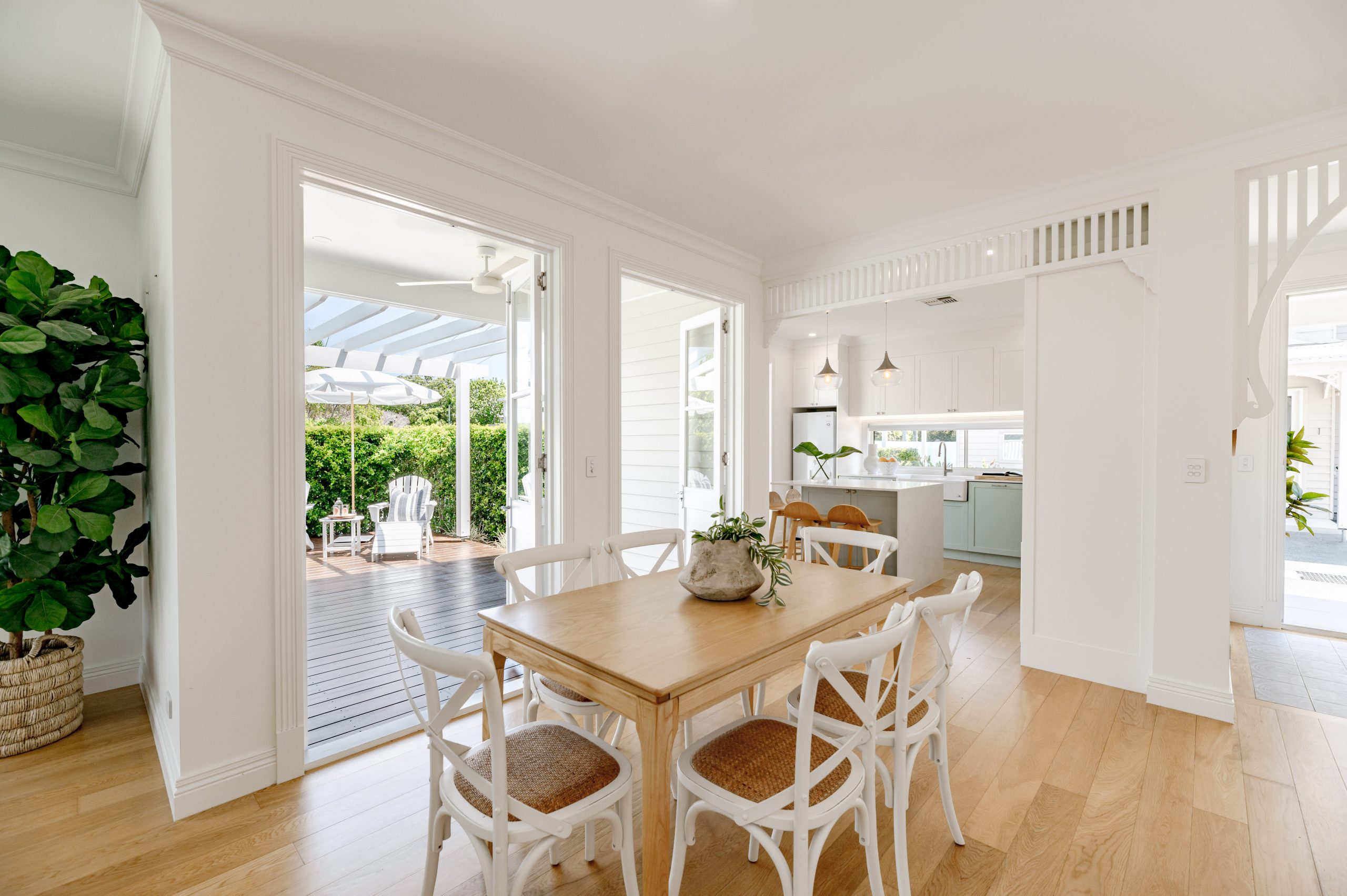 The weatherboard exterior, timber floor interior and custom cabinetry throughout add to the mood of modern Queensland charm.