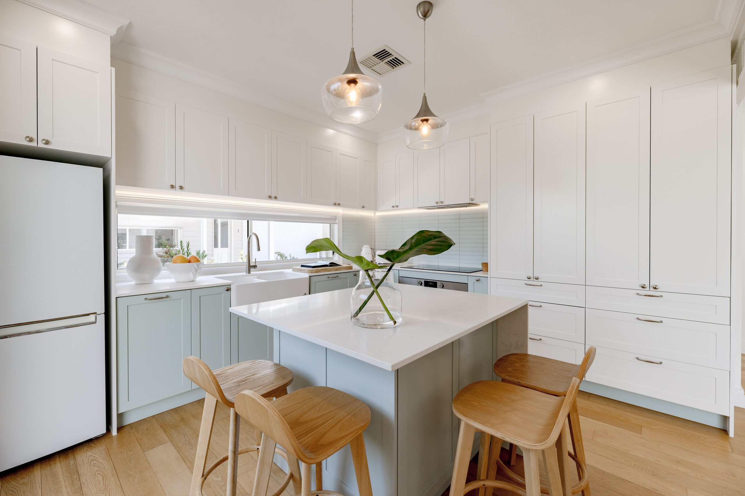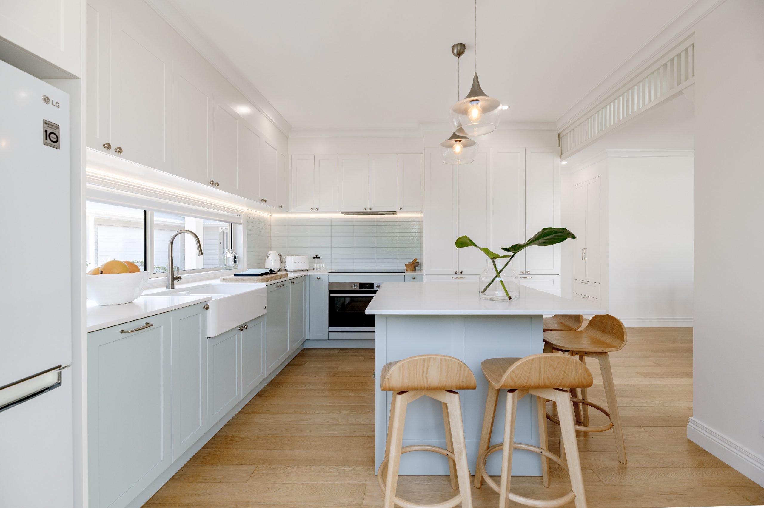 A character kitchen makes meal preparations an absolute delight with a ‘Chambord France’ farmhouse sink and a large central island bench which doubles as a dual side breakfast bar.