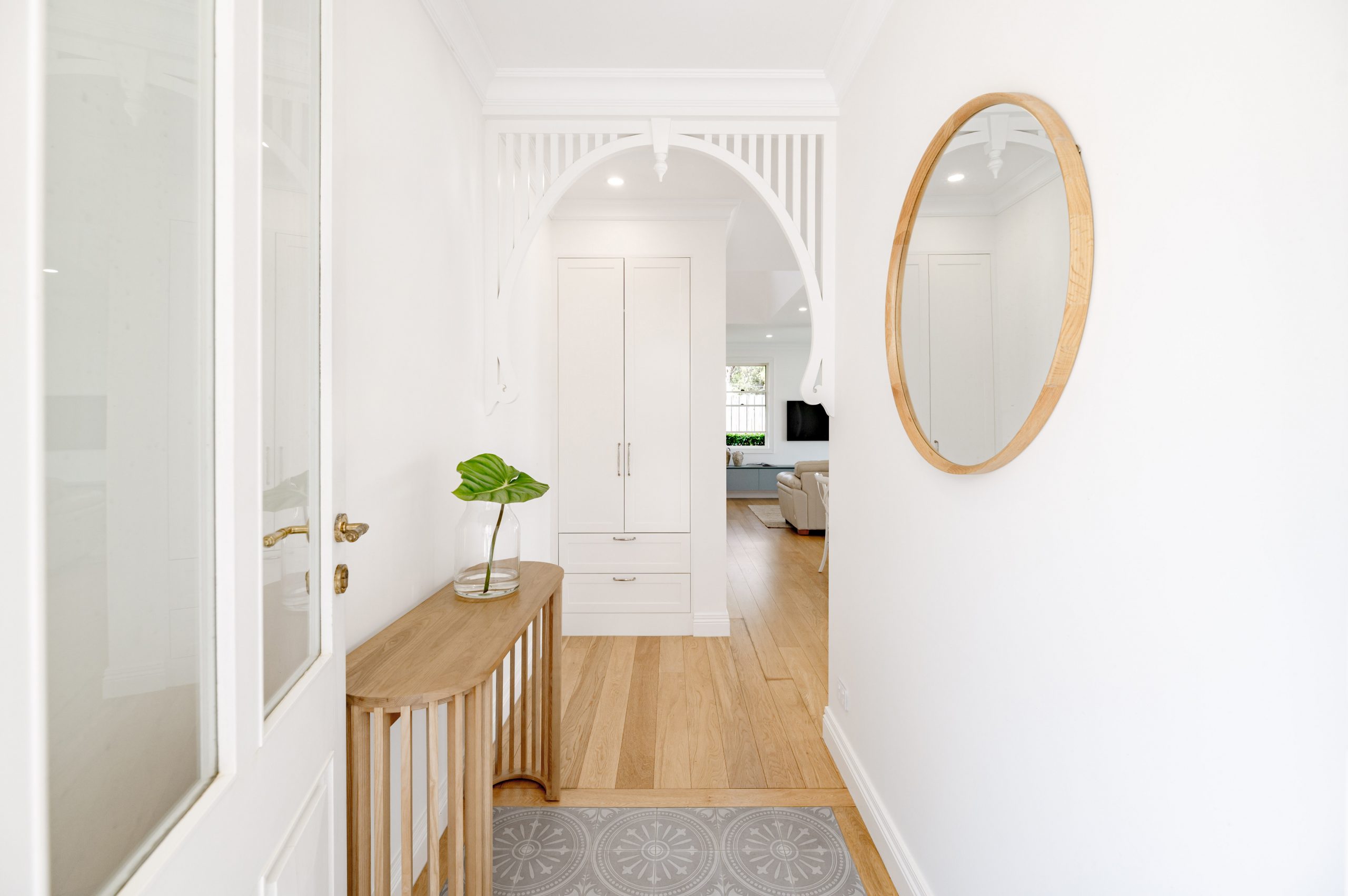 A welcoming entrance sets the scene, with a feature inlaid tiled floor arrival, timber floorboards, latticework archway and a built-in cloak closet.
