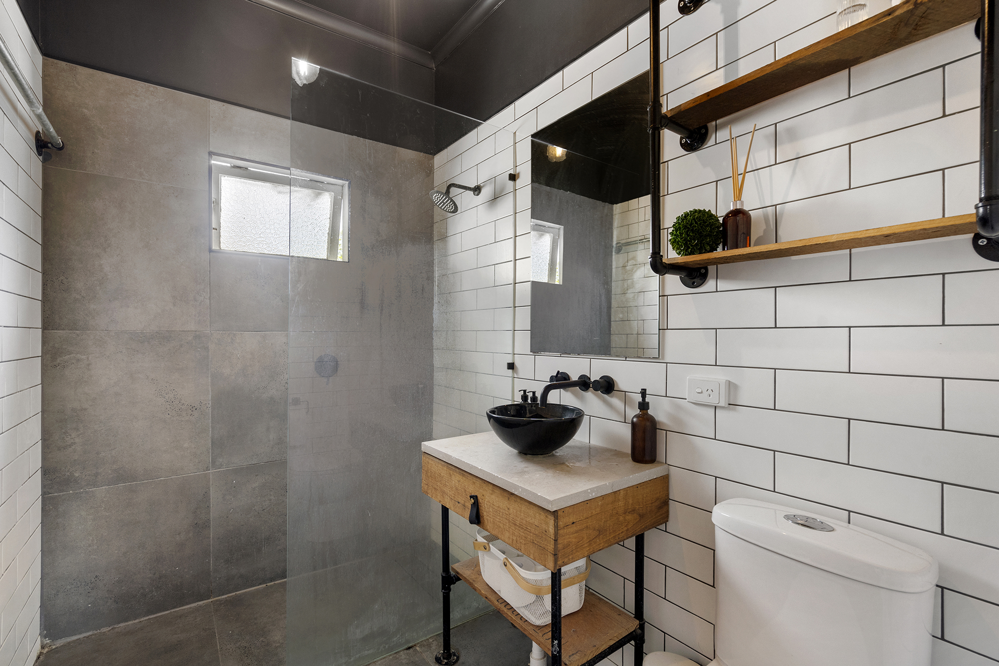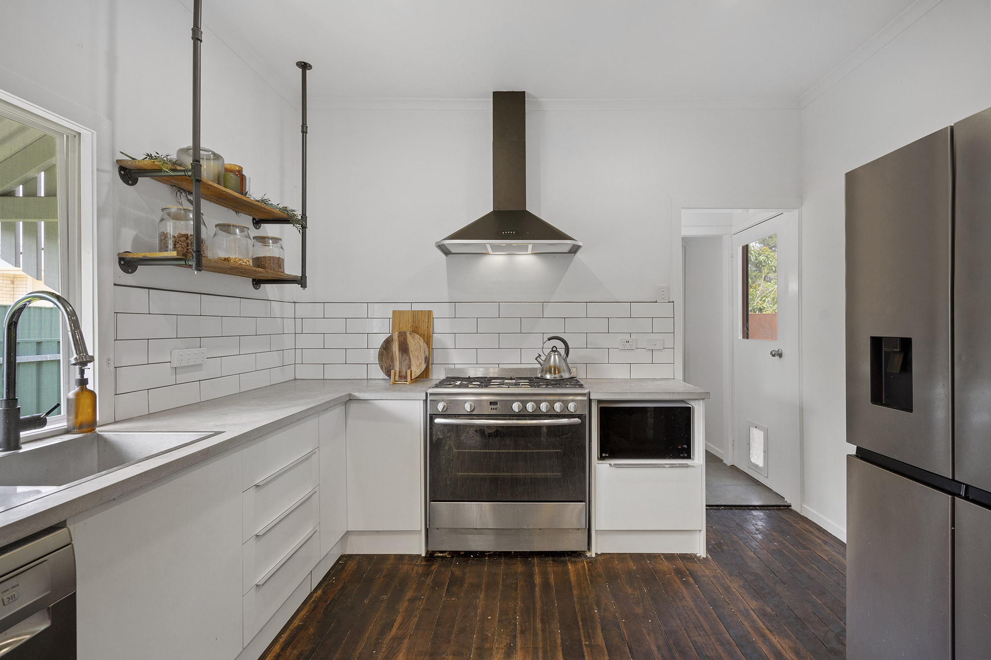 Set on a spacious footprint, the kitchen is flawlessly appointed and provides exceptional storage, gas stove, stainless appliances, tough fixtures, and concrete bench top all around.