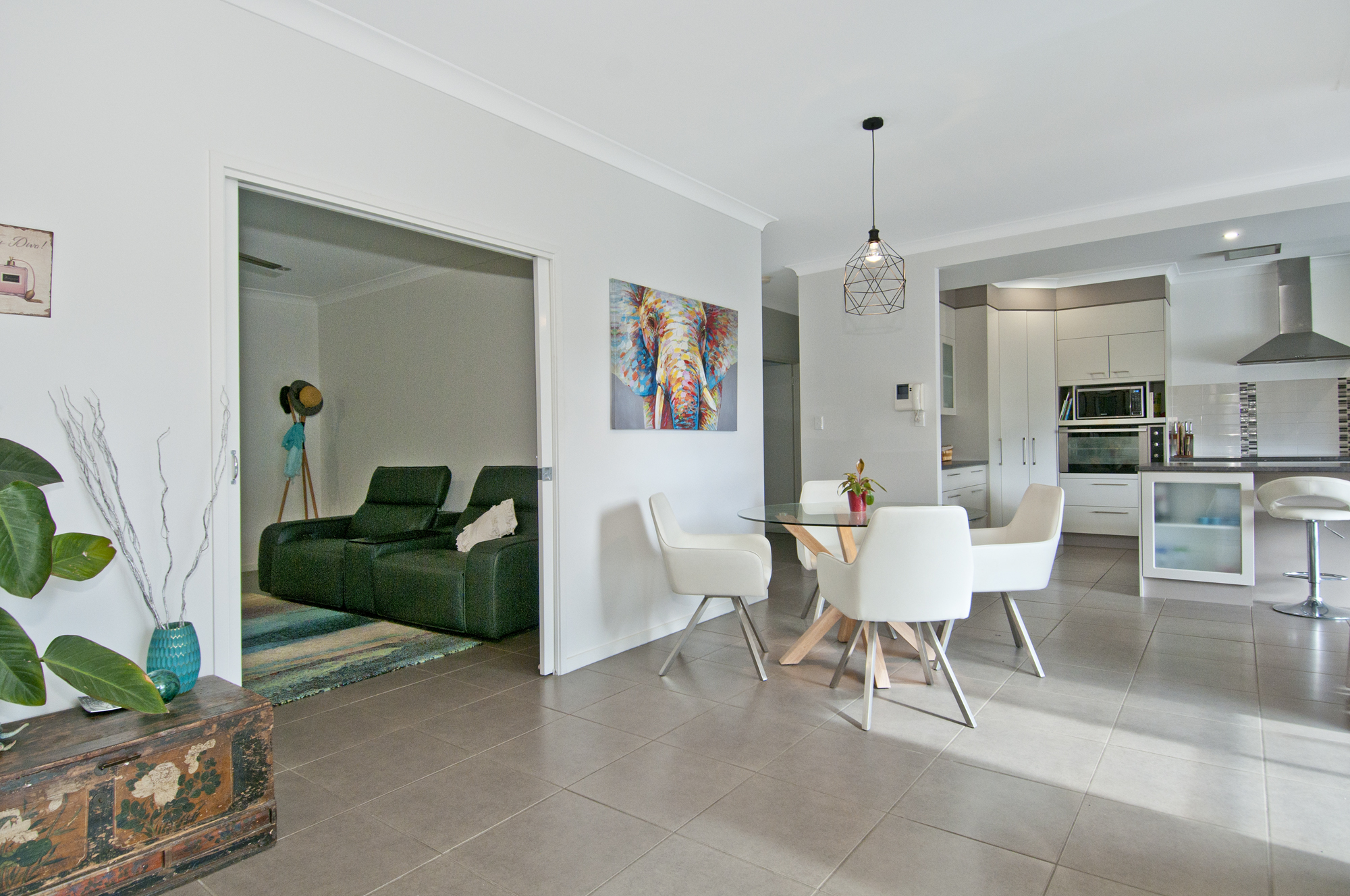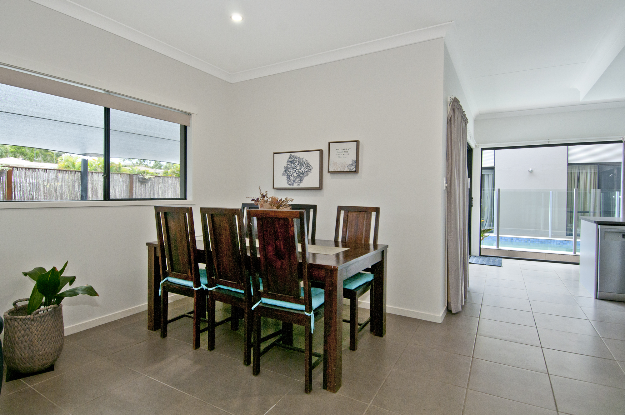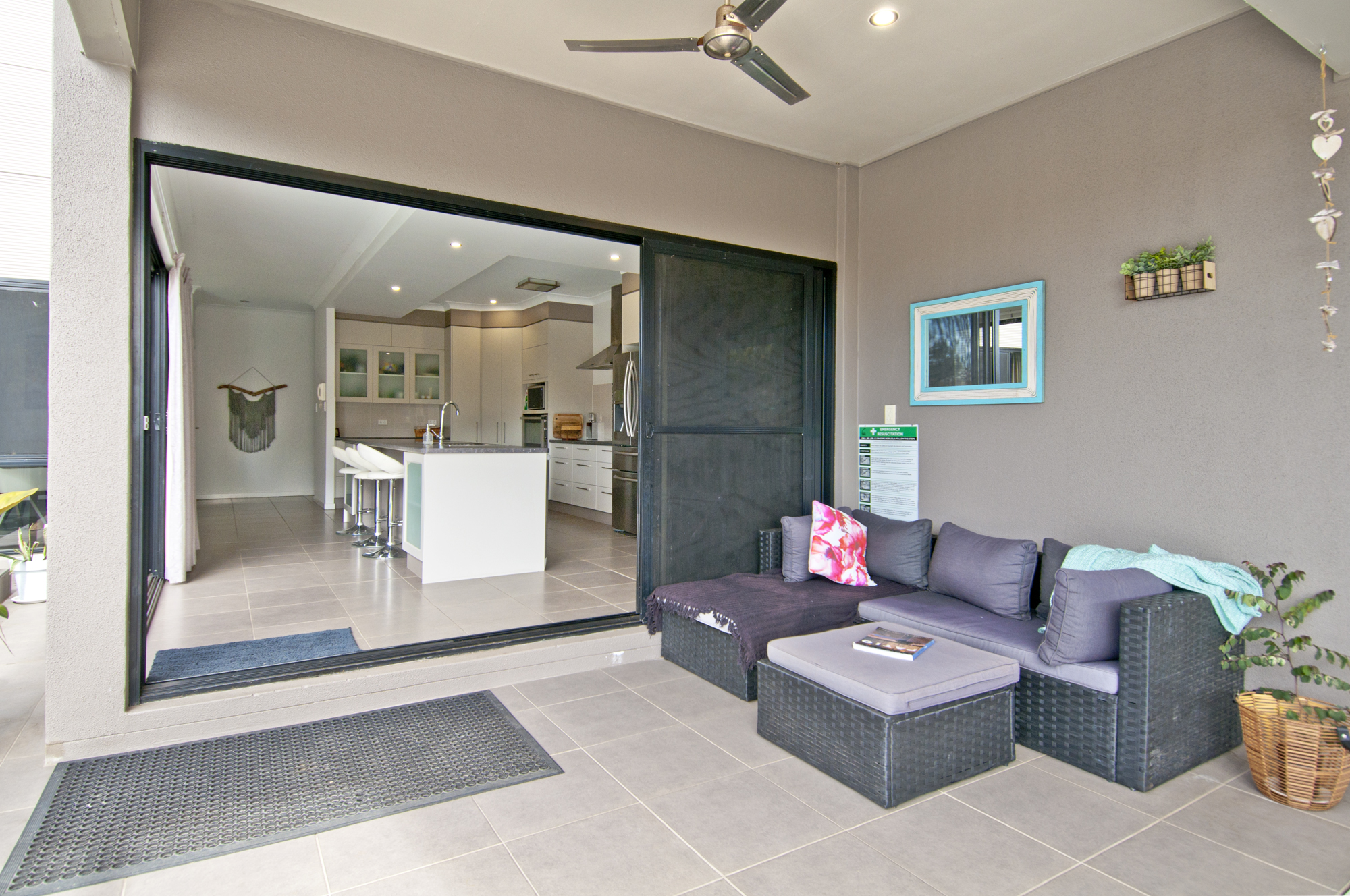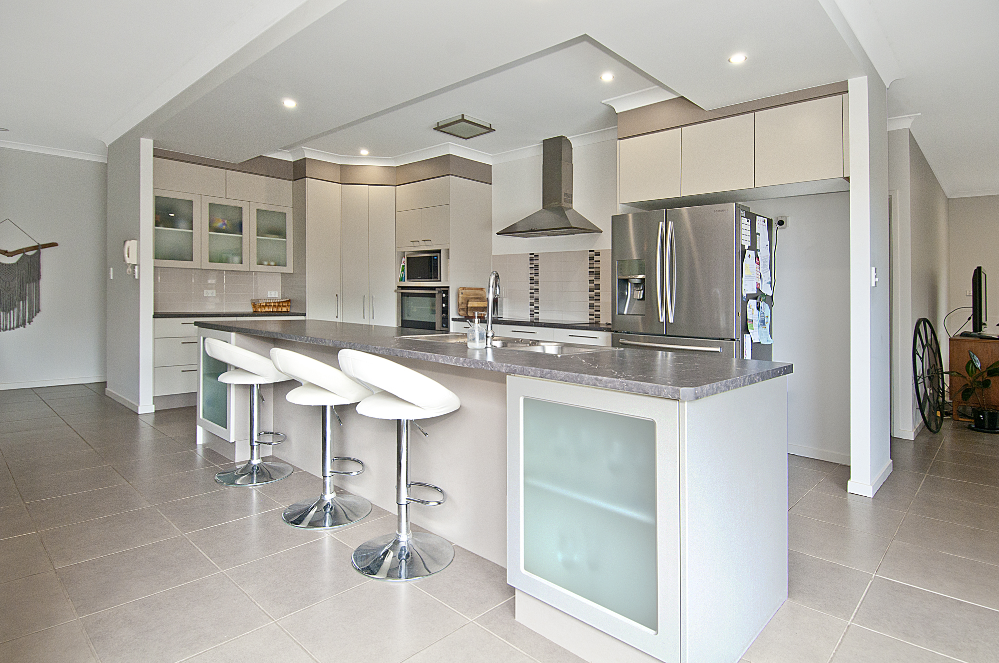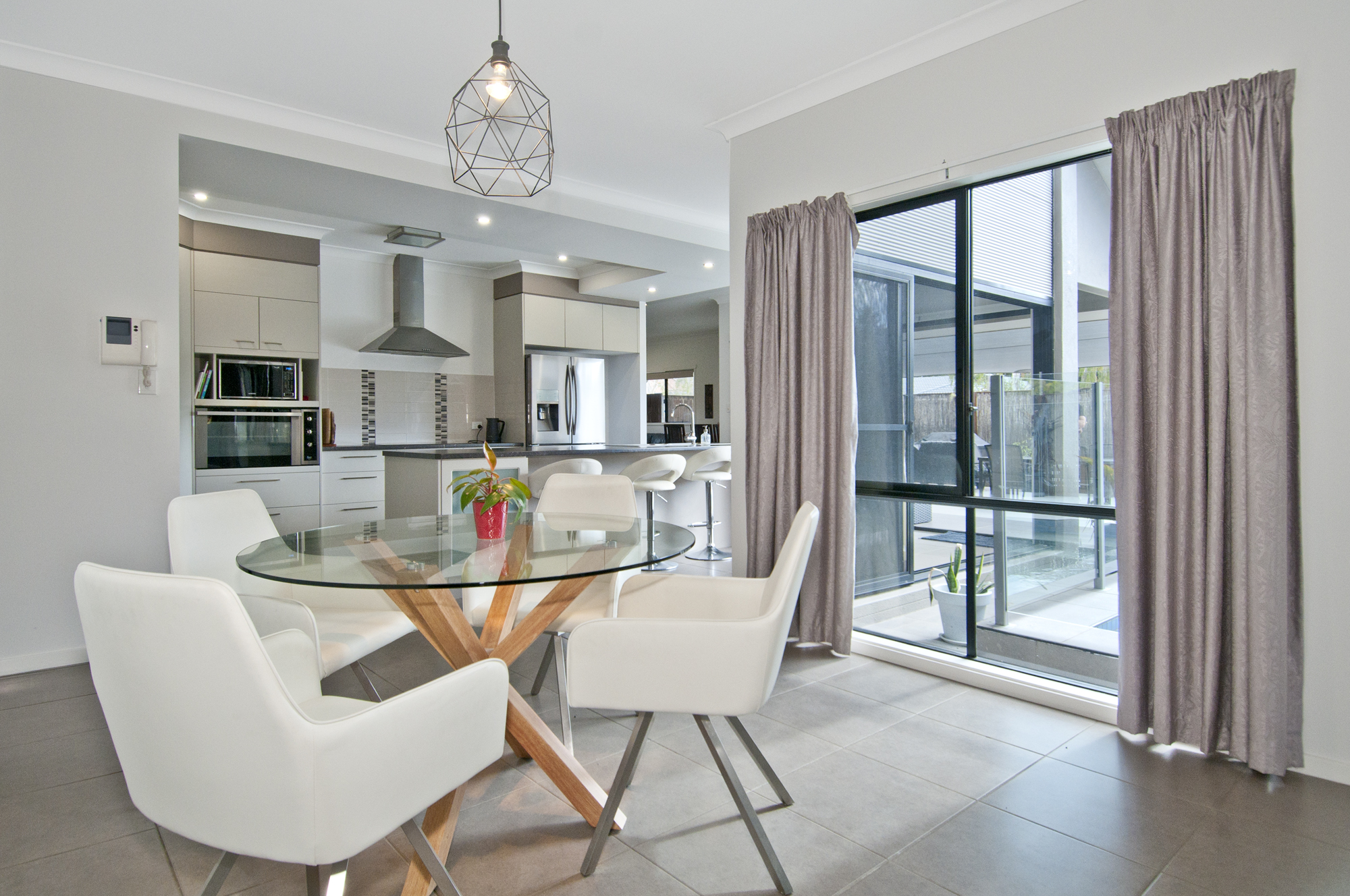 – Modern galley style kitchen complete with stainless steel appliances, large island benchtop overlooking the open plan dining and outdoor entertainment area including inground pool
