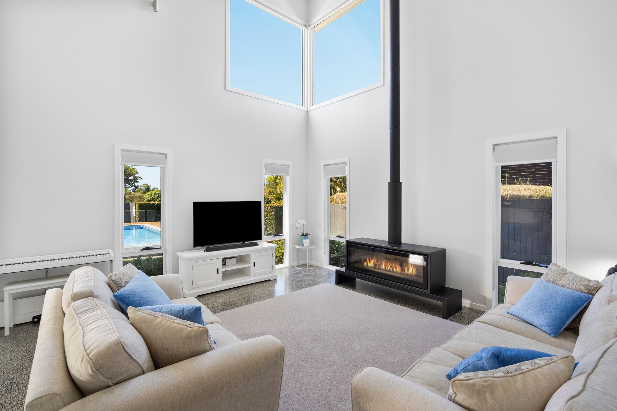 Designed for effortless family living and entertaining, the home reveals an expansive open-plan layout enhanced by high ceilings, polished concrete flooring, and an abundance of natural light. A striking feature wood burner anchors the main living zone, which flows seamlessly through bi-fold doors to a full-length tiled alfresco area-creating a true indoor-outdoor lifestyle.