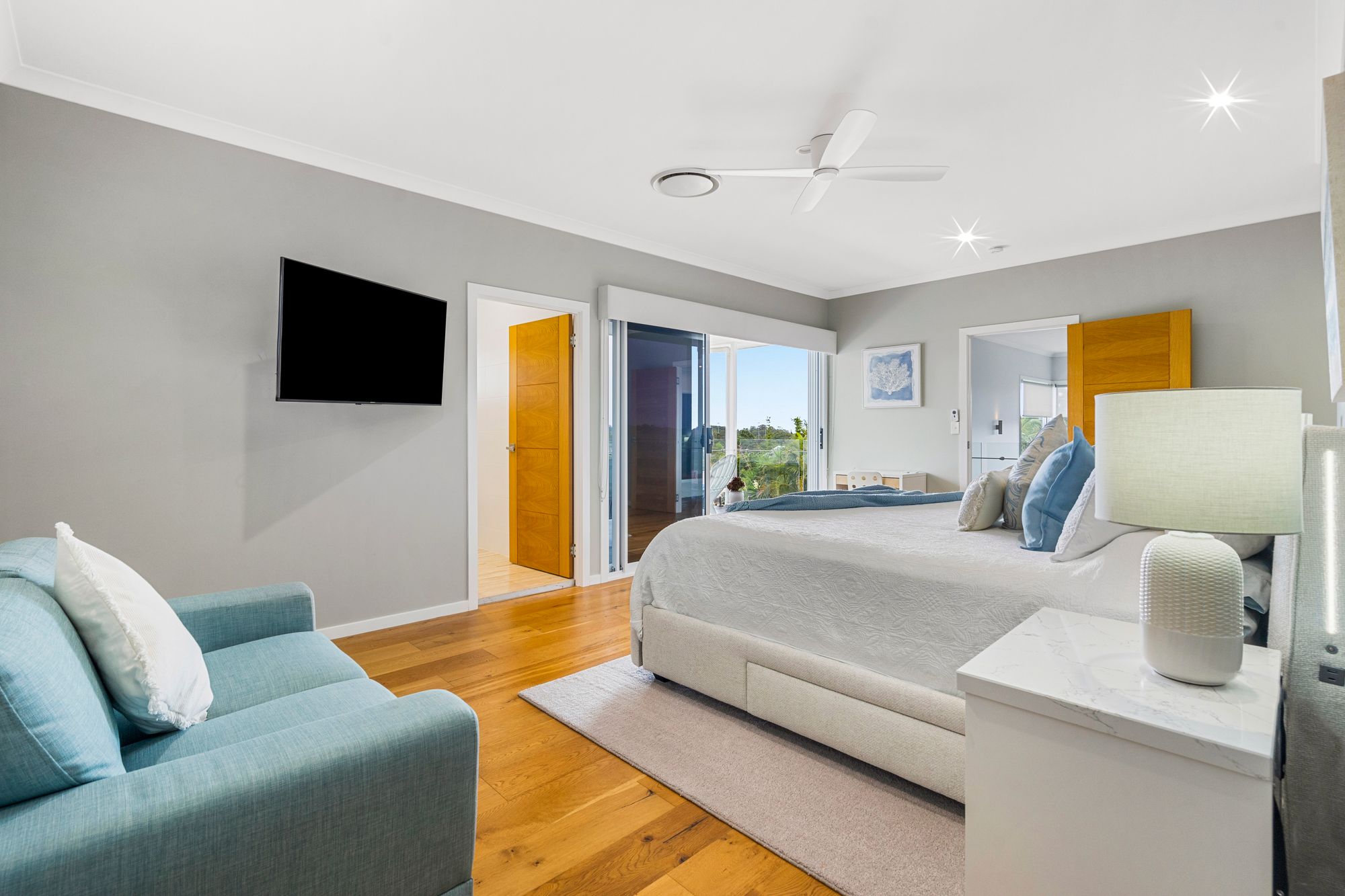 Accommodation is generous, comprising four bedrooms. The master suite is a private retreat, complete with a luxurious ensuite, expansive walk-in robe/dressing room, and direct access to a balcony capturing beautiful bay and island views. Three additional king-sized bedrooms are serviced by a stylish family bathroom with freestanding bath, while the fifth bedroom provides further versatility.