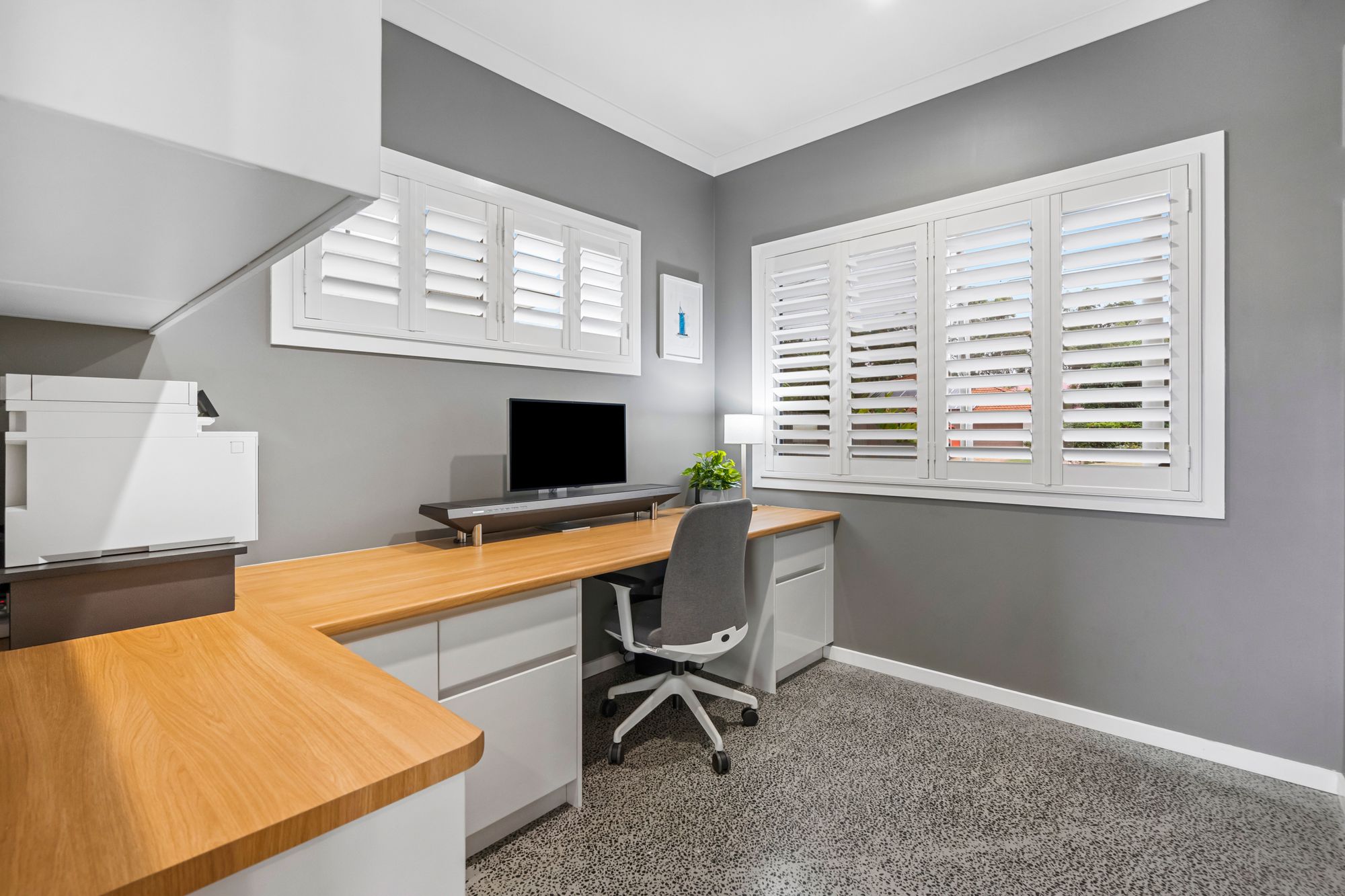 • Separate media room plus built-in home office