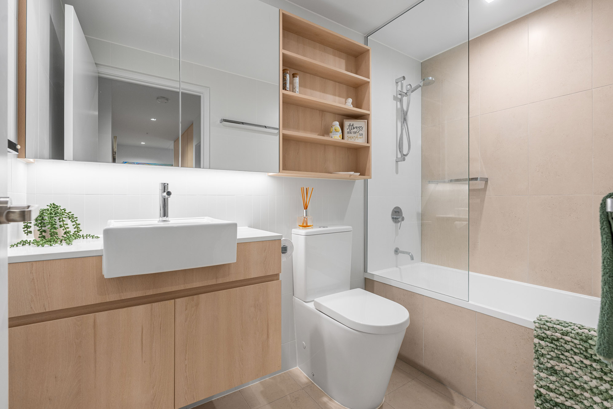 • Elegant oak-look flooring in living areas, plush carpet in bedrooms