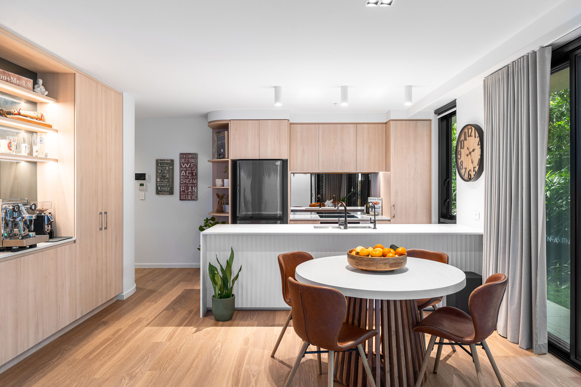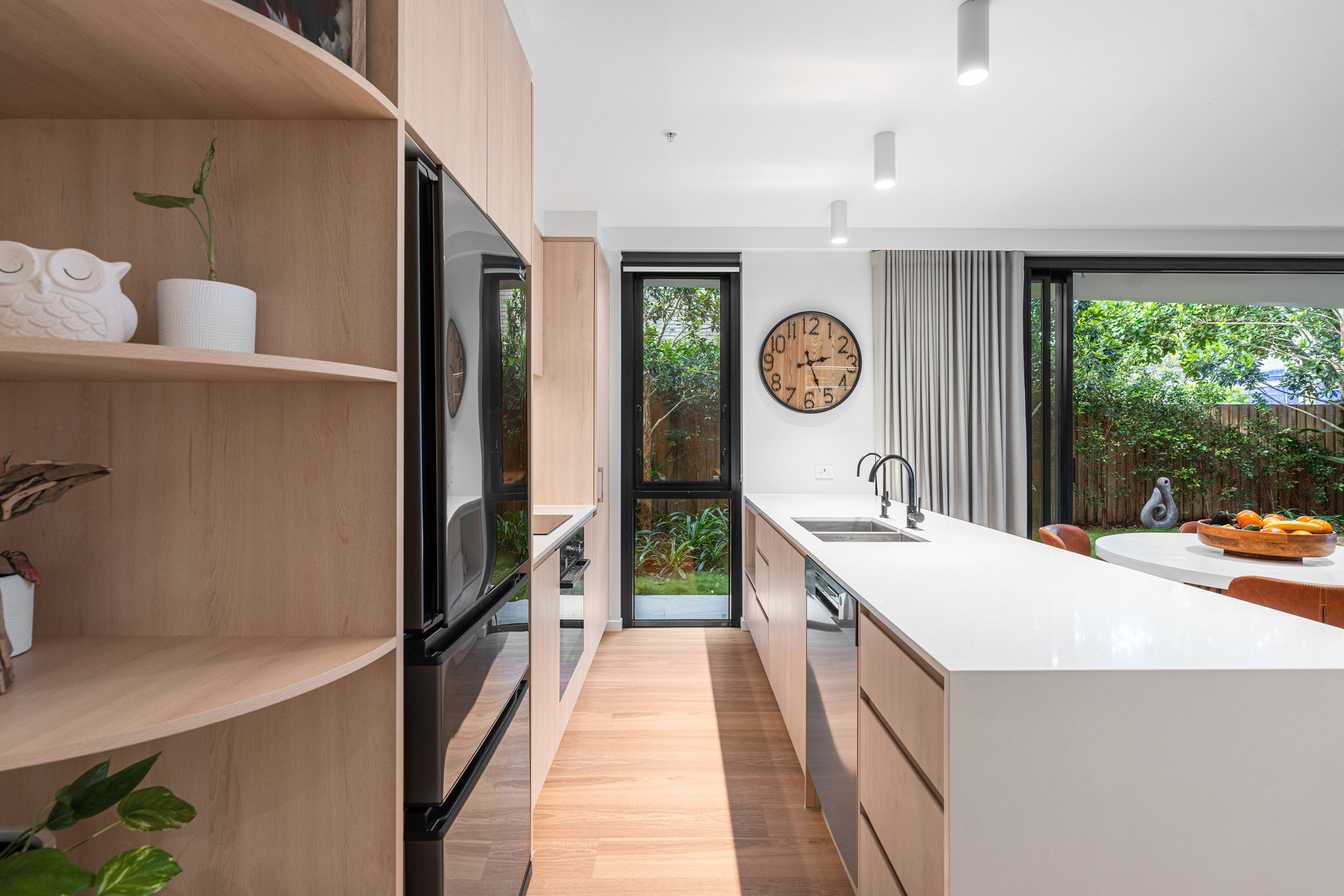 • Modern kitchen with stone waterfall benchtops, integrated appliances, and abundant storage