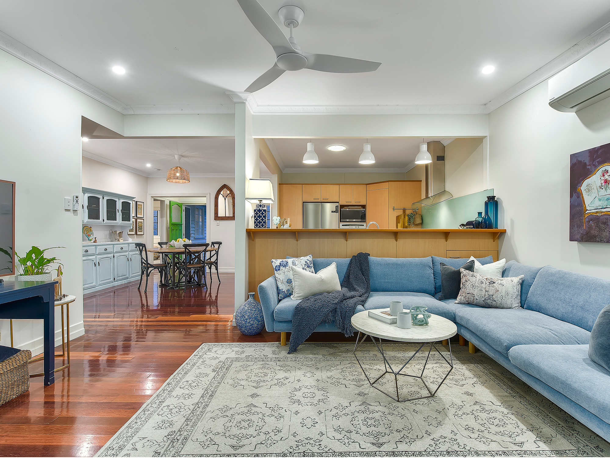 • Open-plan living and dining with polished timber floors and ornate cornicing