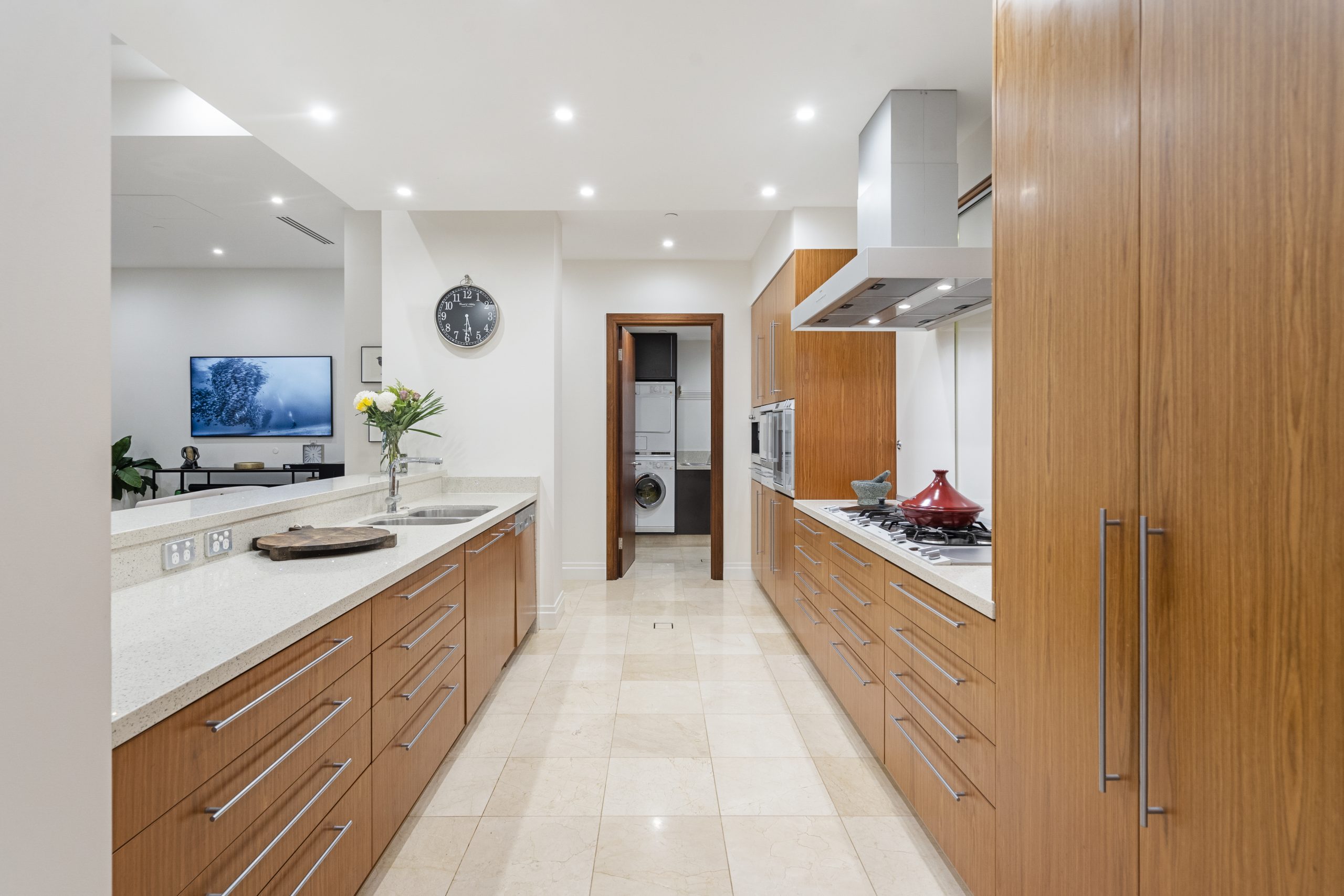 Upon entry to apartment 1011, it is immediately apparent the level of unsurpassed luxury this property offers. The home features a modern, open planned design with a vast lounge, dining and kitchen space. The gourmet kitchen is perfect for any home chef, complete with the highest quality Gaggenau appliances, a large central breakfast bar, gas cooktop, striking timber cabinetry, stone benchtops and laundry connected to the kitchen which provides additional storage options. The immense floorplan offers separation between dining and living spaces with a partition wall complete with gas fireplace. The oversized glass stacking doors provide a seamless flow between indoor and outdoor living and connect the two spaces impeccably. The outdoor terrace has been designed to absolute perfection, with several living and dining spaces, wrap-around terrace, private heated plunge pool with spa functionality and pristine views that cannot be built out. The 241sqm of external living is an unrivalled space for entertaining guests and can cater for any occasion.