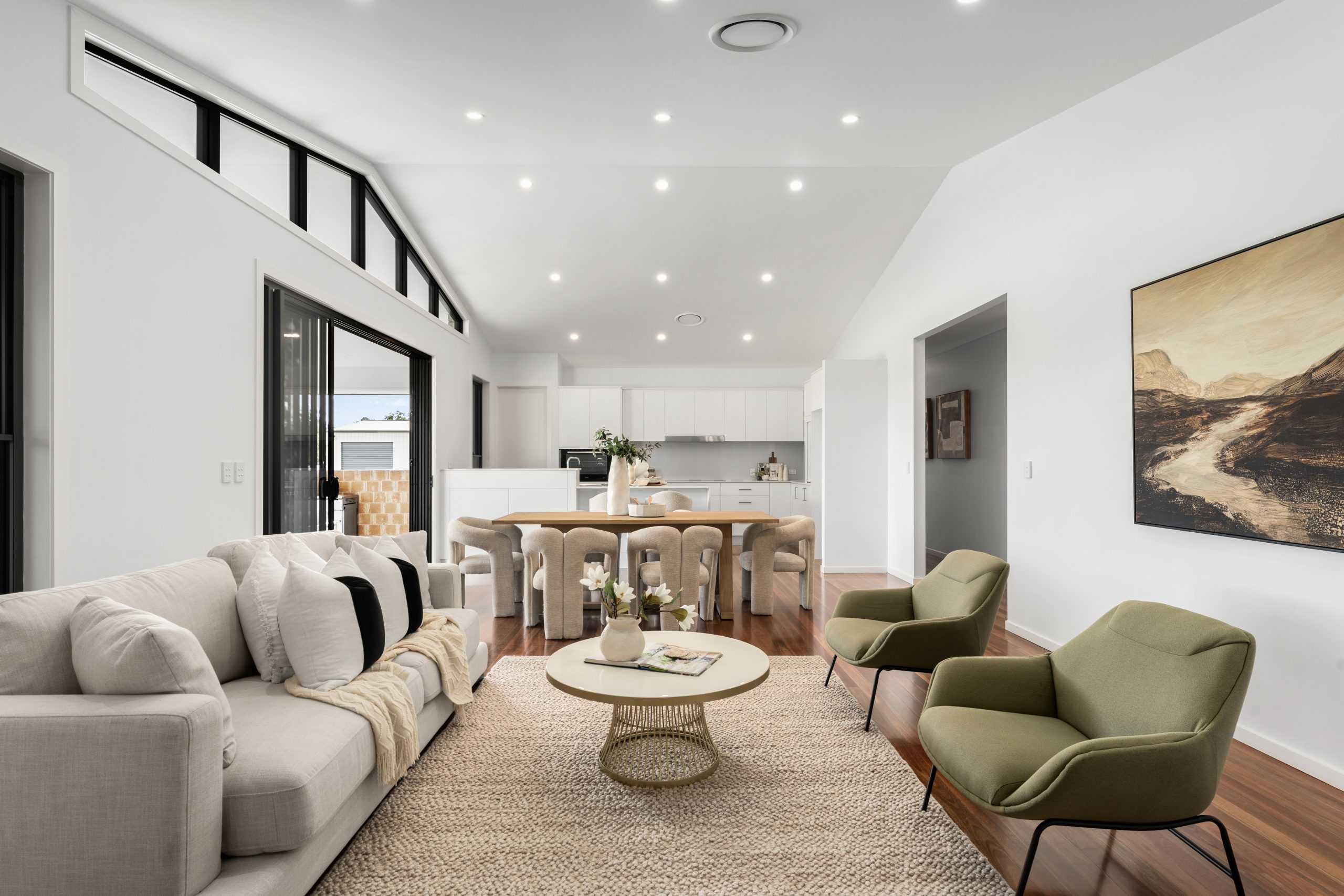 – Open-plan living with raked ceilings creating a sense of space and natural light