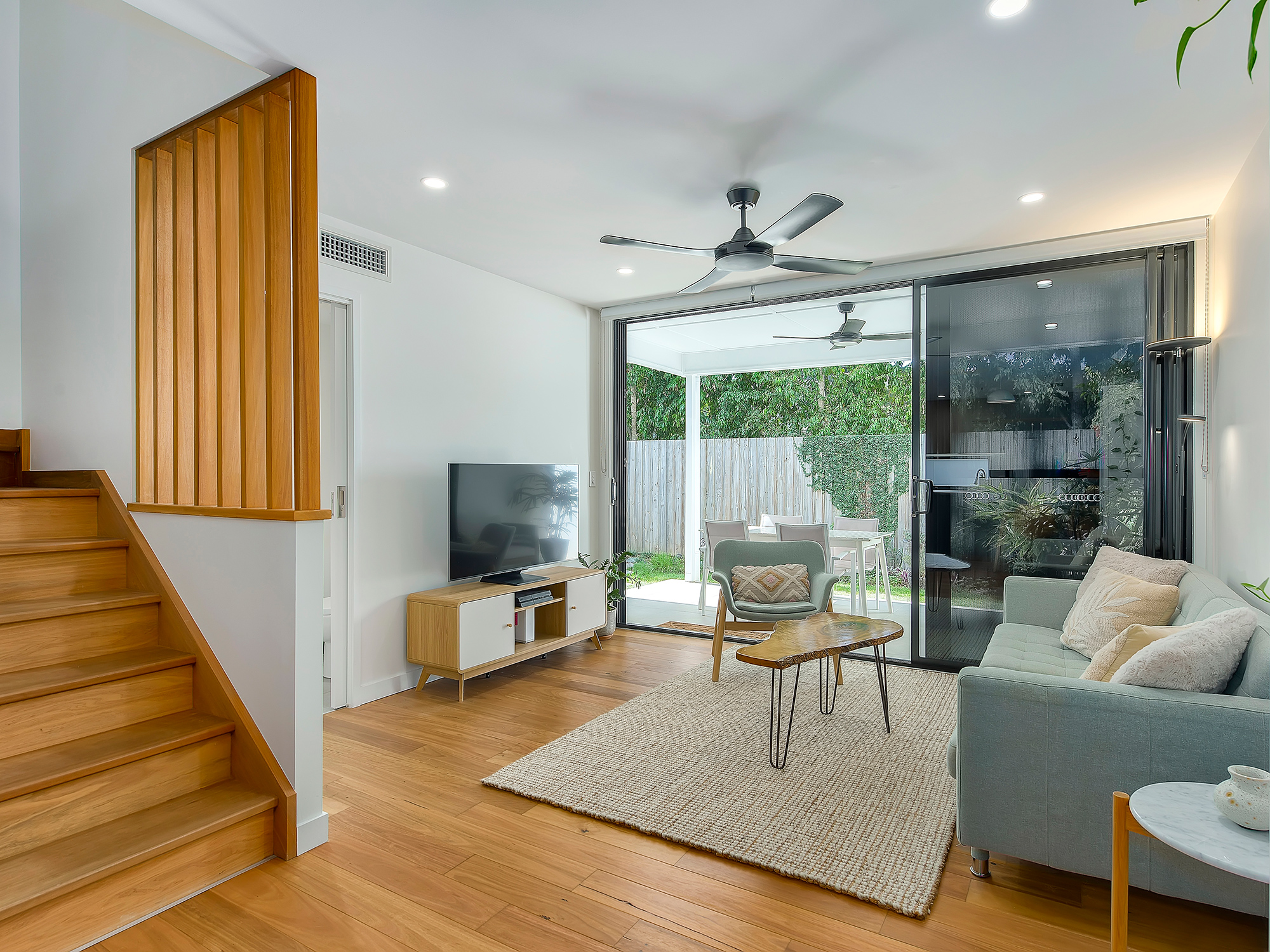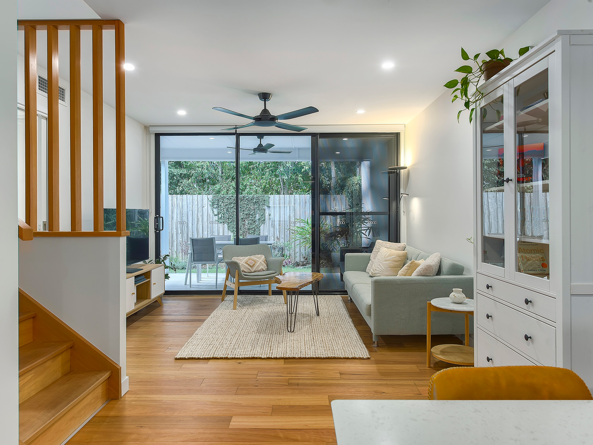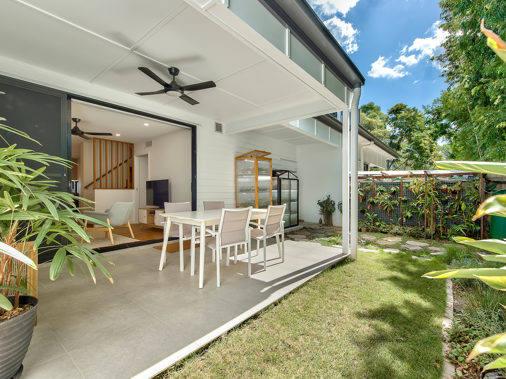 The living space extends to a covered, tiled terrace that is private, inviting, and perfectly oriented to capture soft morning sun while remaining protected from wind and afternoon heat. The generous backyard enjoys a leafy outlook with no road noise, offering privacy and easy-care outdoor living with room to garden or unwind.