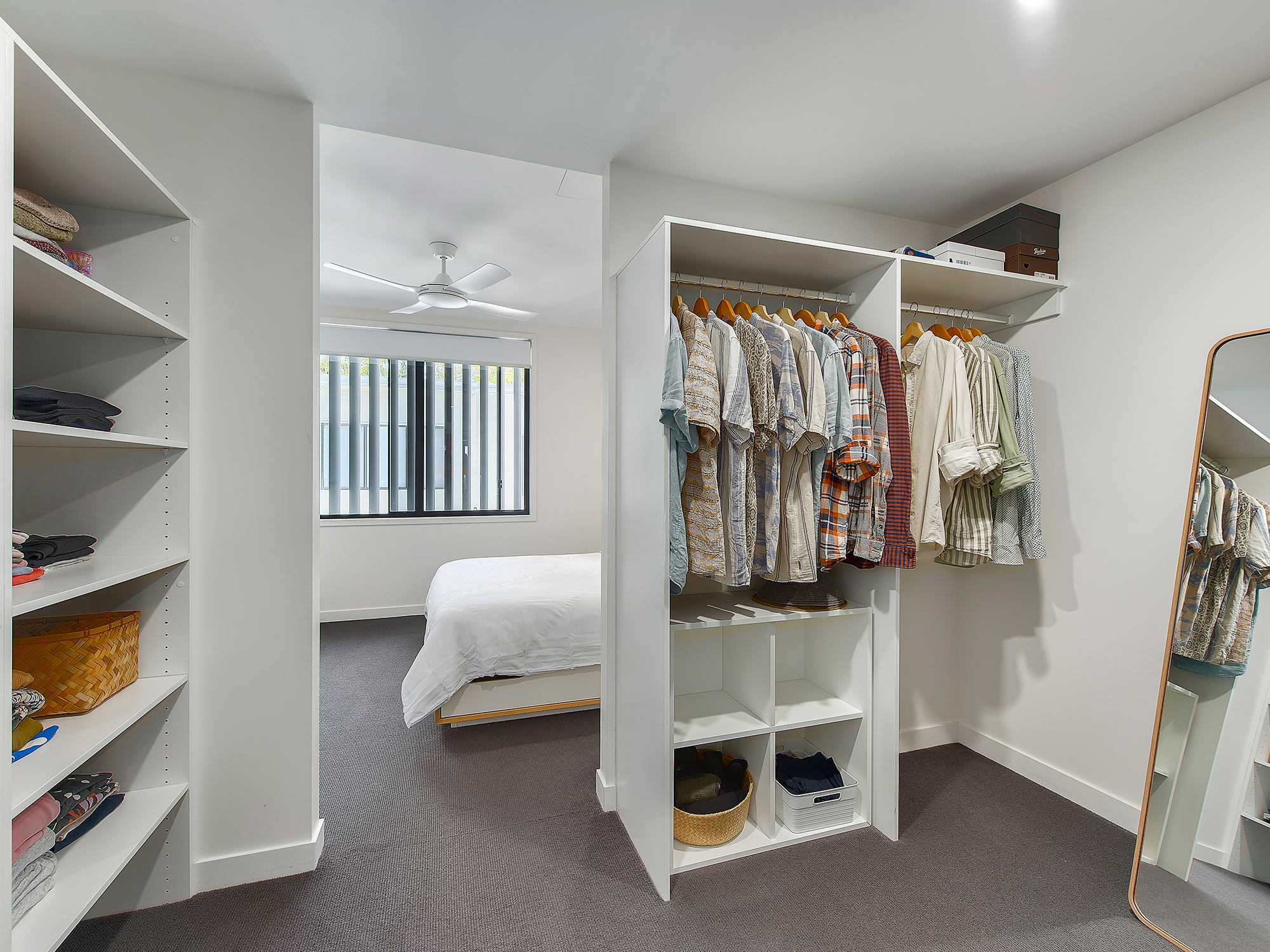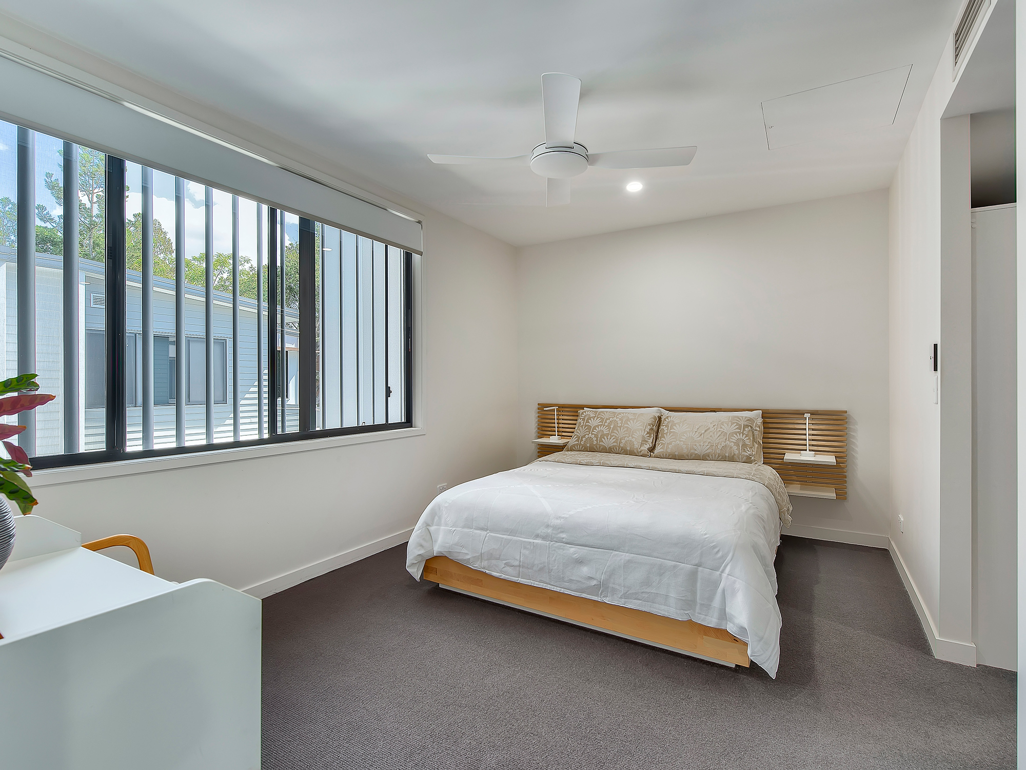 • Three bedrooms with built-ins, ceiling fans, and plush carpet