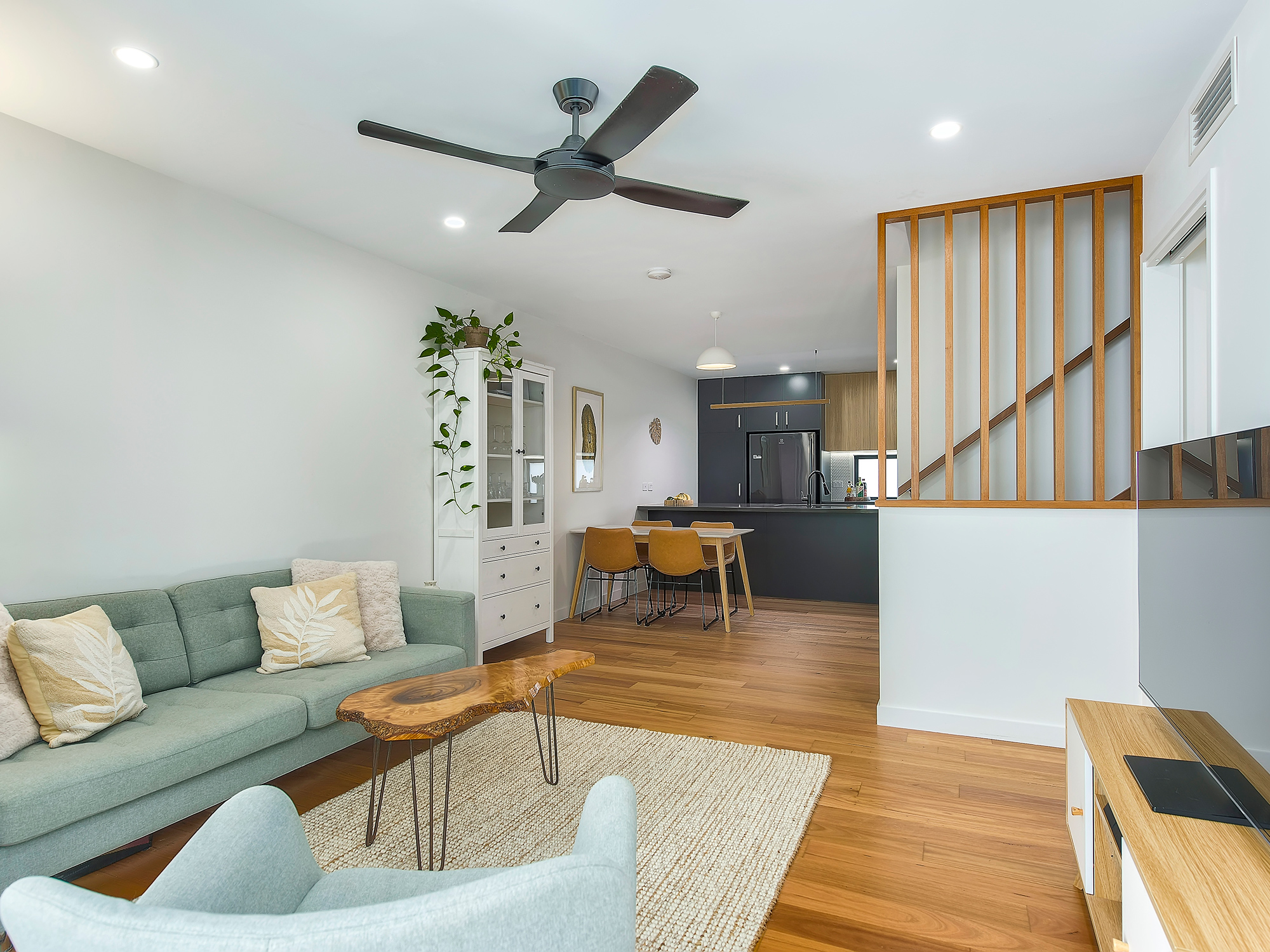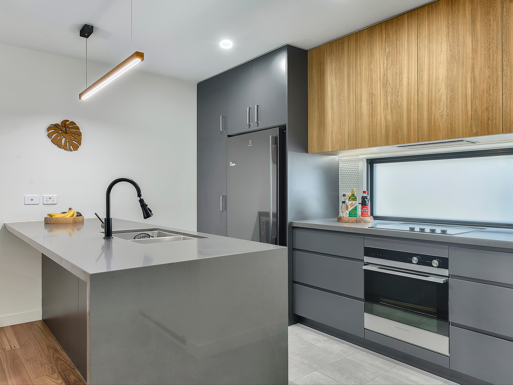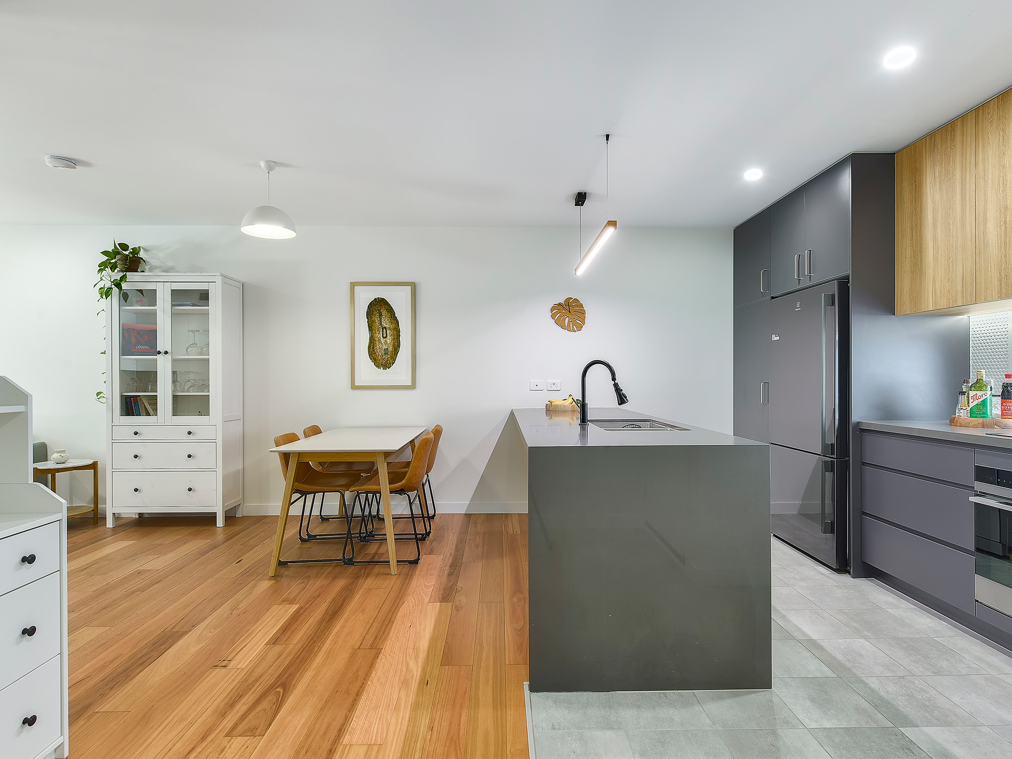 A sophisticated interior welcomes you with a crisp modern palette, timber flooring, and abundant natural light. Open-plan living and dining flow seamlessly to a sleek contemporary kitchen, featuring streamlined joinery, premium appliances, and a waterfall stone island that combines function with statement design. Timber accents, pendant lighting, and penny tiling add depth and visual appeal.