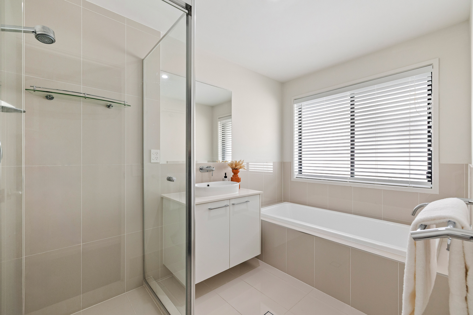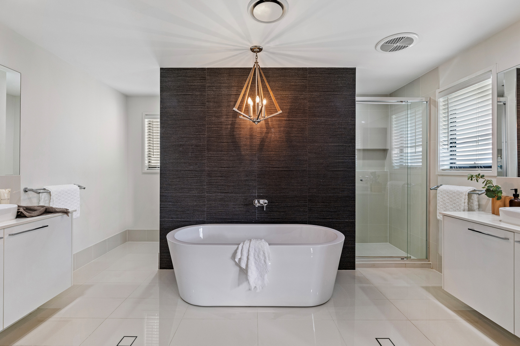 Accommodation comprises four well-appointed bedrooms, headlined by a truly exceptional master suite. The ensuite is a standout feature of the home – luxuriously designed with a freestanding bathtub positioned beneath a statement chandelier, creating a hotel-like atmosphere. A cleverly designed layout places the shower and toilet discreetly behind a feature wall, while dual vanities offer a refined sense of space and privacy. Additional features include under-stair storage, high-quality finishes throughout, and a considered floorplan that balances both functionality and elegance.