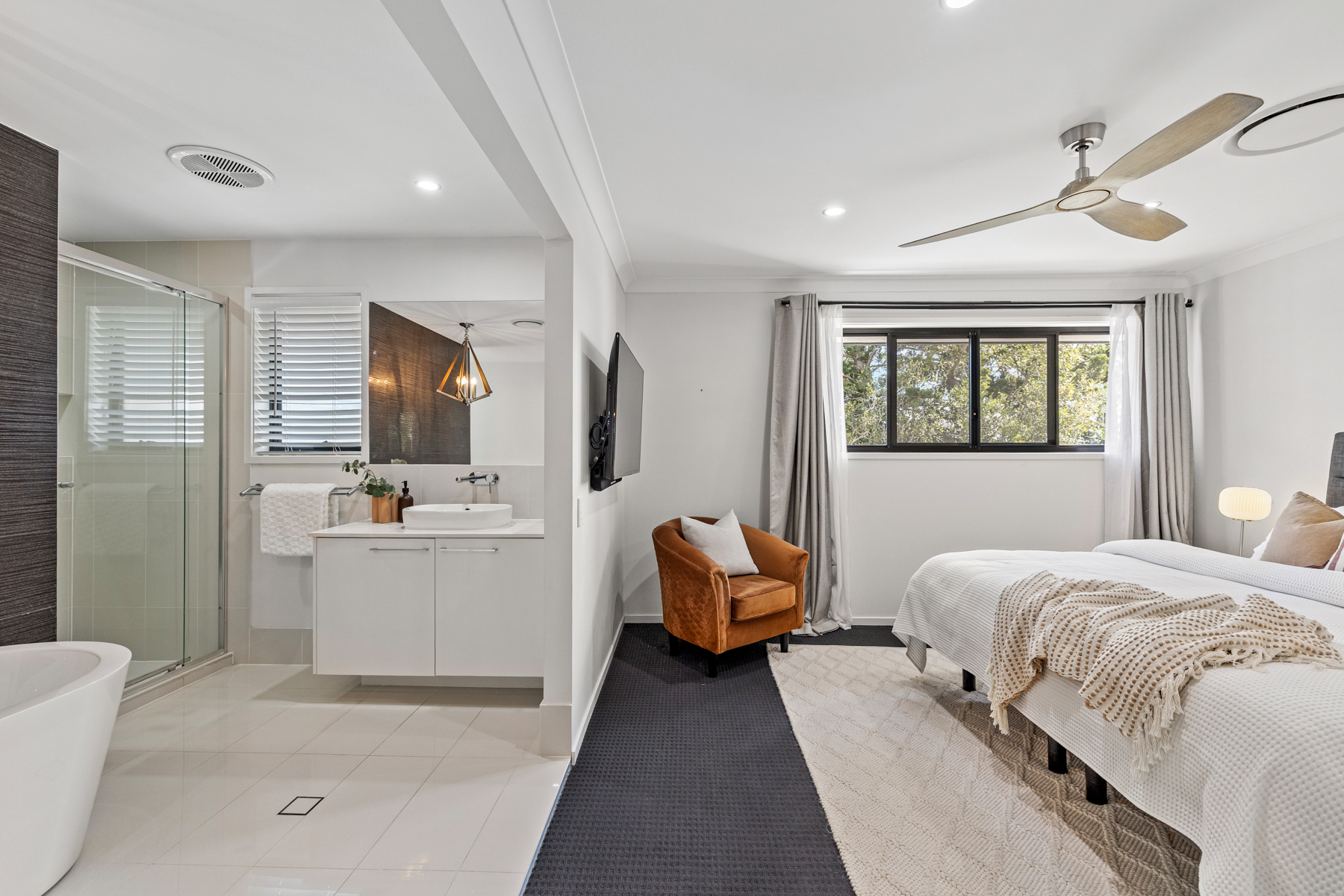 Luxurious master suite with a true show-stopping ensuite featuring free-standing bath tub with pendant lighting