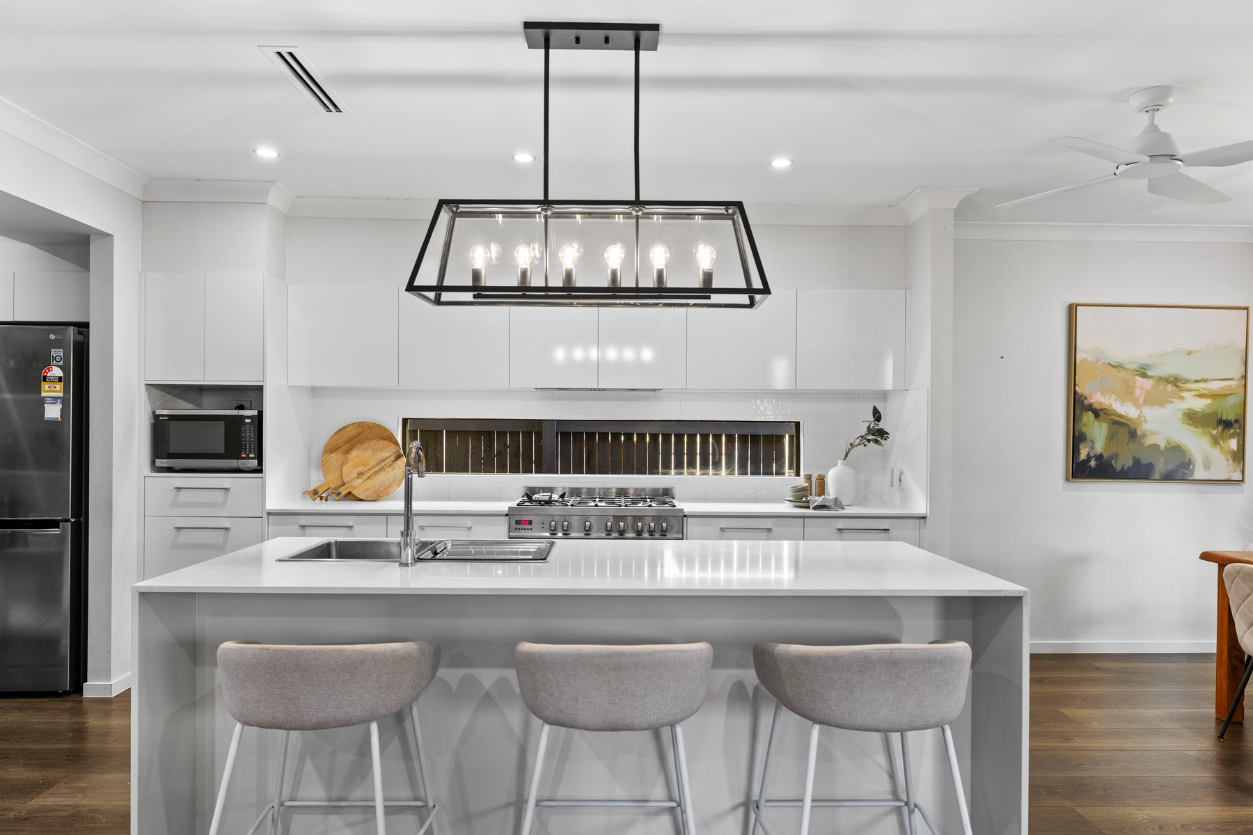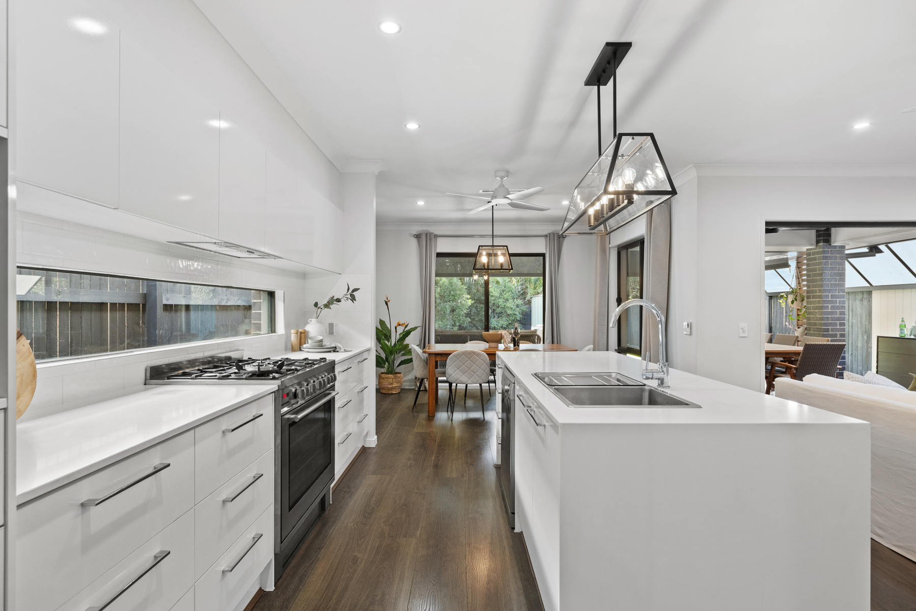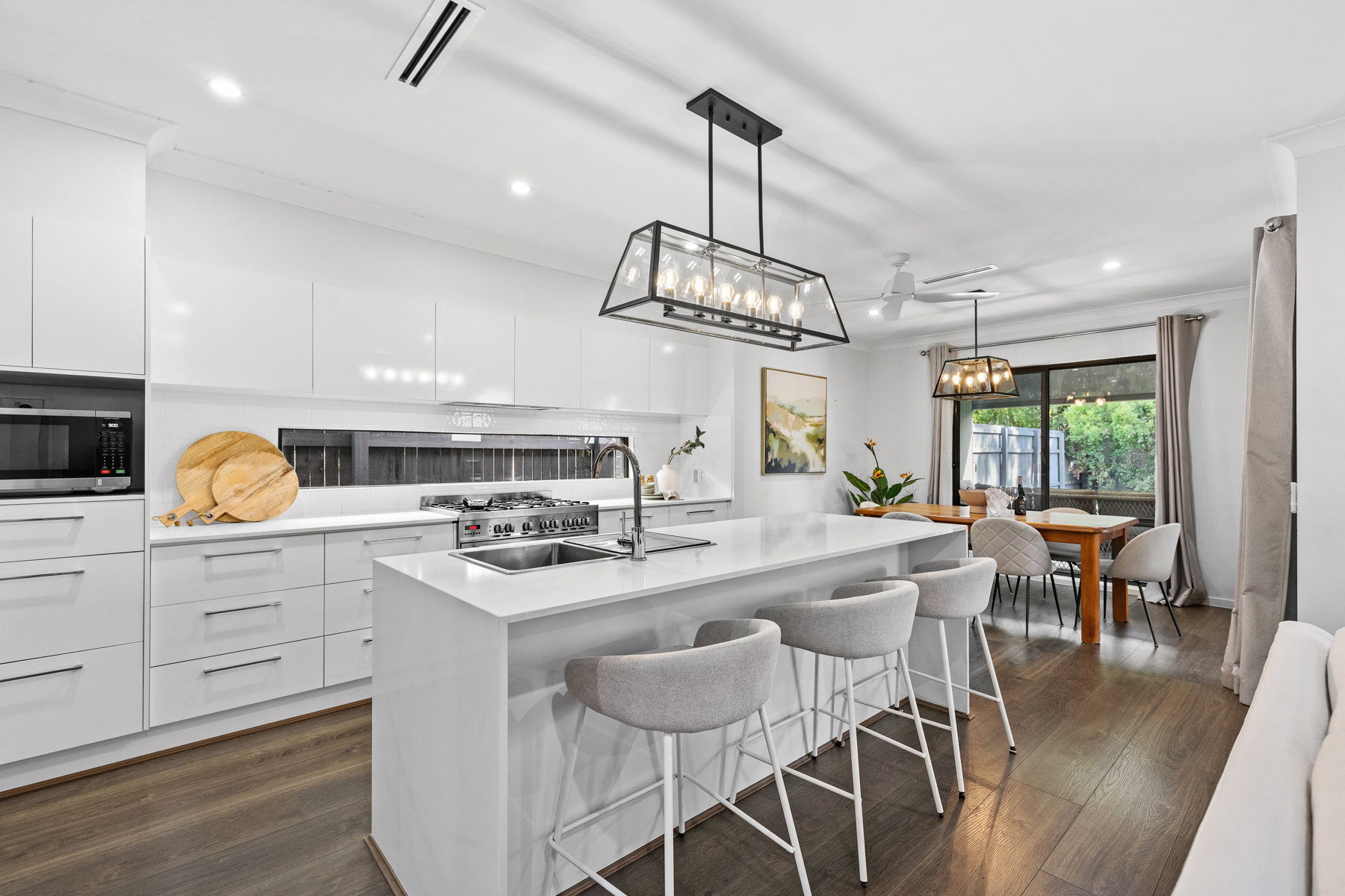 At the heart of the home lies a sophisticated open-plan living zone, where the kitchen, dining, and main living areas are effortlessly connected. The designer kitchen is both functional and elegant, complete with a butler’s pantry and dedicated laundry, creating a streamlined and highly practical workspace. Feature pendant lighting over the island bench adds a touch of warmth and style.