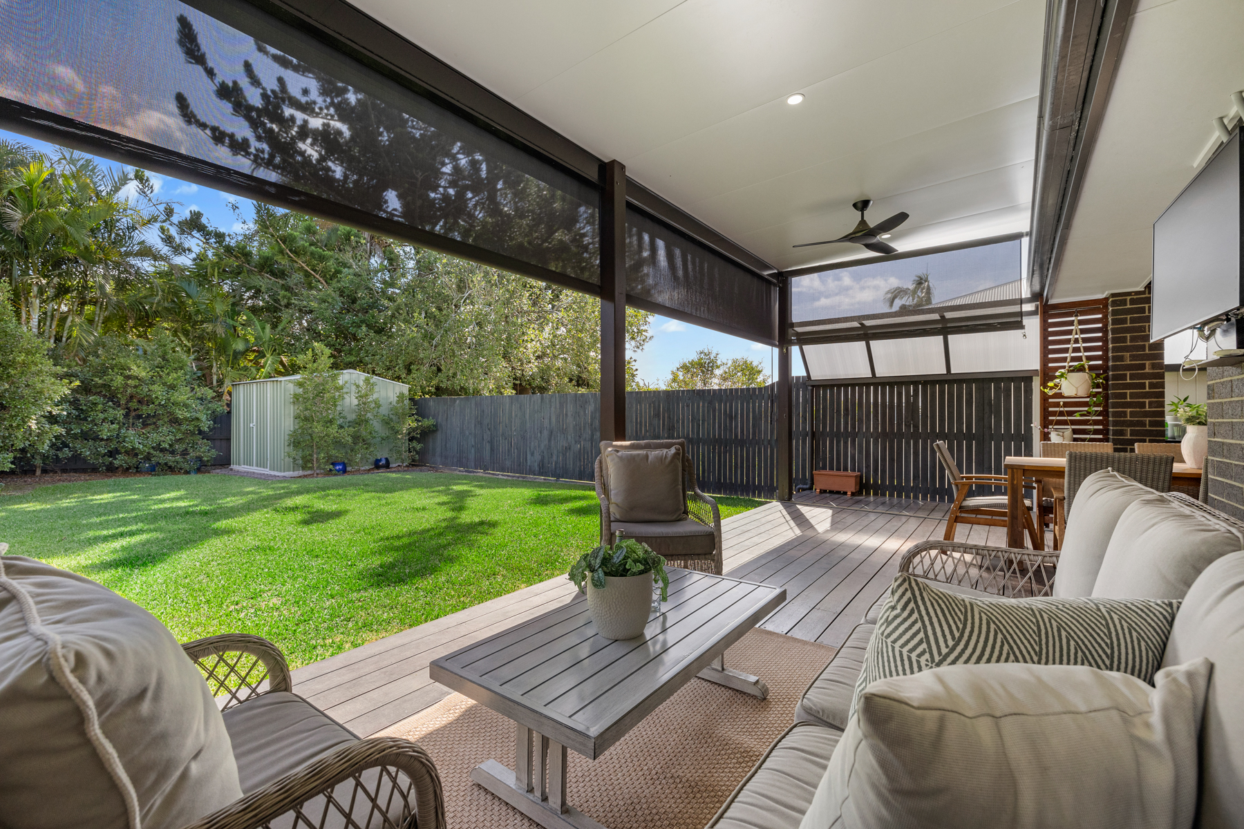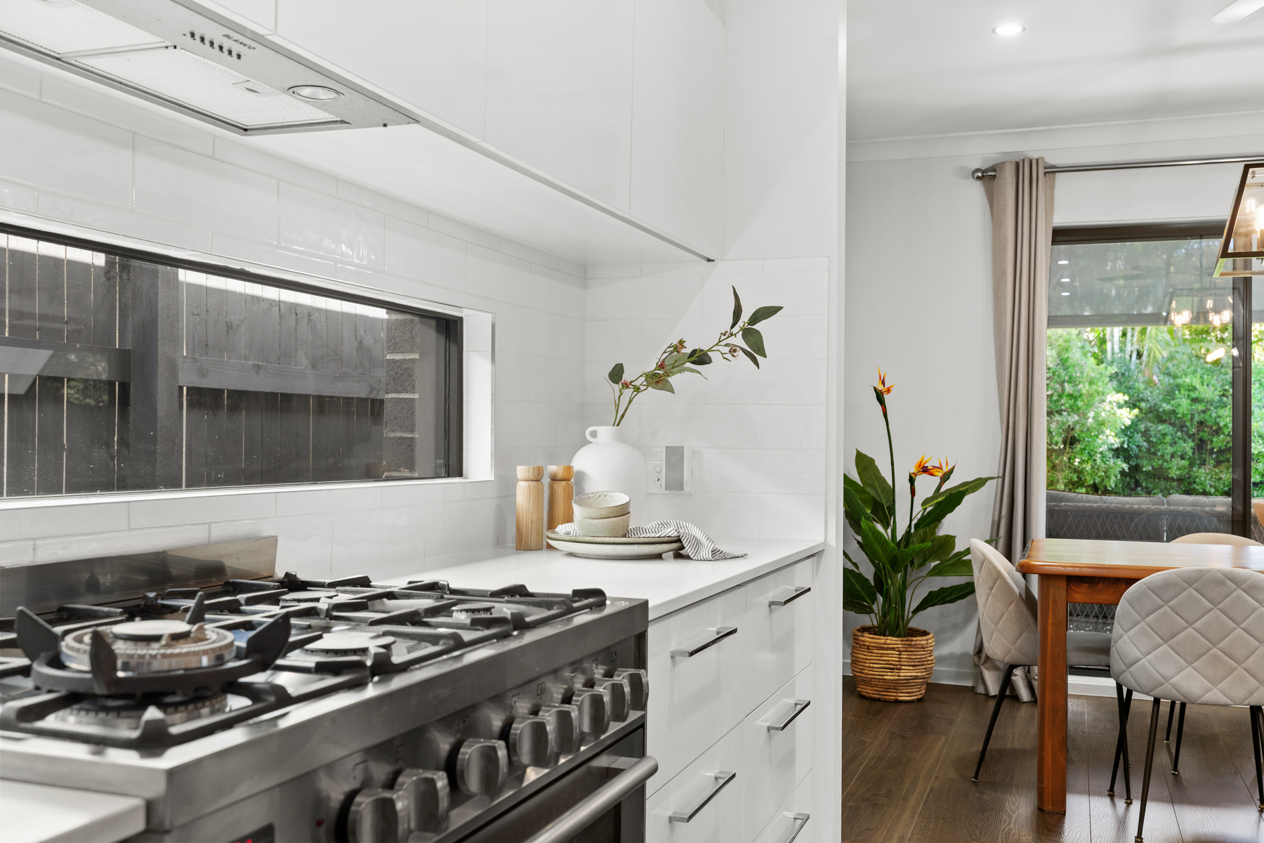 Flowing seamlessly from the main living area is the outdoor entertaining space, complete with an outdoor built-in BBQ – perfect for hosting gatherings while overlooking the private, low-maintenance backyard framed by a beautiful leafy outlook.