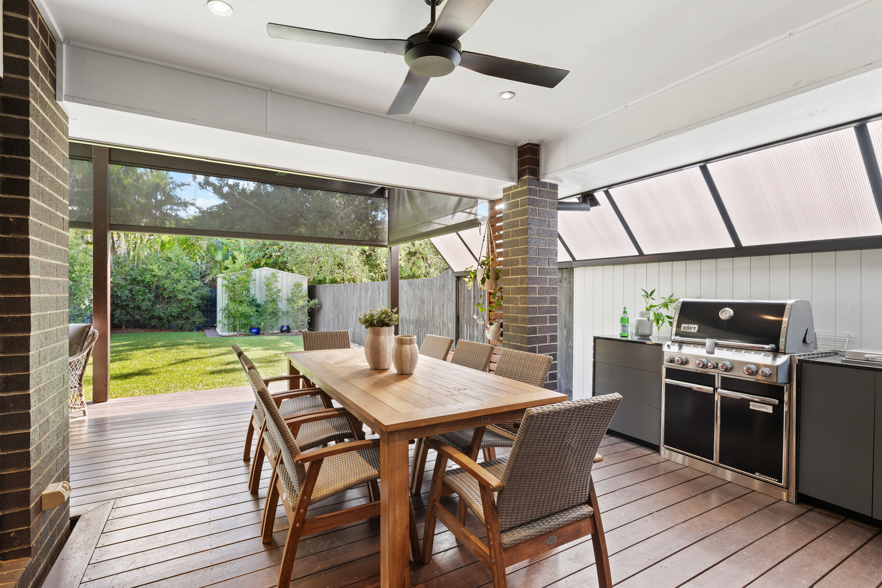 Outdoor BBQ with built-in cabinetry and entertaining area overlooking a leafy, low-maintenance backyard