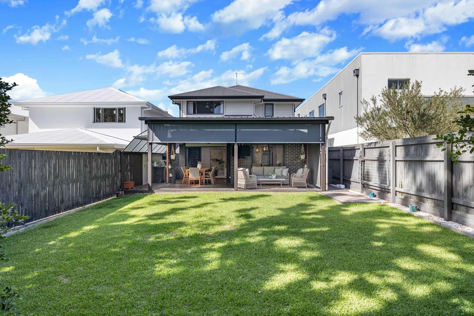 Multiple living zones provide flexibility for modern family living, including a dedicated media room on the lower level and an additional upstairs retreat that opens onto a balcony capturing glimpses towards the Gabba – an ideal space to unwind or entertain.