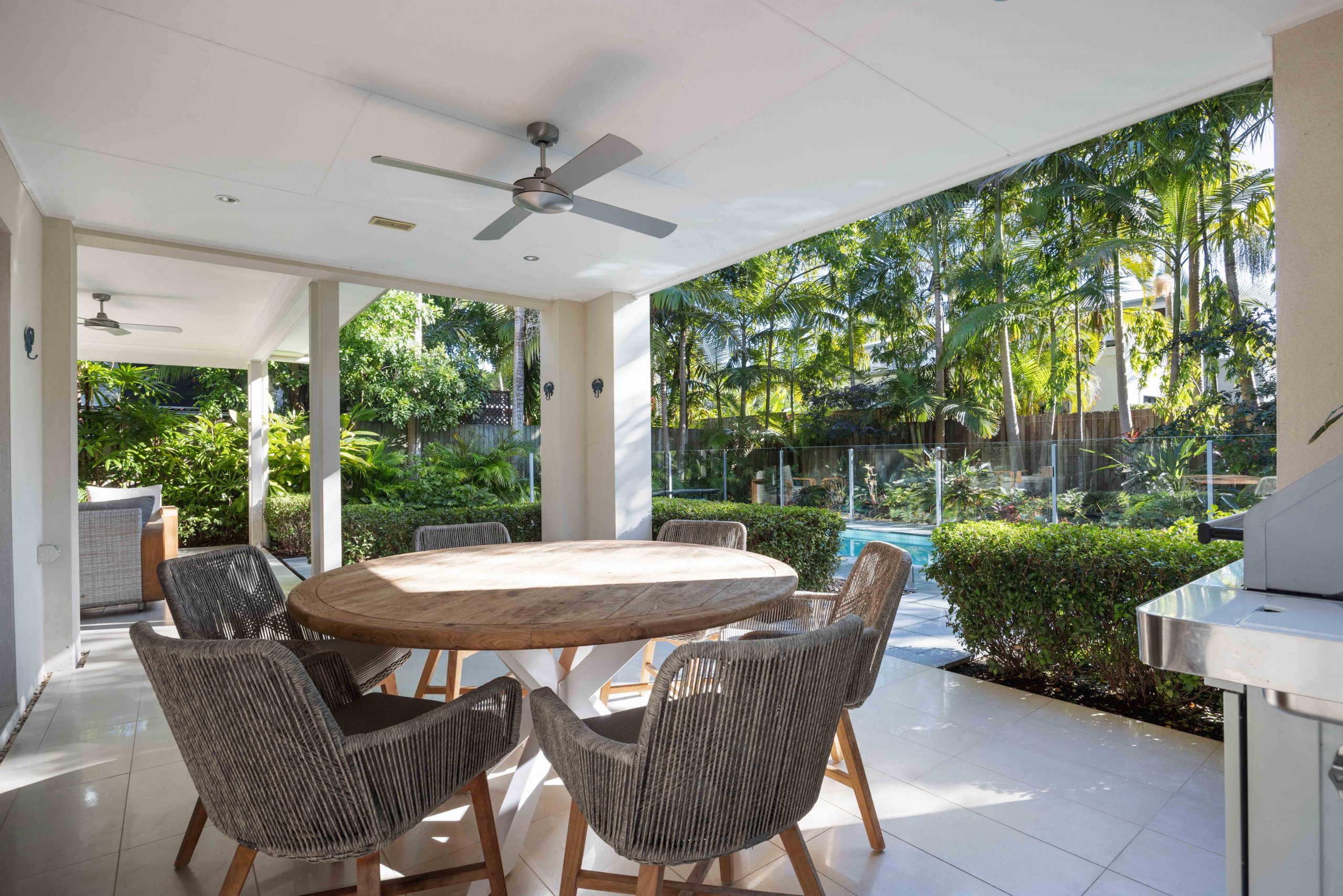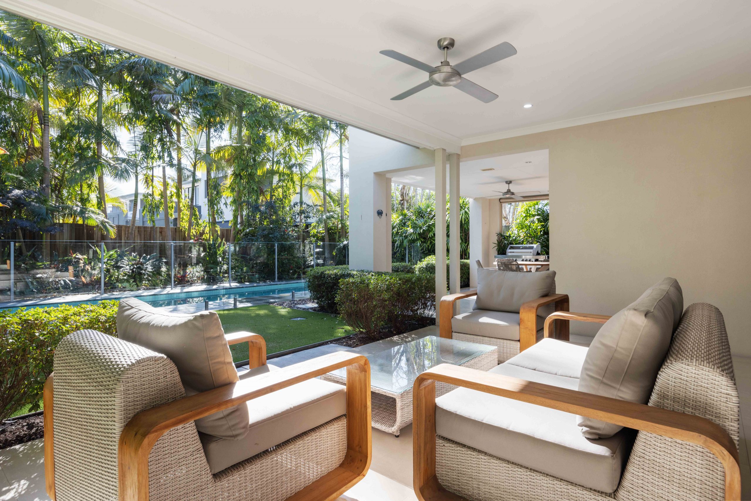 Outside, the covered alfresco areas extend both living and dining into the fresh air and provide the perfect backdrop for year round entertaining by the resort style heated pool. This area offers an extraordinary private ambience thanks to lush established tropical gardens and a fenced perimeter.