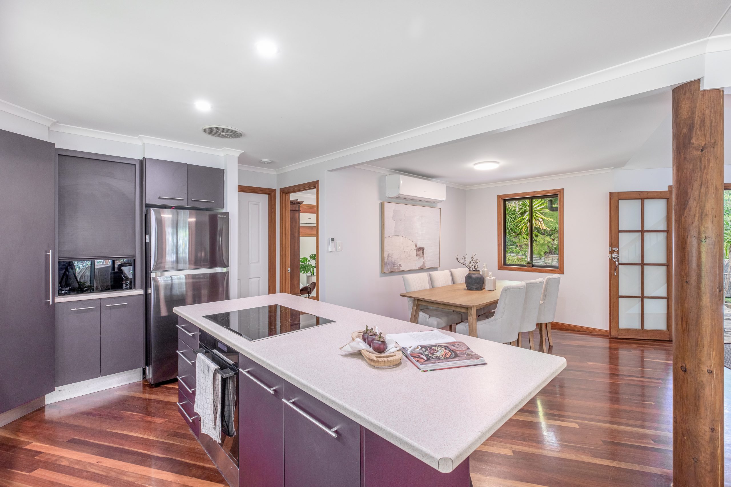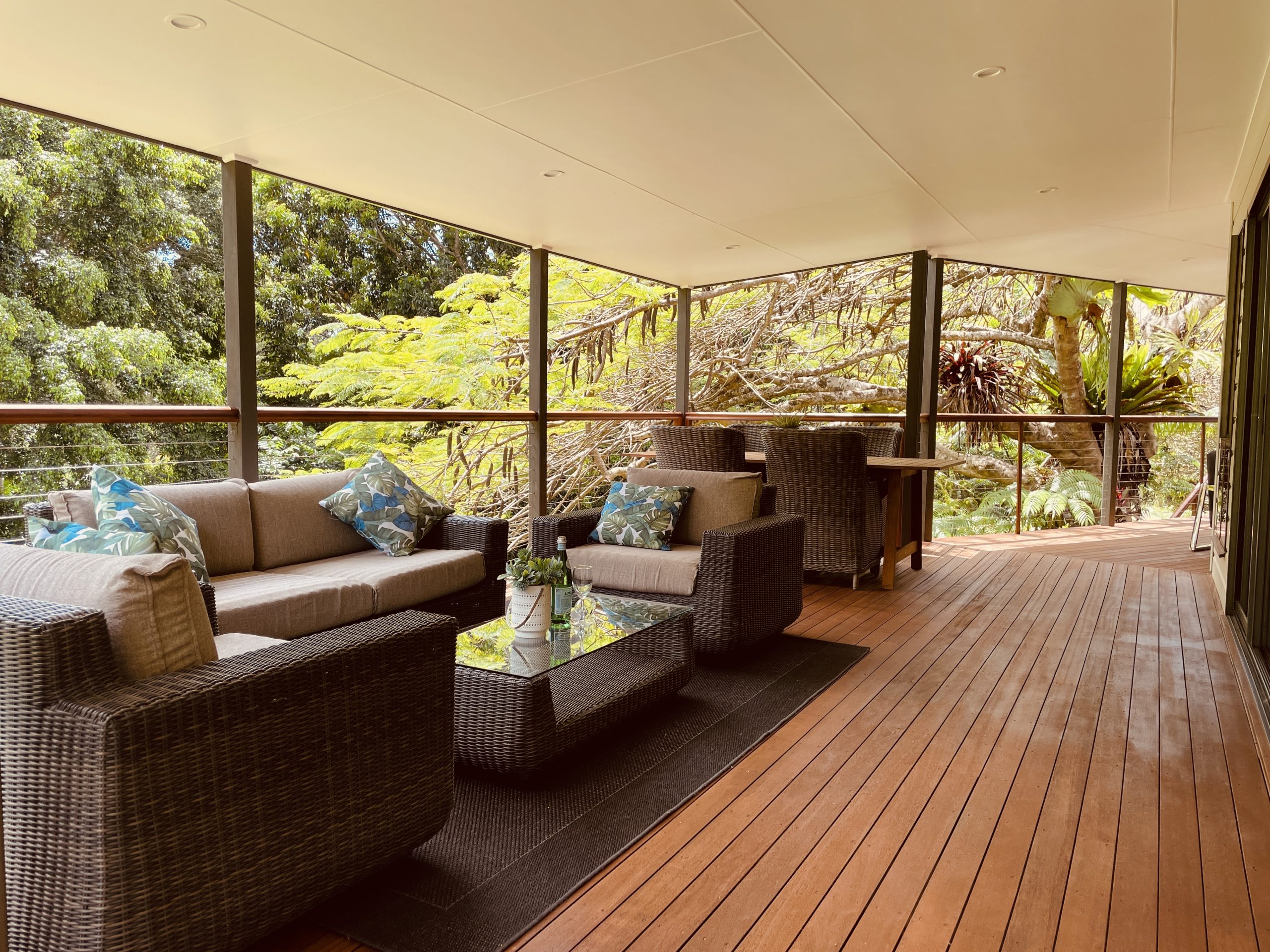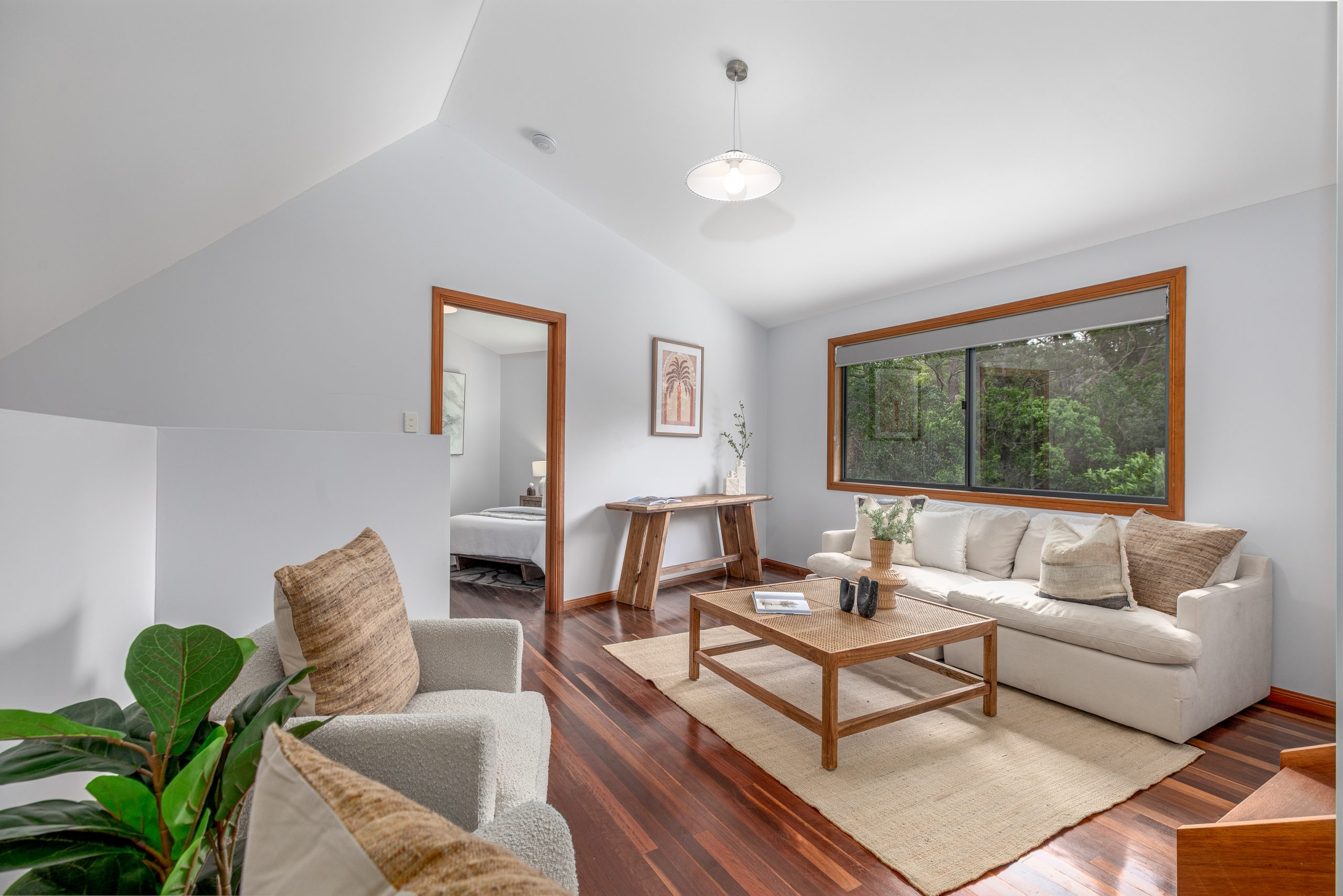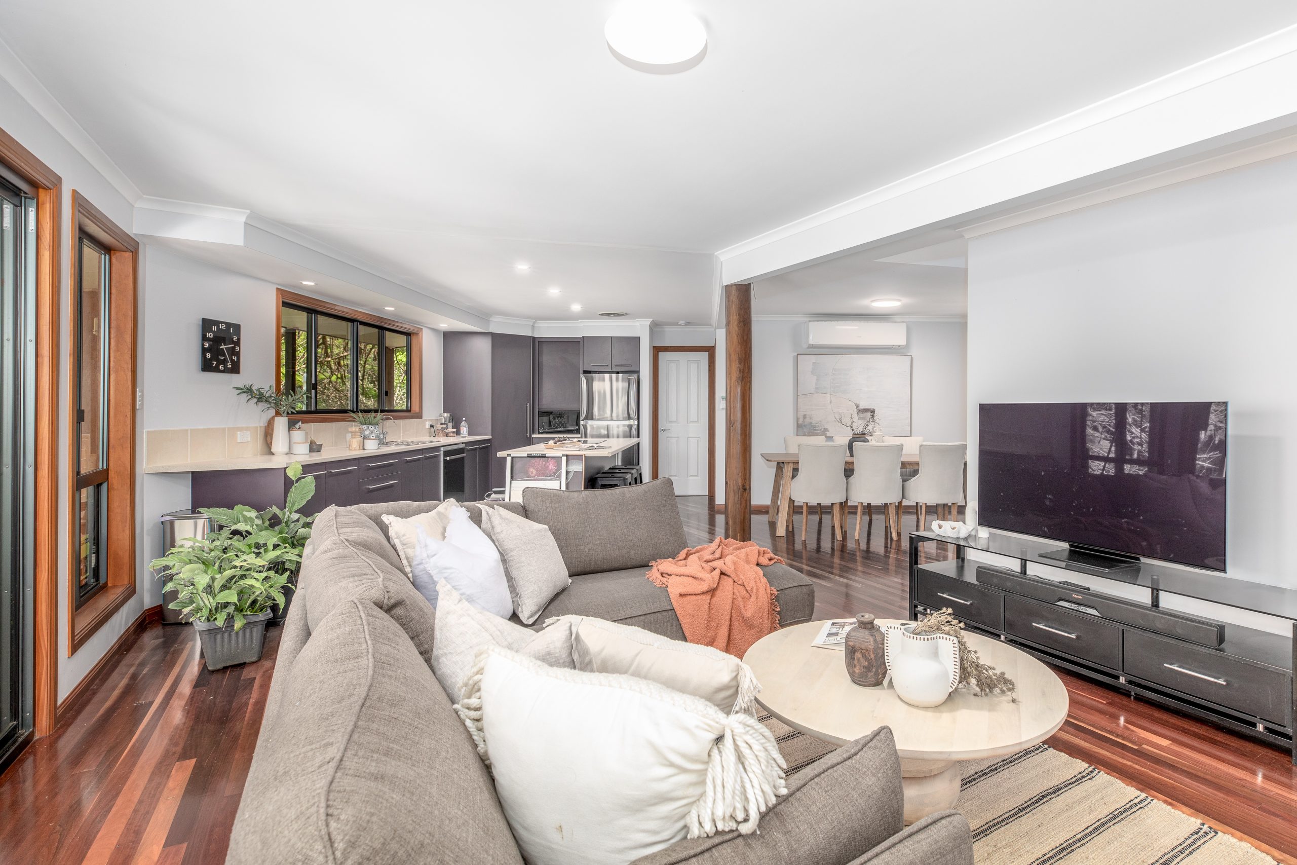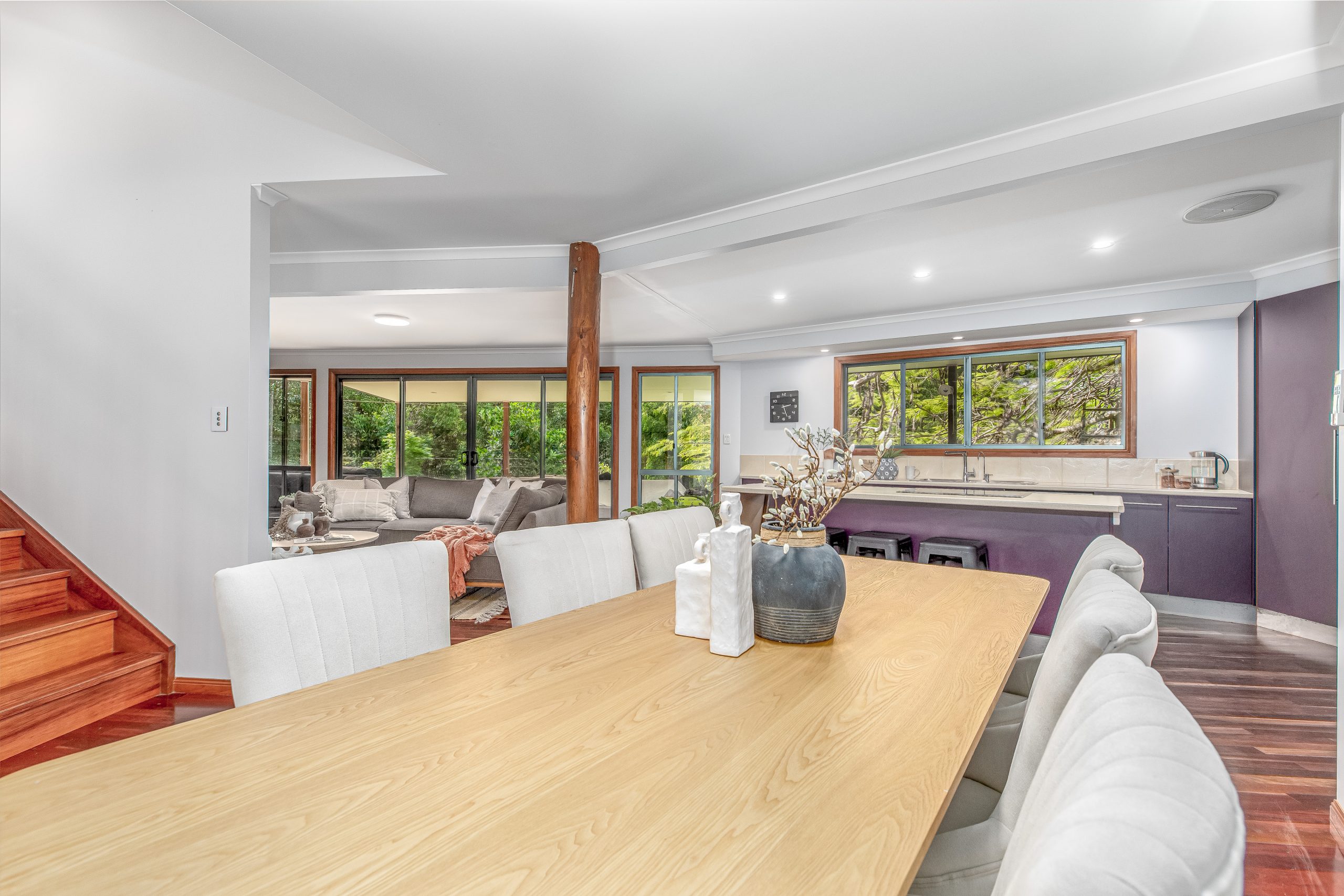 The lounge areas are the heart of this home, featuring polished timber floors that radiate warmth and character. Large windows frame views of the surrounding rainforest, filling the space with natural light and creating a tranquil, airy atmosphere. The rich wood tones contrast beautifully with the lush greenery outside, making the perfect setting for relaxation or entertaining. Whether you’re unwinding by the open plan kitchen or gathering with family and friends, the polished timber floors add a touch of elegance and timeless charm to these inviting spaces.