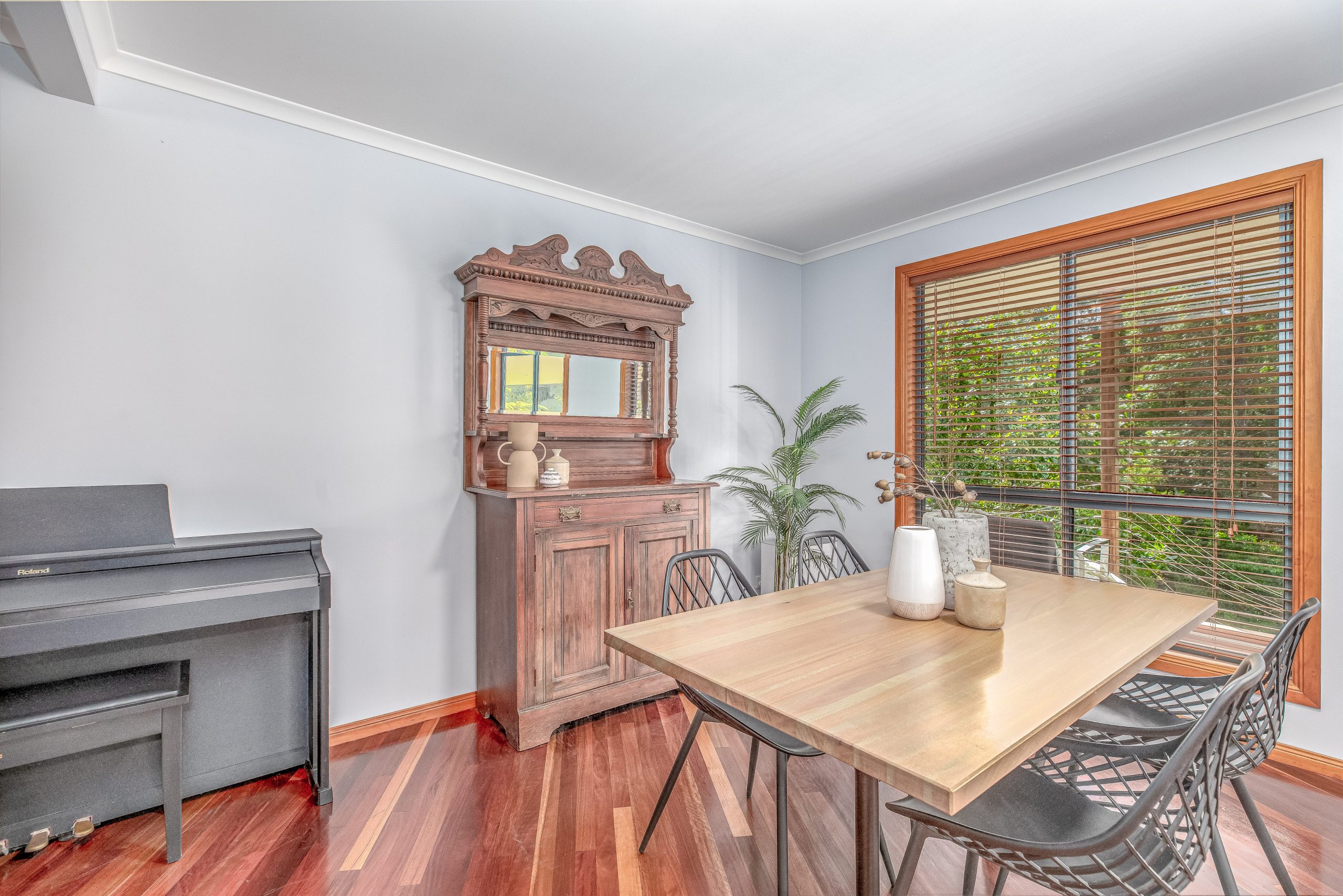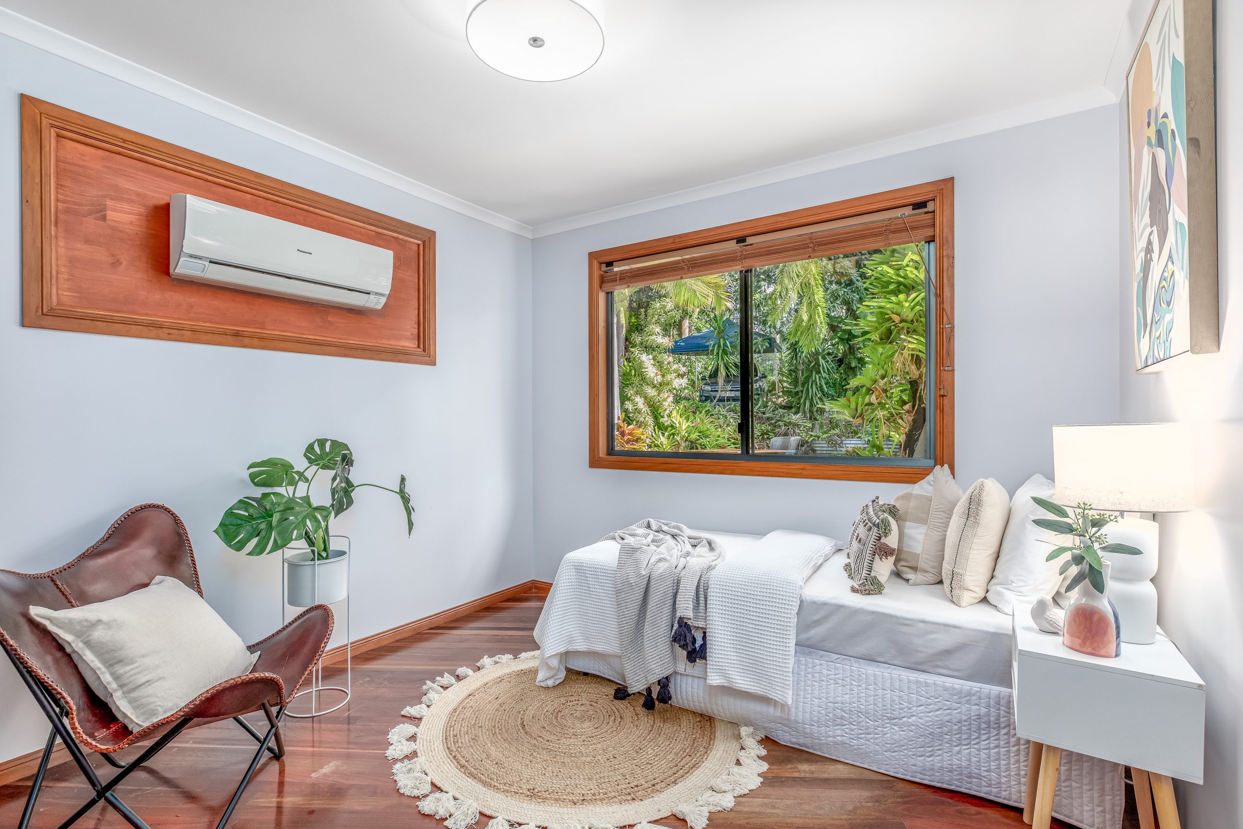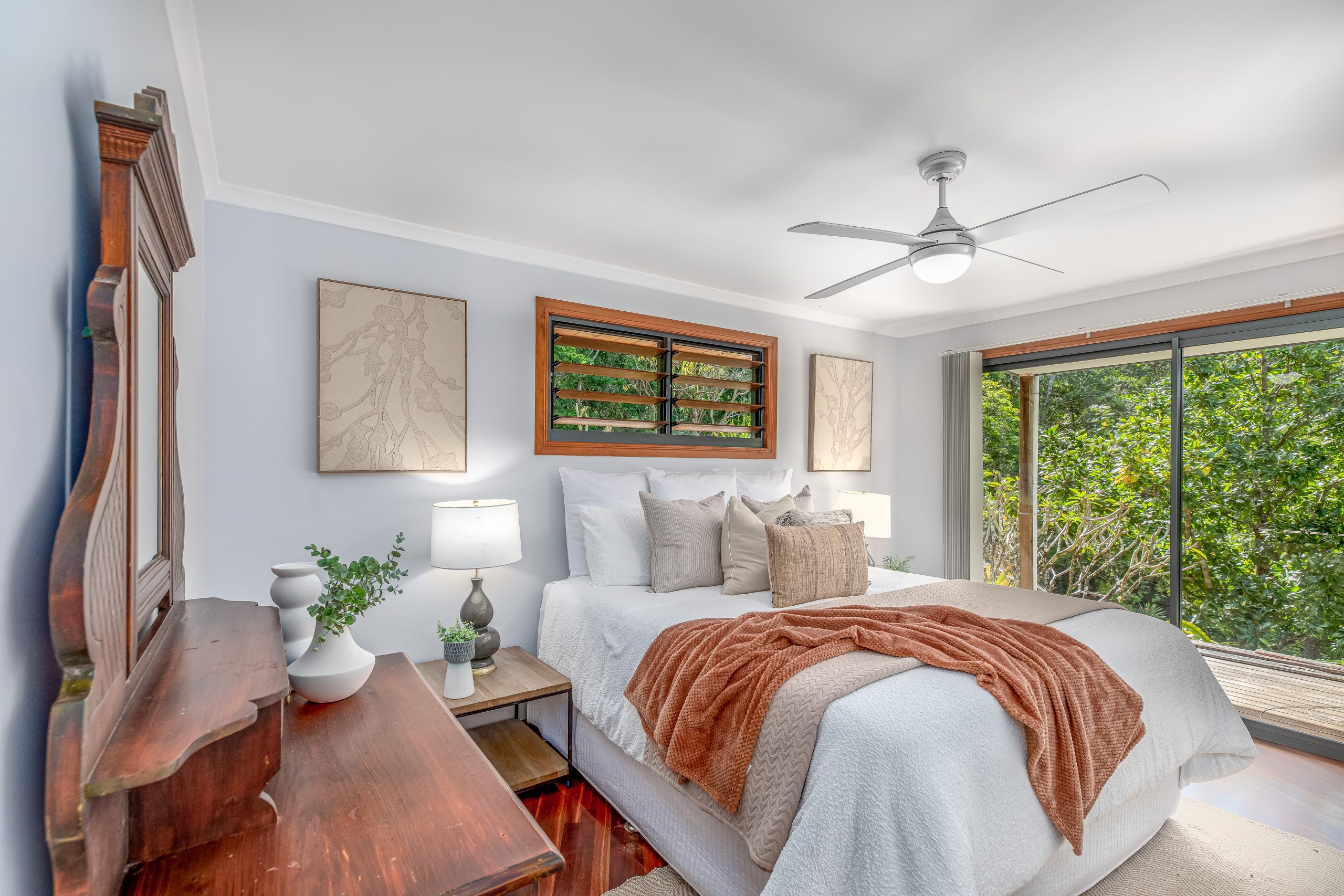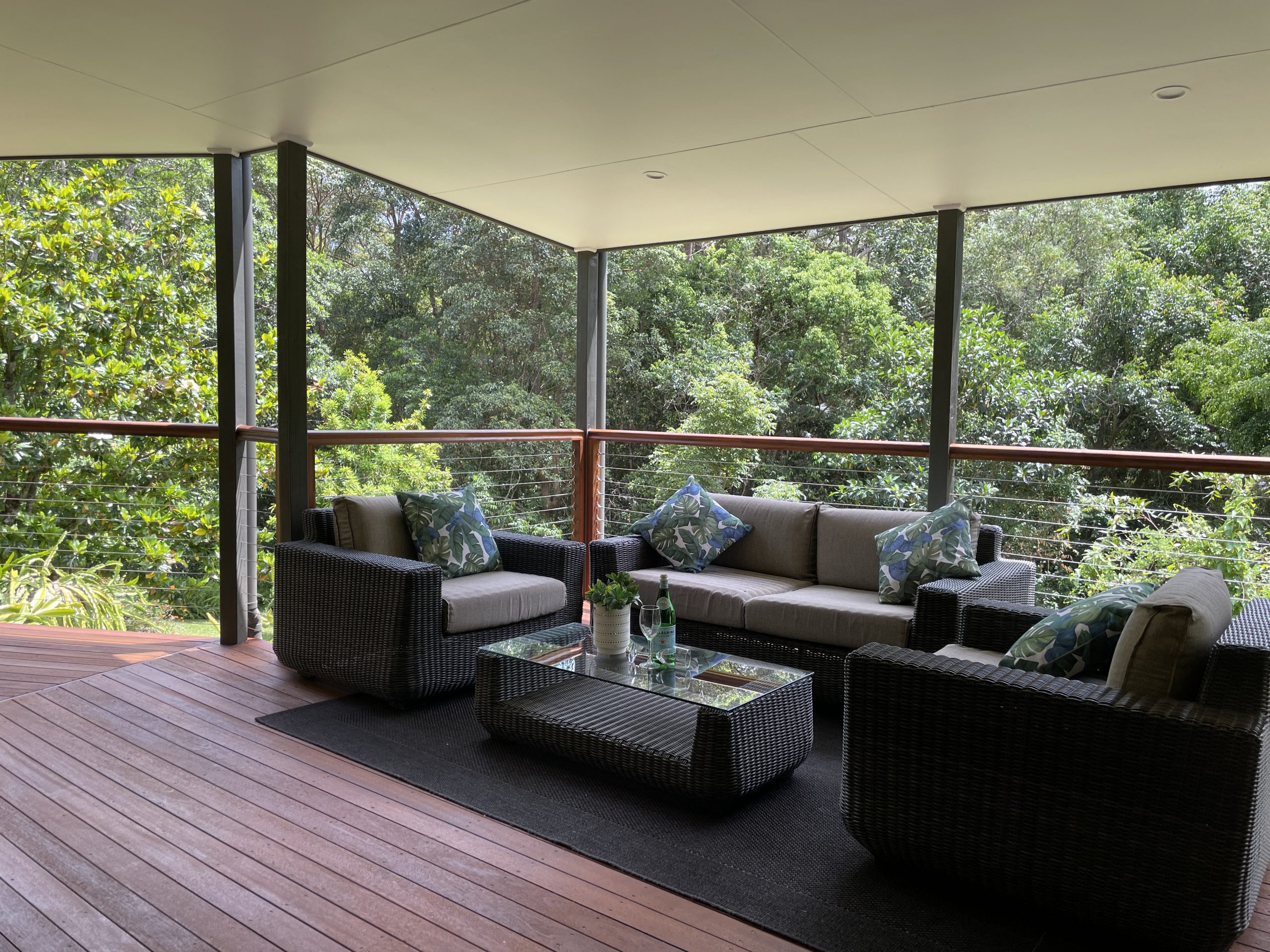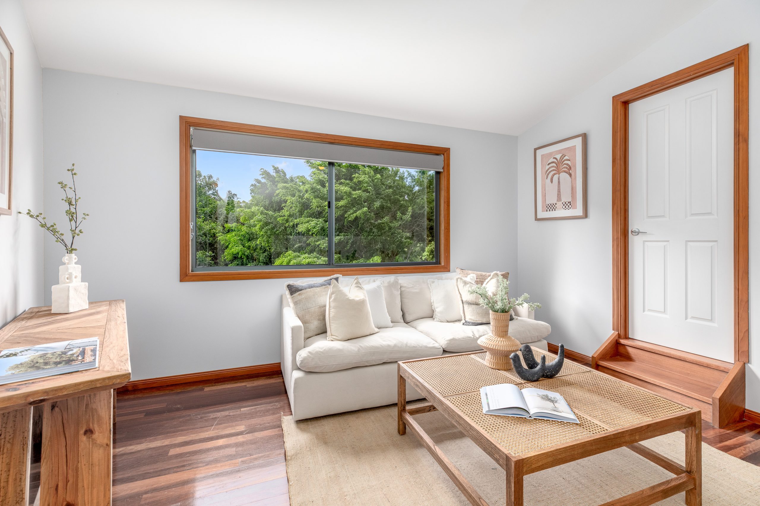 The lounge areas are the heart of this home, featuring polished timber floors that radiate warmth and character. Large windows frame views of the surrounding rainforest, filling the space with natural light and creating a tranquil, airy atmosphere. The rich wood tones contrast beautifully with the lush greenery outside, making the perfect setting for relaxation or entertaining. Whether you’re unwinding by the open plan kitchen or gathering with family and friends, the polished timber floors add a touch of elegance and timeless charm to these inviting spaces.