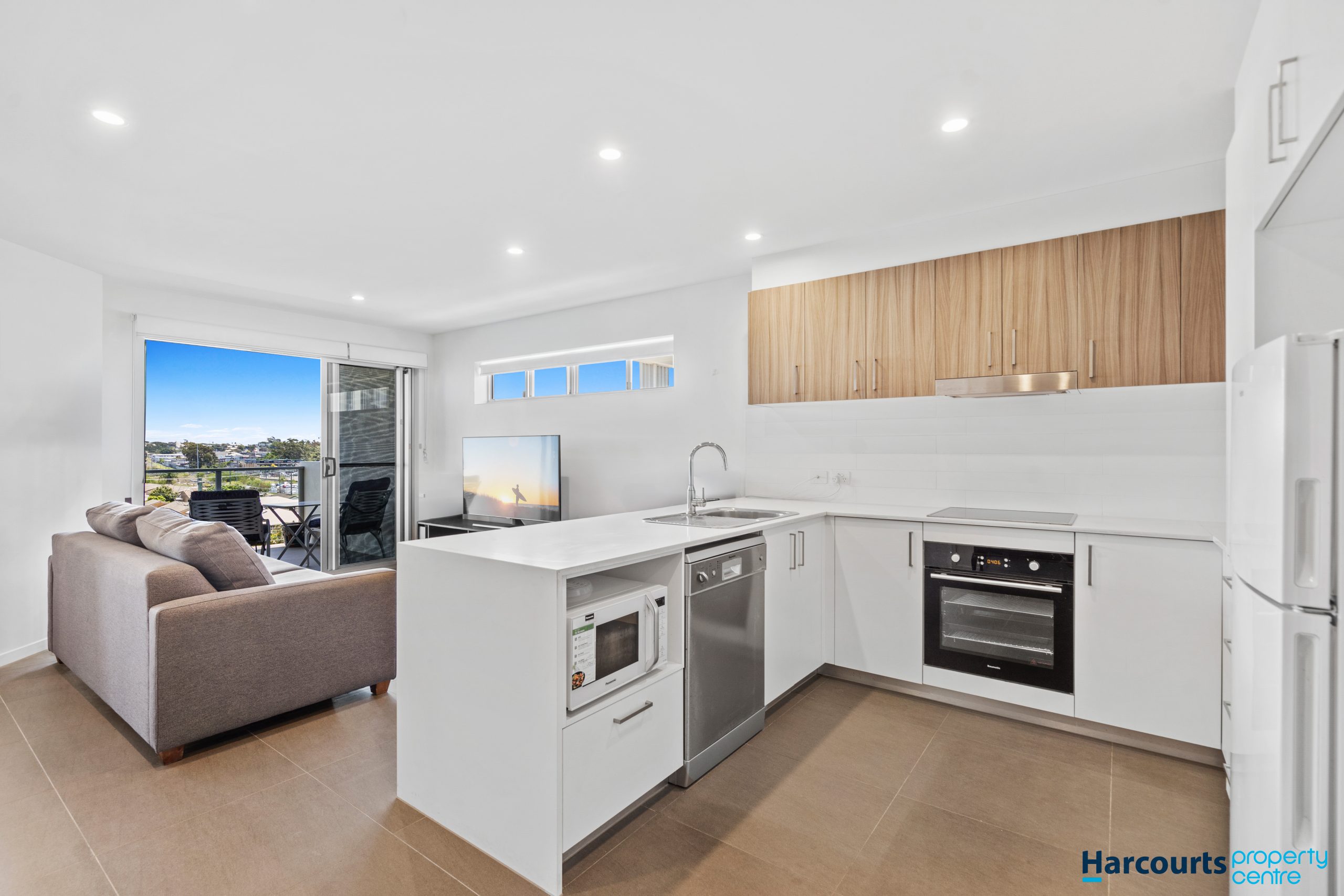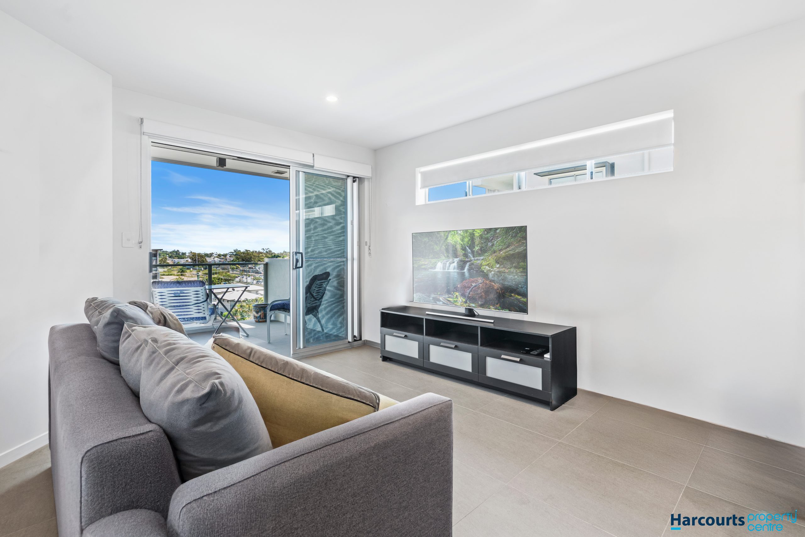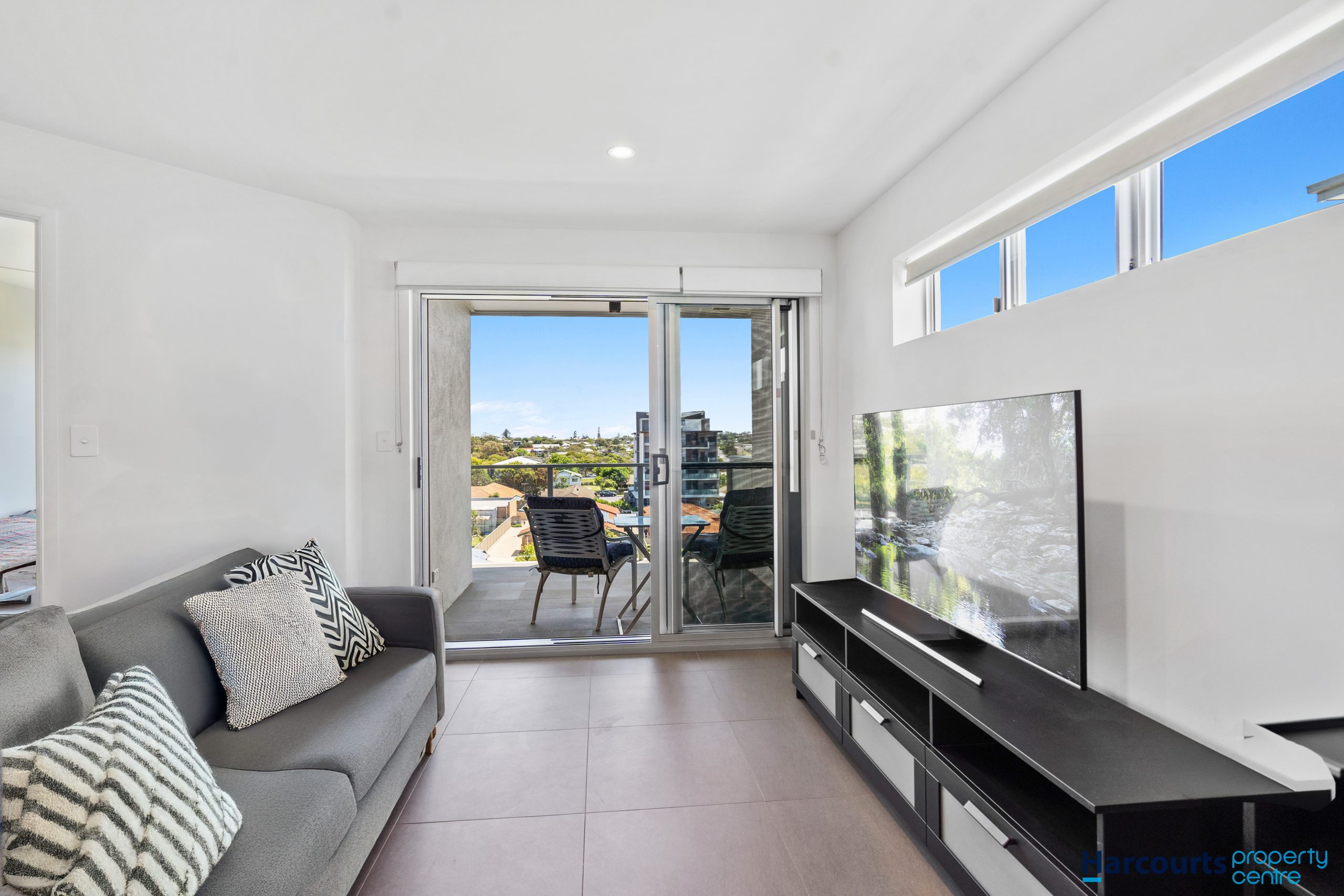 The property features a bright and airy open-plan living area that seamlessly connects to a private balcony, perfect for enjoying your morning coffee or unwinding after a long day while taking in the cityscape and bay views.