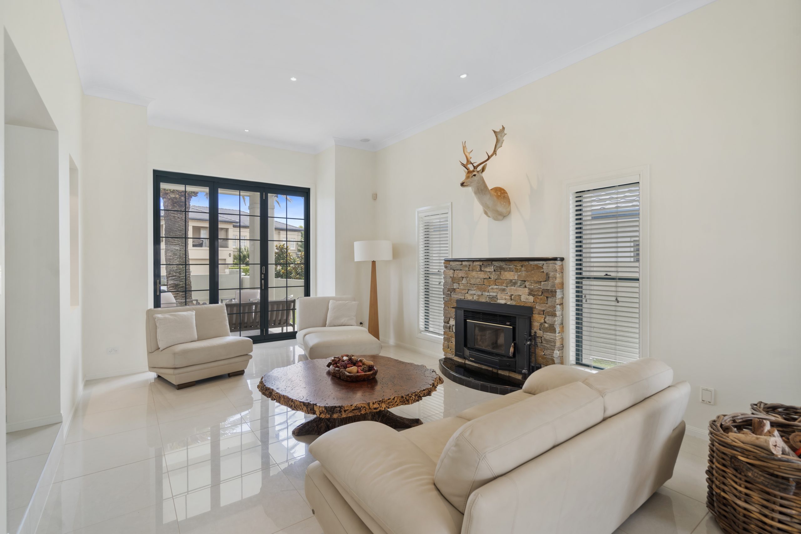 • Generous lounge room features soaring ceilings, fireplace, water views