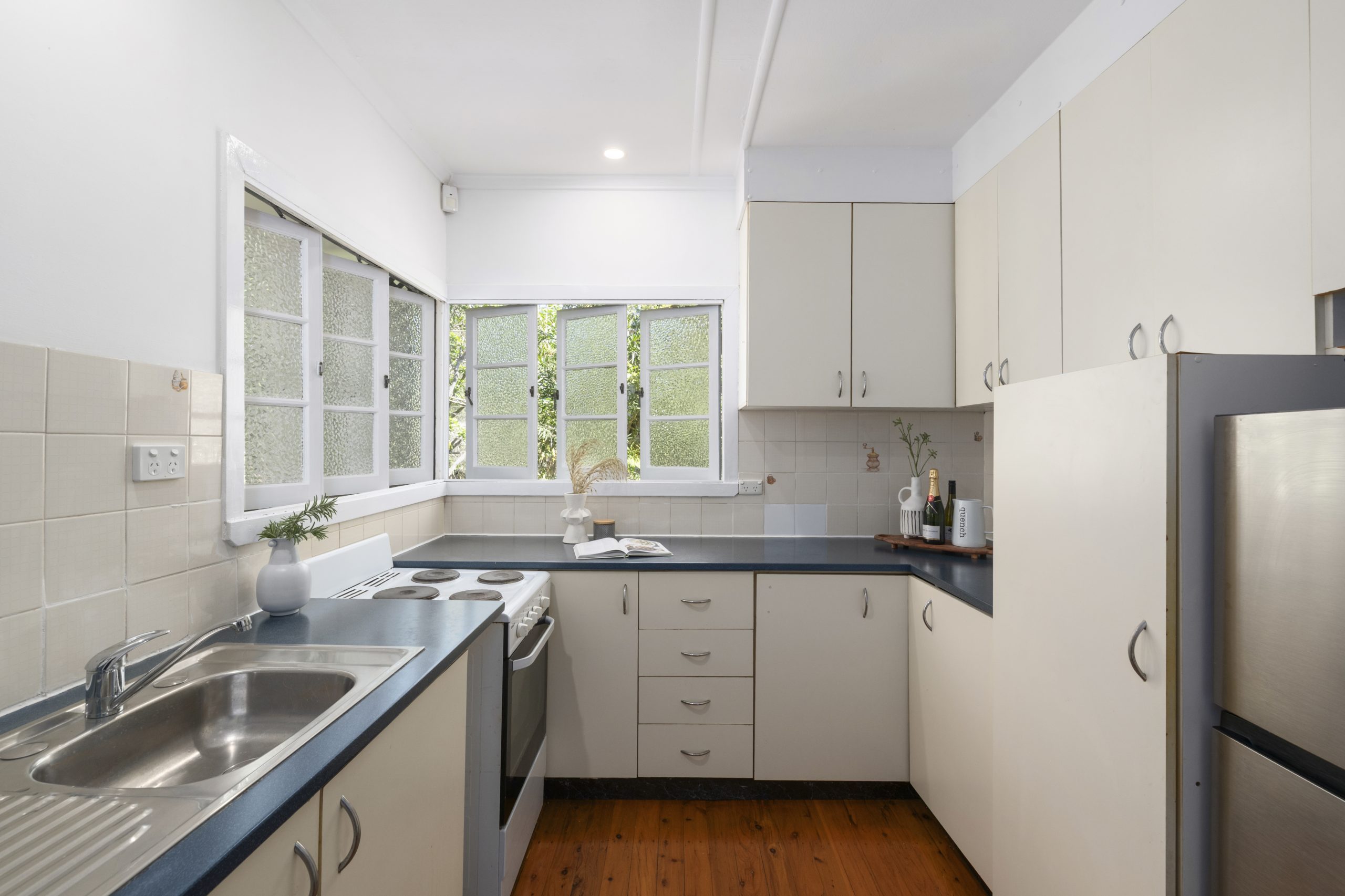 Vibrant gardens welcome you into a light-filled interior that exudes classic character, featuring casement windows, ornate plasterwork and timber floors. The open-plan living and dining areas are bathed in natural light and cooled by gentle breezes, flowing seamlessly into the kitchen with generous storage and wrap-around bench space, it provides everything needed for everyday functionality.