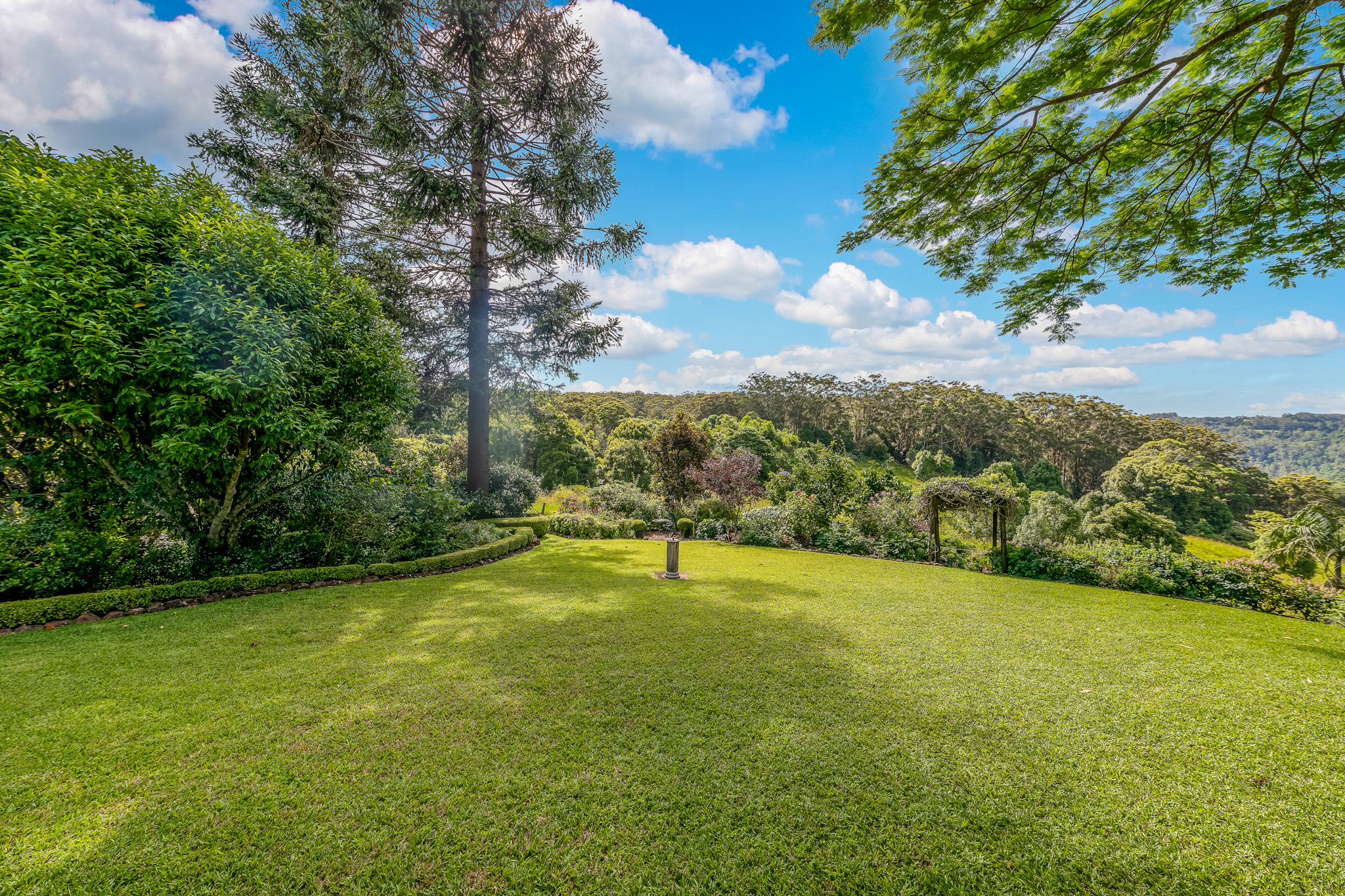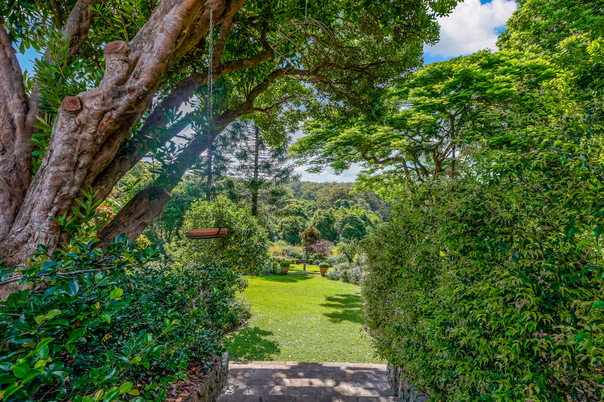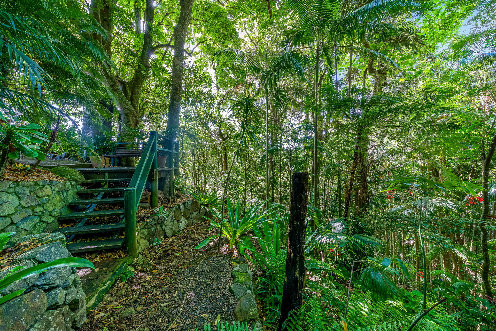 The expansive outdoor entertaining area is tiled and completely undercover so that an outdoor lifestyle can be enjoyed all year round. This outer space is easily accessed from the family room and leads you to the gardens and garage. The vista from every part of the house features the lush gardens and an abundance of flowers and resident birdlife, and the views across the valley to the Obi Obi Road are simply stunning. Extensive stone walls and careful terraced design leads you through the gardens under mature and productive fruit trees to the natural Rainforest to the North of the property. Here you will find palms and tree ferns, and high in the canopy large staghorns and elkhorns thrive.