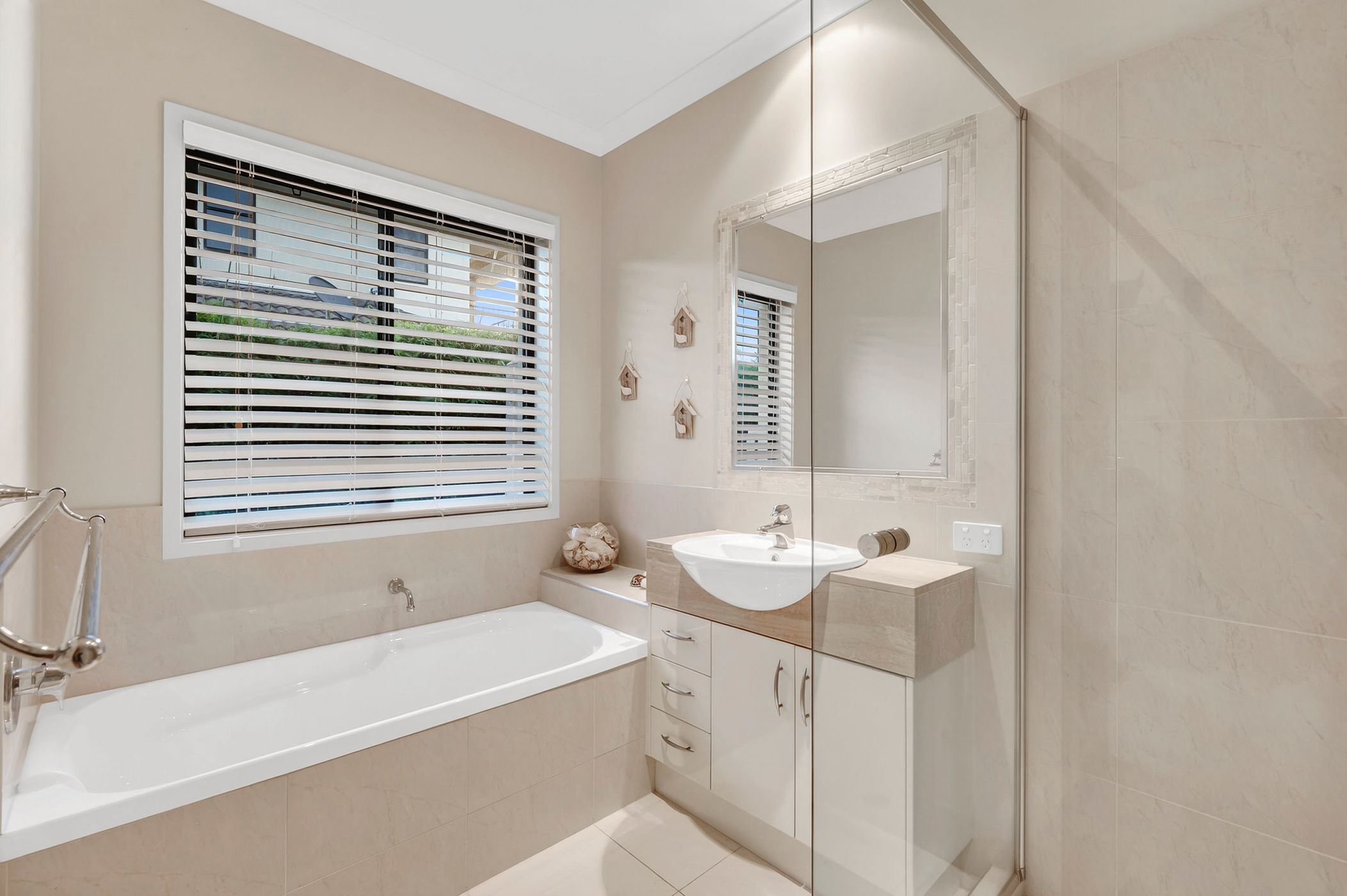 The primary bedroom is privately positioned on the upper level, complete with walk in robe, spacious ensuite with spa bath and a private balcony enjoying elevated golf course views. On the lower level are three additional bedrooms plus a separate study, which could easily serve as a fifth bedroom if required.