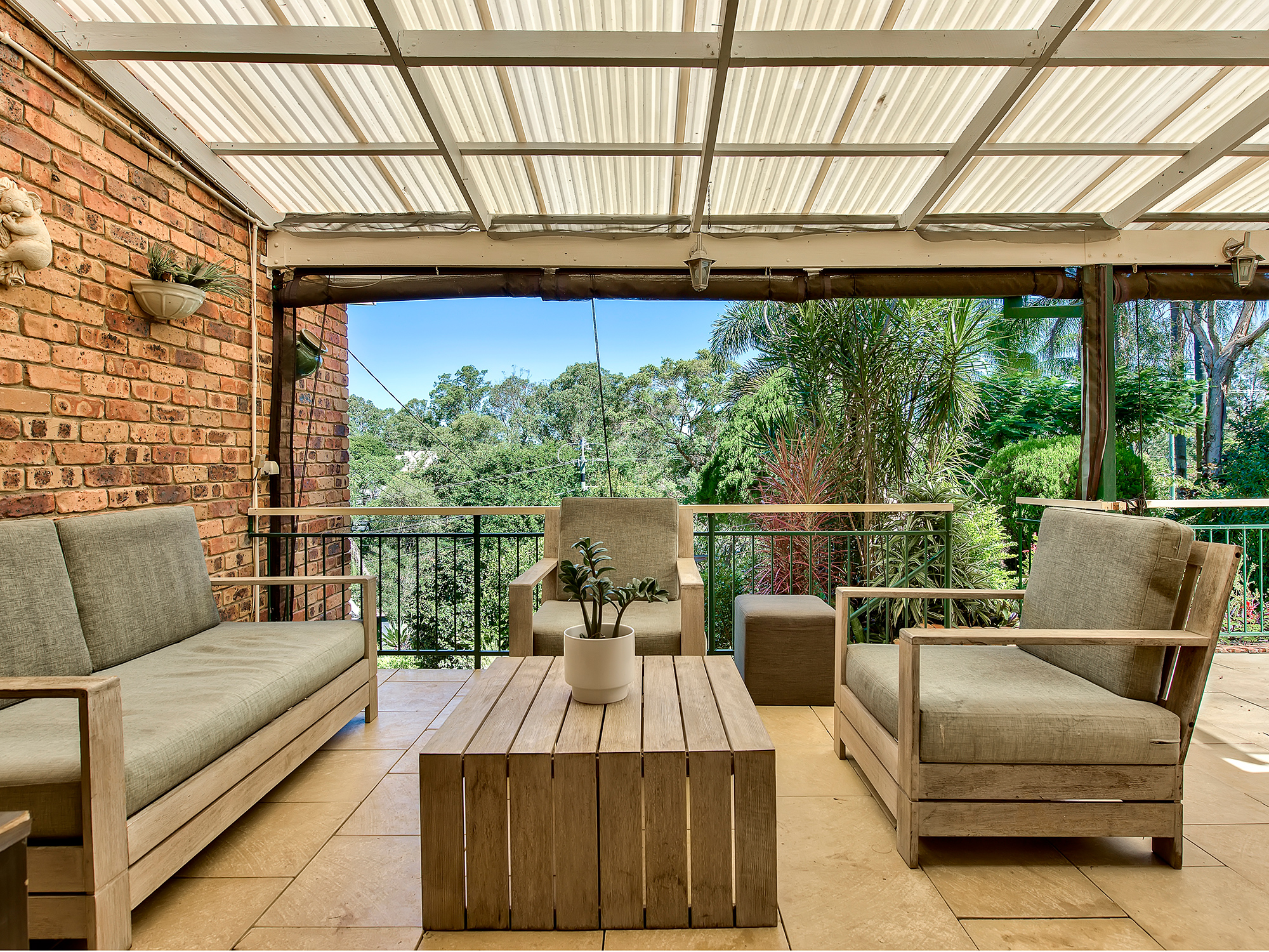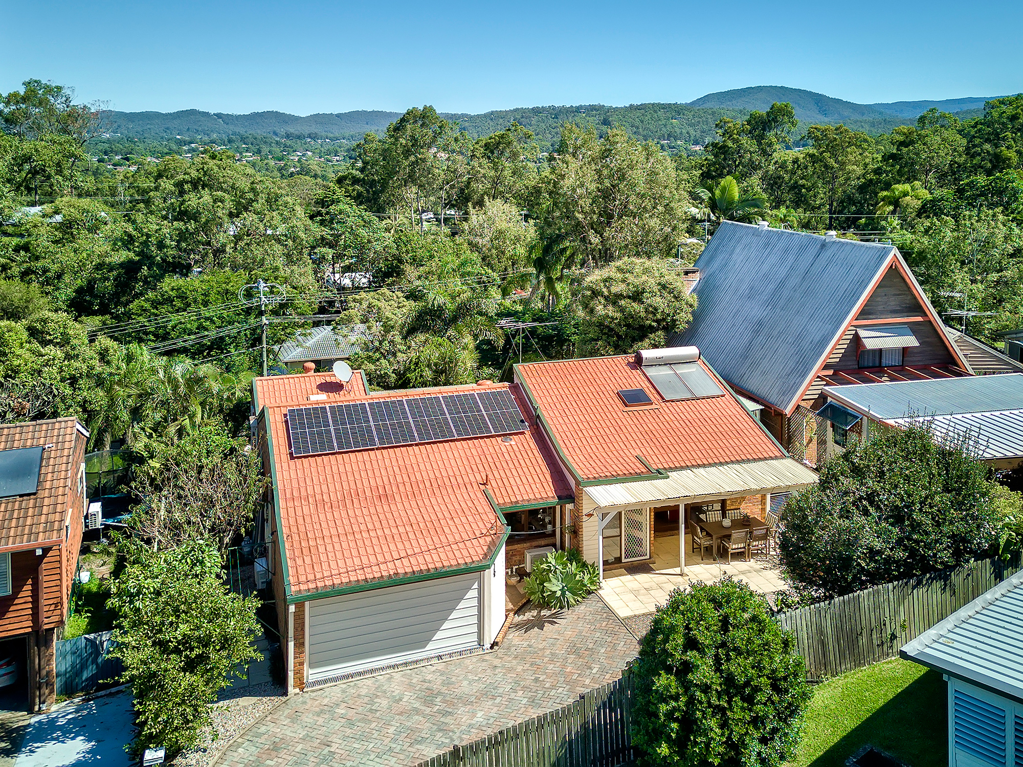 Sliding doors open to a large, covered terrace, privately nestled at the rear and soaking in glorious, elevated views. Cooling breezes complement the backdrop of established leafy surrounds, whilst stairs lead down to the flat yard and additional open-air patio.