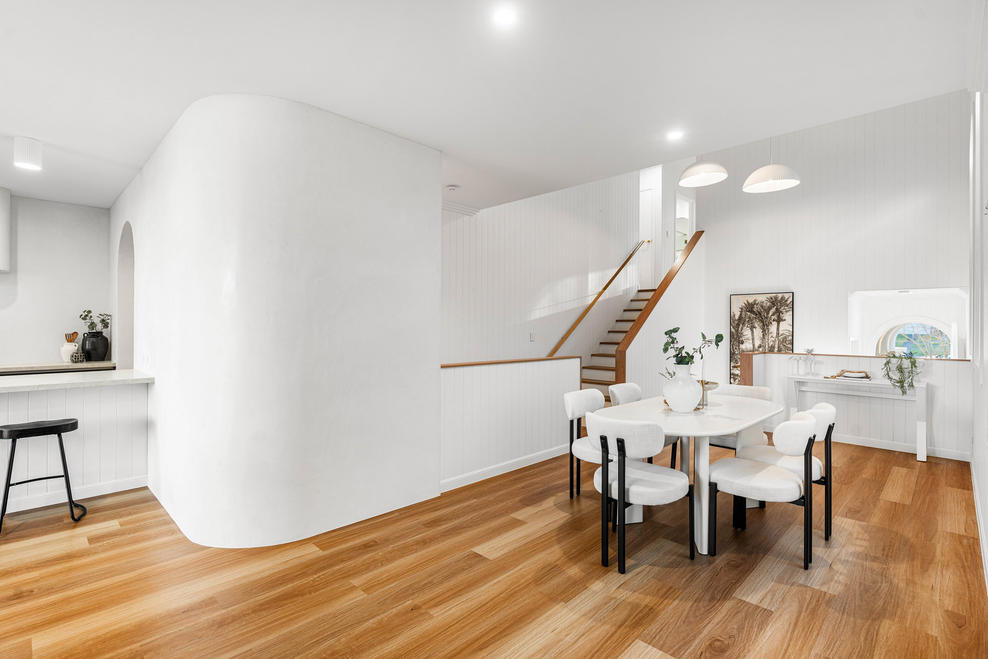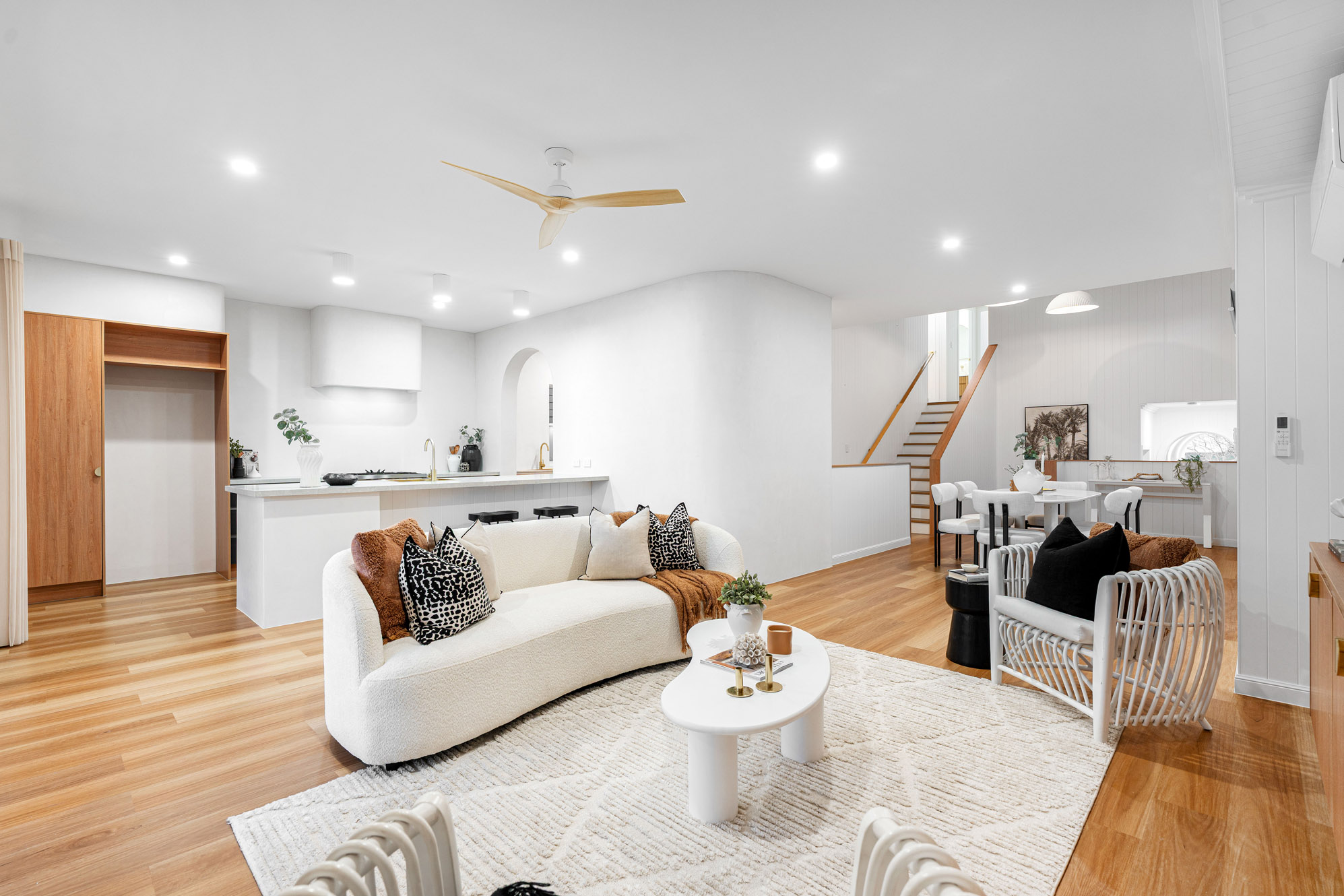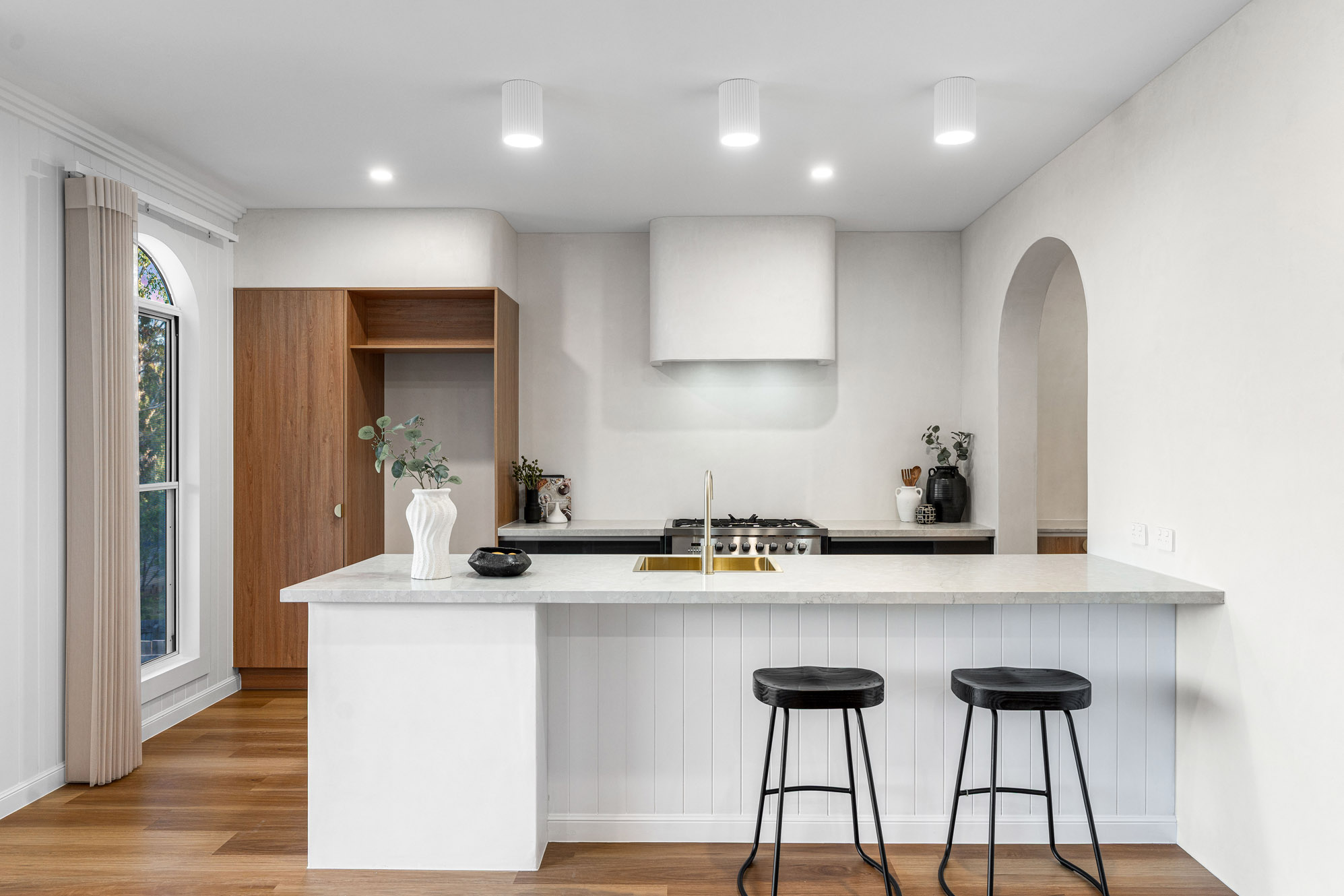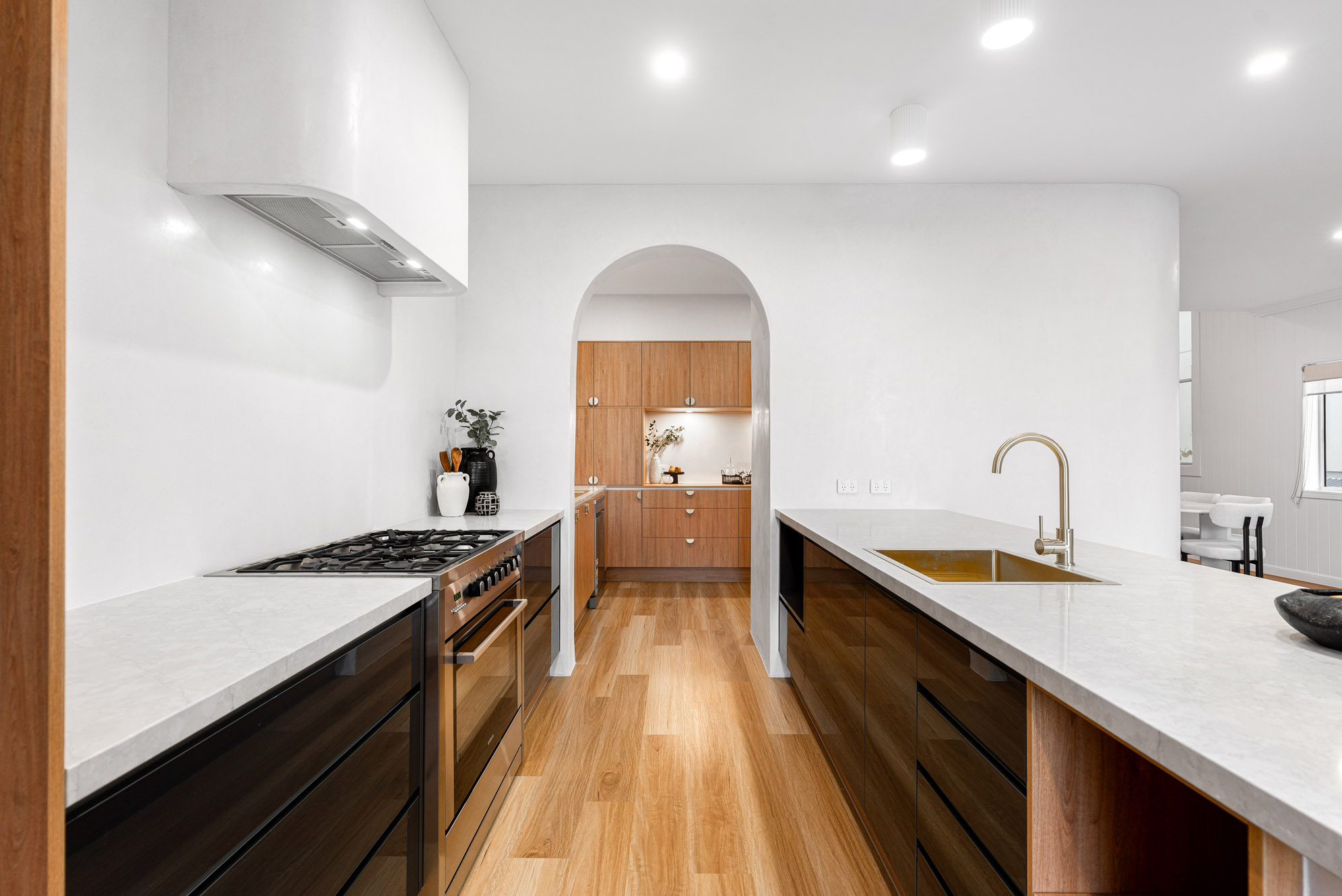 When you step inside, you’re greeted by an abundance of natural light: it floods through the expansive windows and illuminates the Venetian-plastered feature walls. Every detail has been carefully curated in this soft, warm and inviting space. The mid-level is the heart of the home, where open living and dining spaces spill effortlessly onto an alfresco entertaining area overlooking the sunlit pool. The kitchen has stone bench tops, Tasmanian Oak cabinetry, soft-close draws, and is complete with a bespoke butler’s pantry that offers endless storage and functionality.