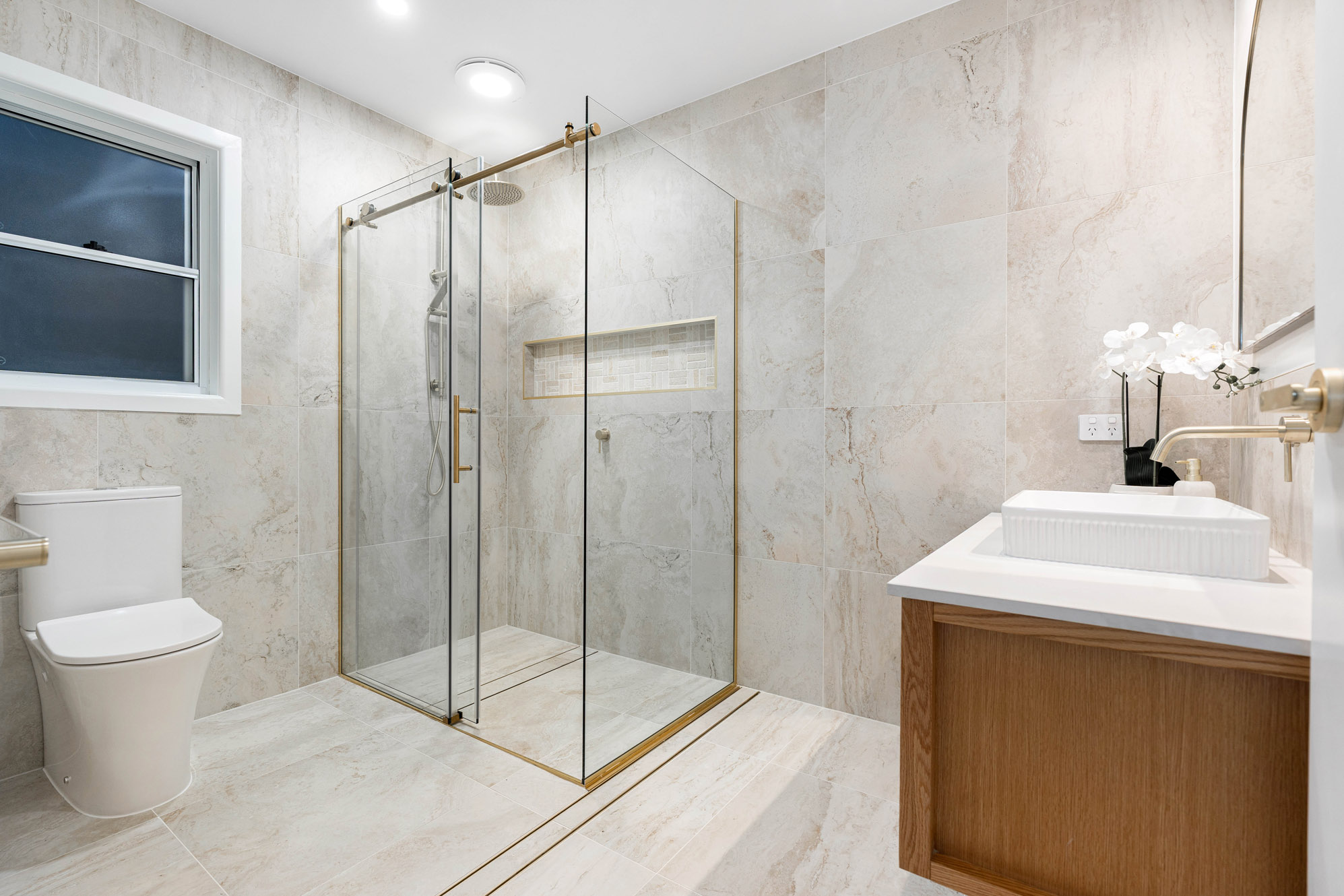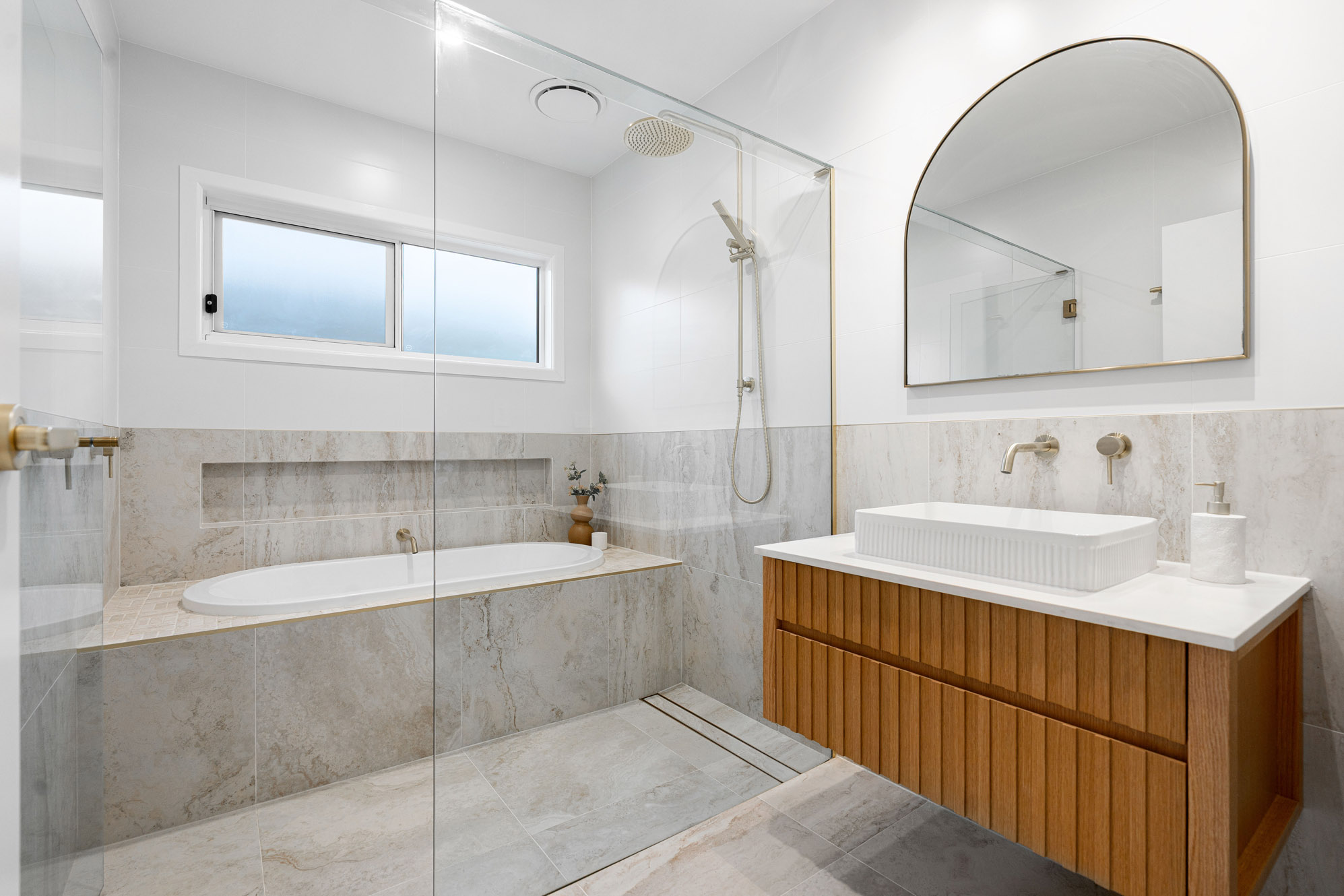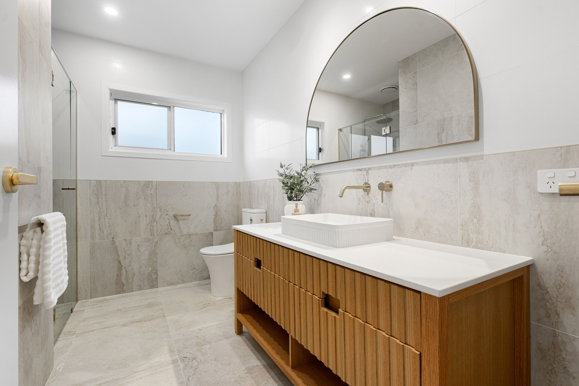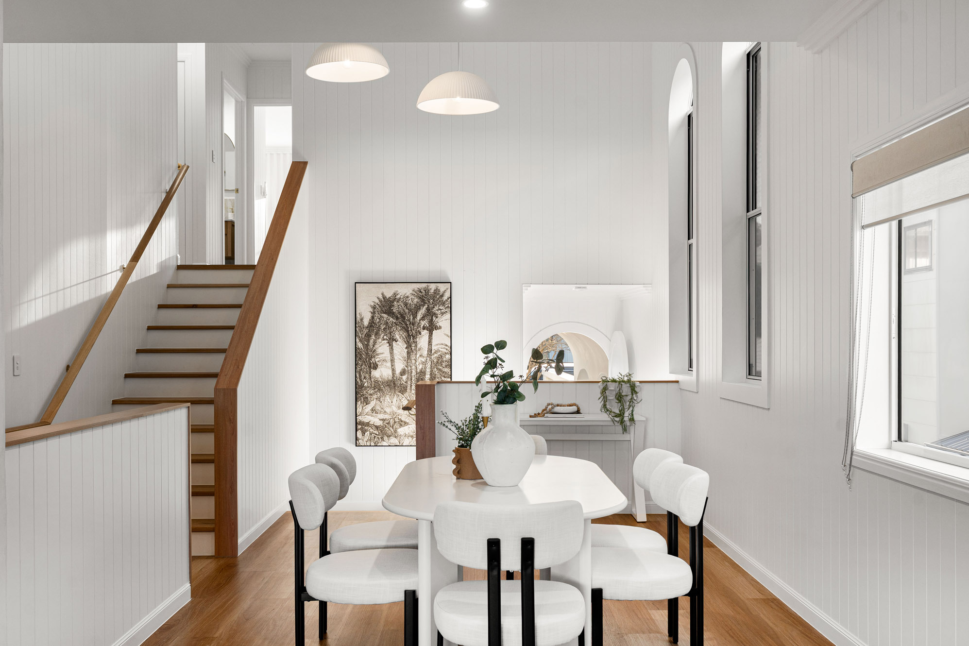 When you step inside, you’re greeted by an abundance of natural light: it floods through the expansive windows and illuminates the Venetian-plastered feature walls. Every detail has been carefully curated in this soft, warm and inviting space. The mid-level is the heart of the home, where open living and dining spaces spill effortlessly onto an alfresco entertaining area overlooking the sunlit pool. The kitchen has stone bench tops, Tasmanian Oak cabinetry, soft-close draws, and is complete with a bespoke butler’s pantry that offers endless storage and functionality.
