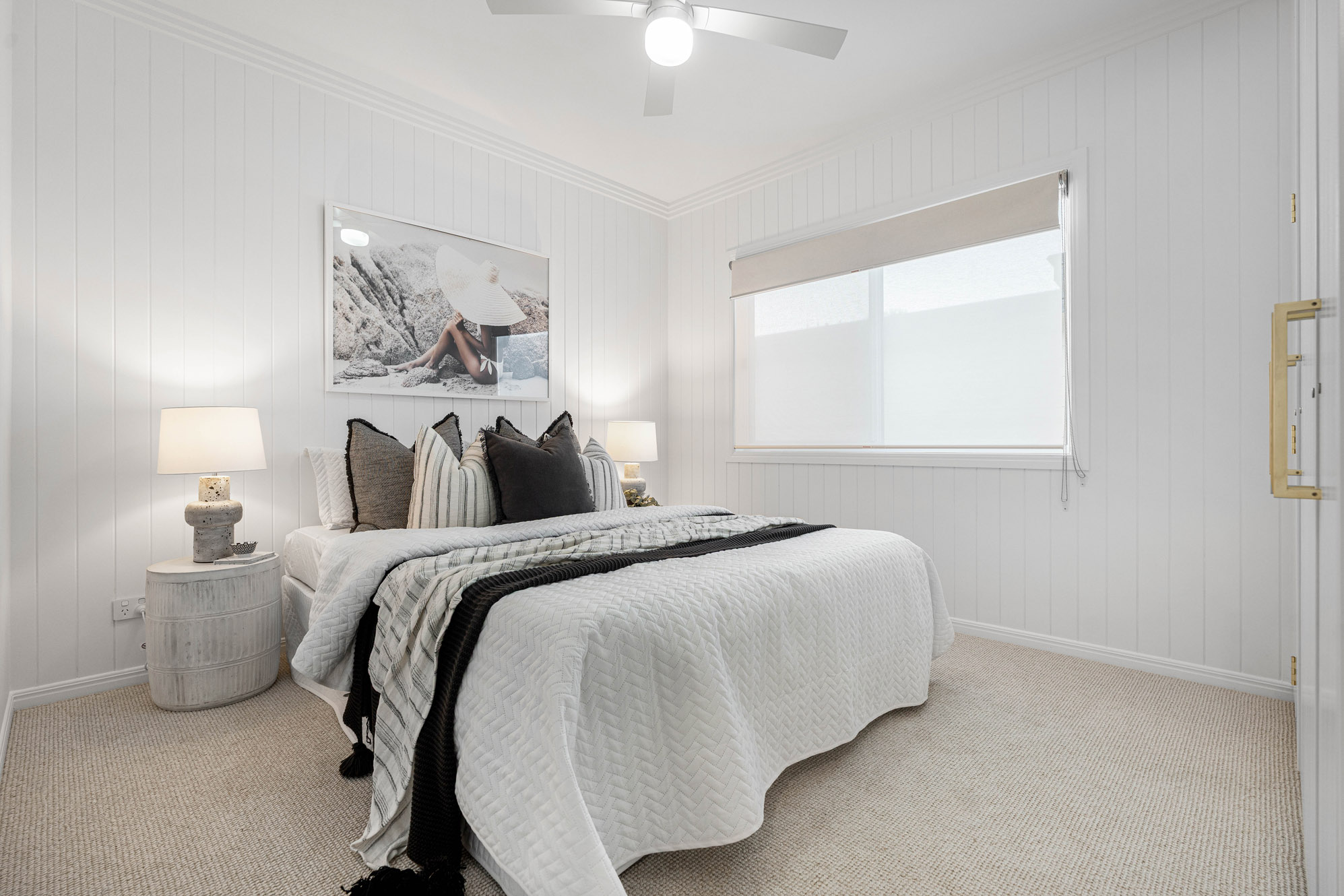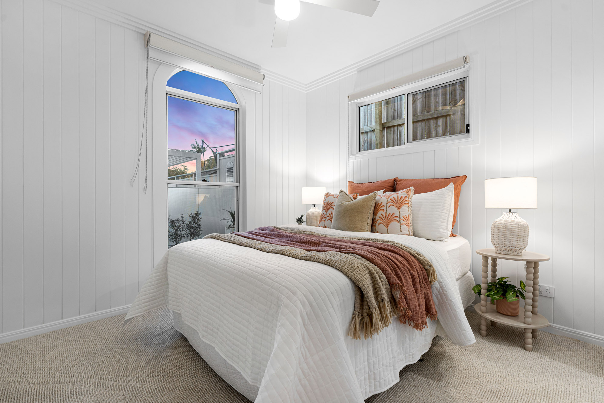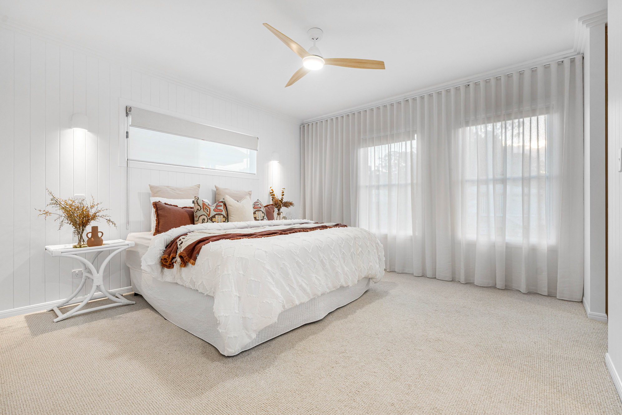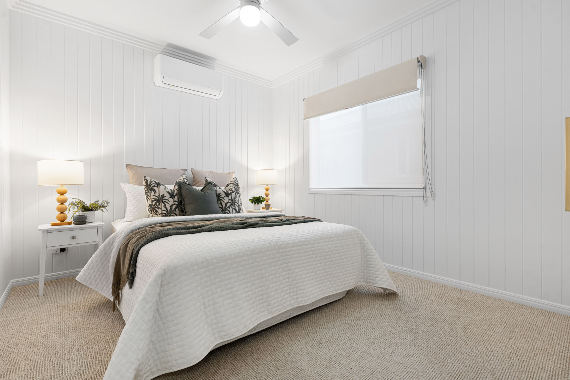 Upstairs, the master suite is a retreat of sophistication, with a fully fitted dressing room and luxurious ensuite. Two additional bedrooms, each with built-in robes and ceiling fans, share a beautifully appointed bathroom with both bath and shower.