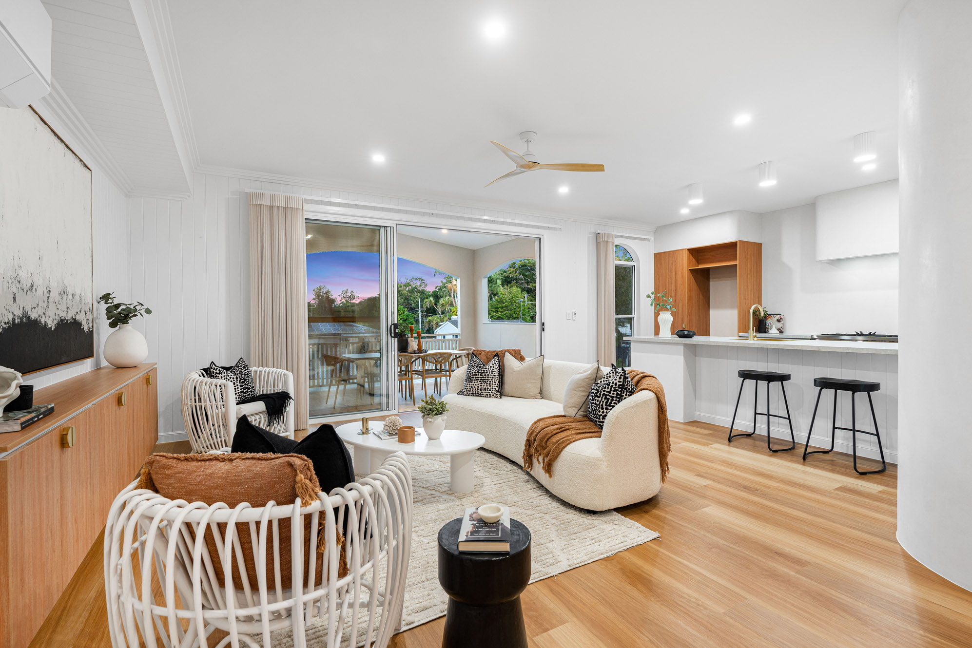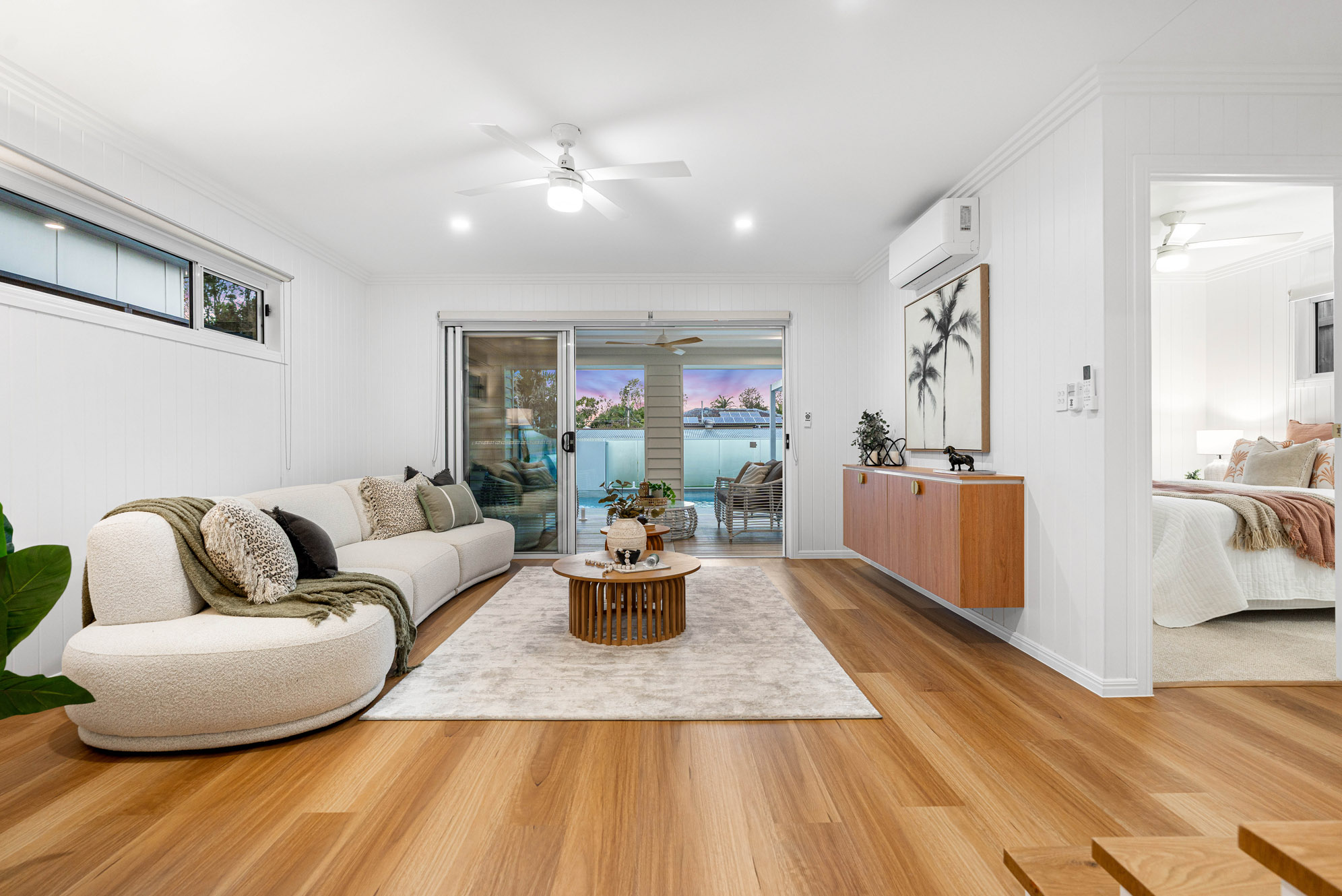 On the lower level, the second living room flows seamlessly into a sheltered alfresco area beside the pool – a beautiful, breezy, and blissful space designed for relaxation and refined entertaining. The fourth bedroom, complete with a walk-in robe and large bathroom, forms a private, peaceful and perfectly appointed retreat for guests or extended family.