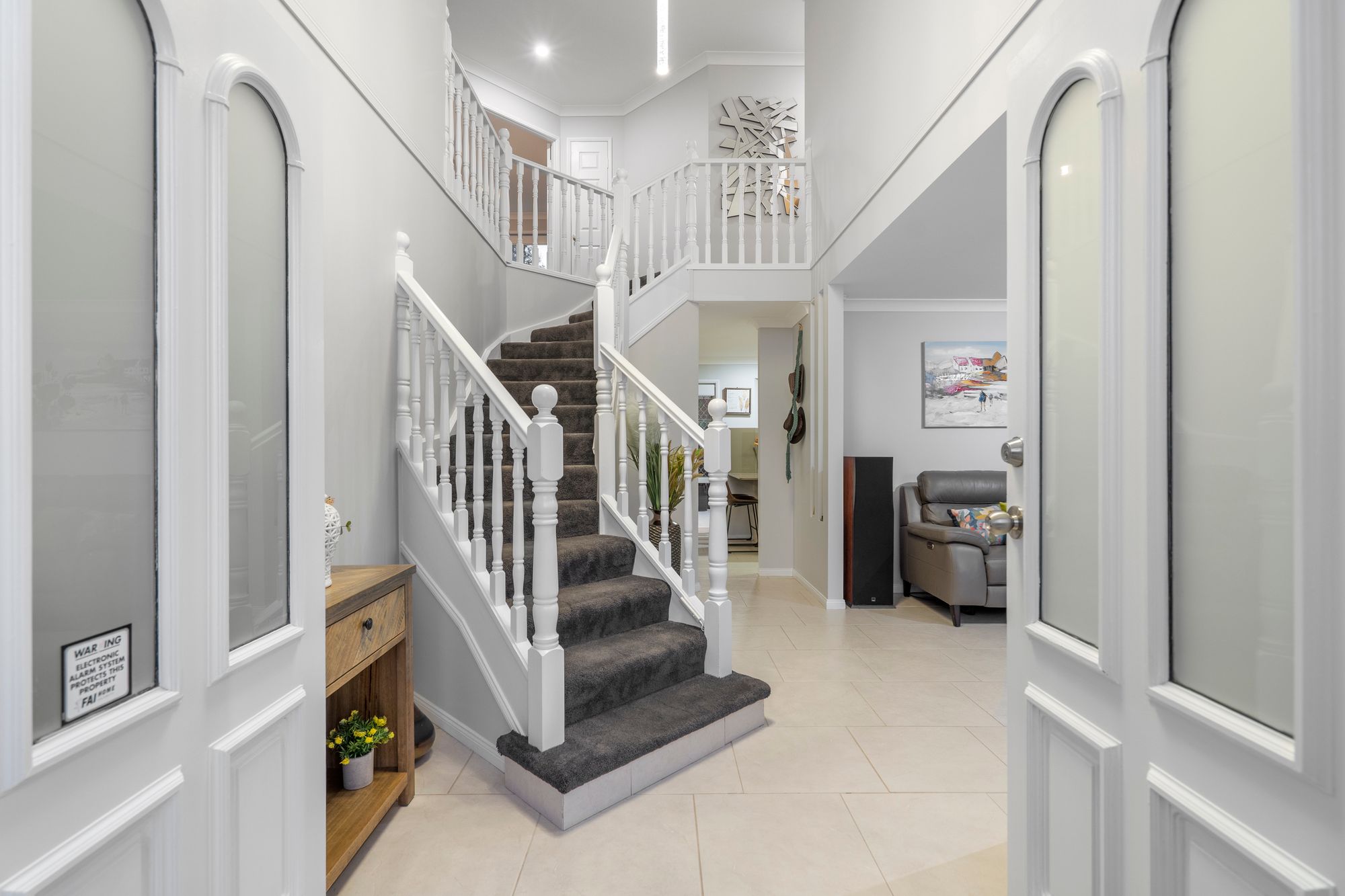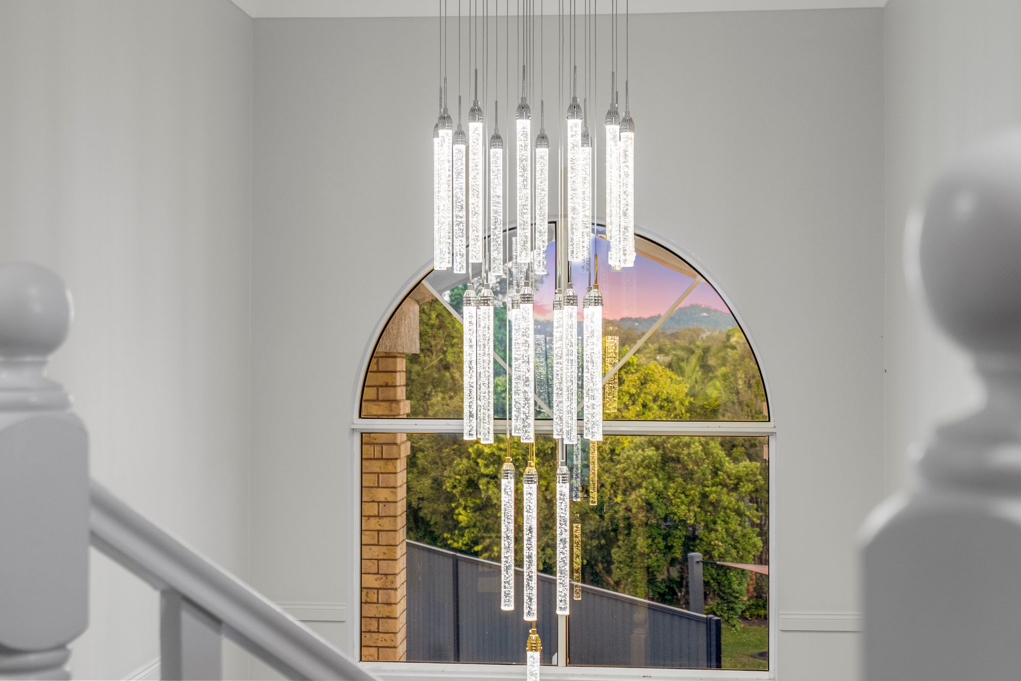 On entering, you are greeted by stunning cathedral ceilings that immediately provide a sense of space and grandeur, highlighted by a custom-made LED chandelier that adds that touch of class to an already impressive entrance!