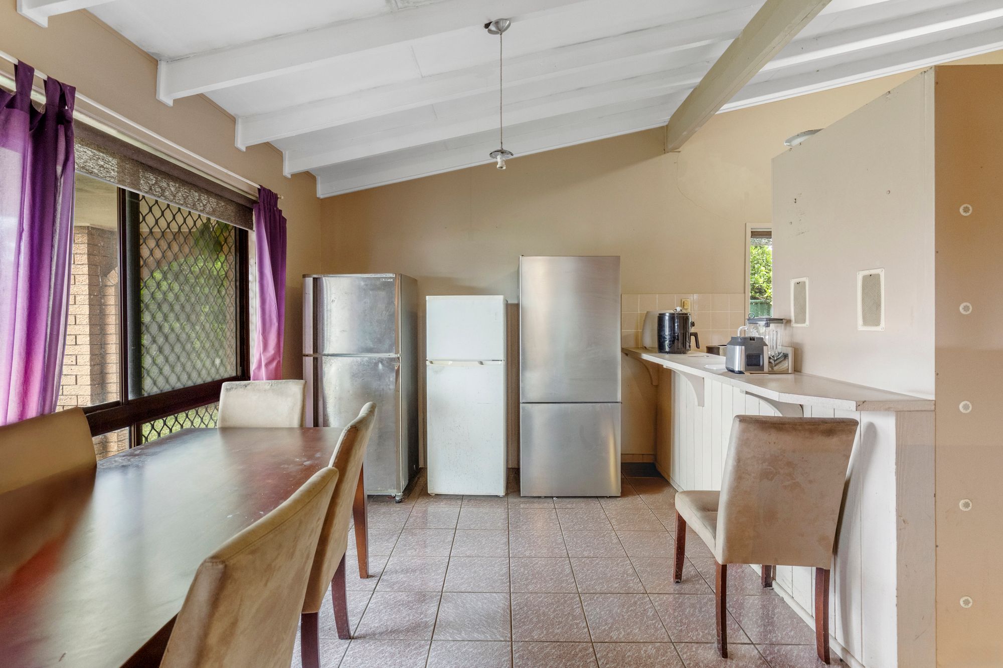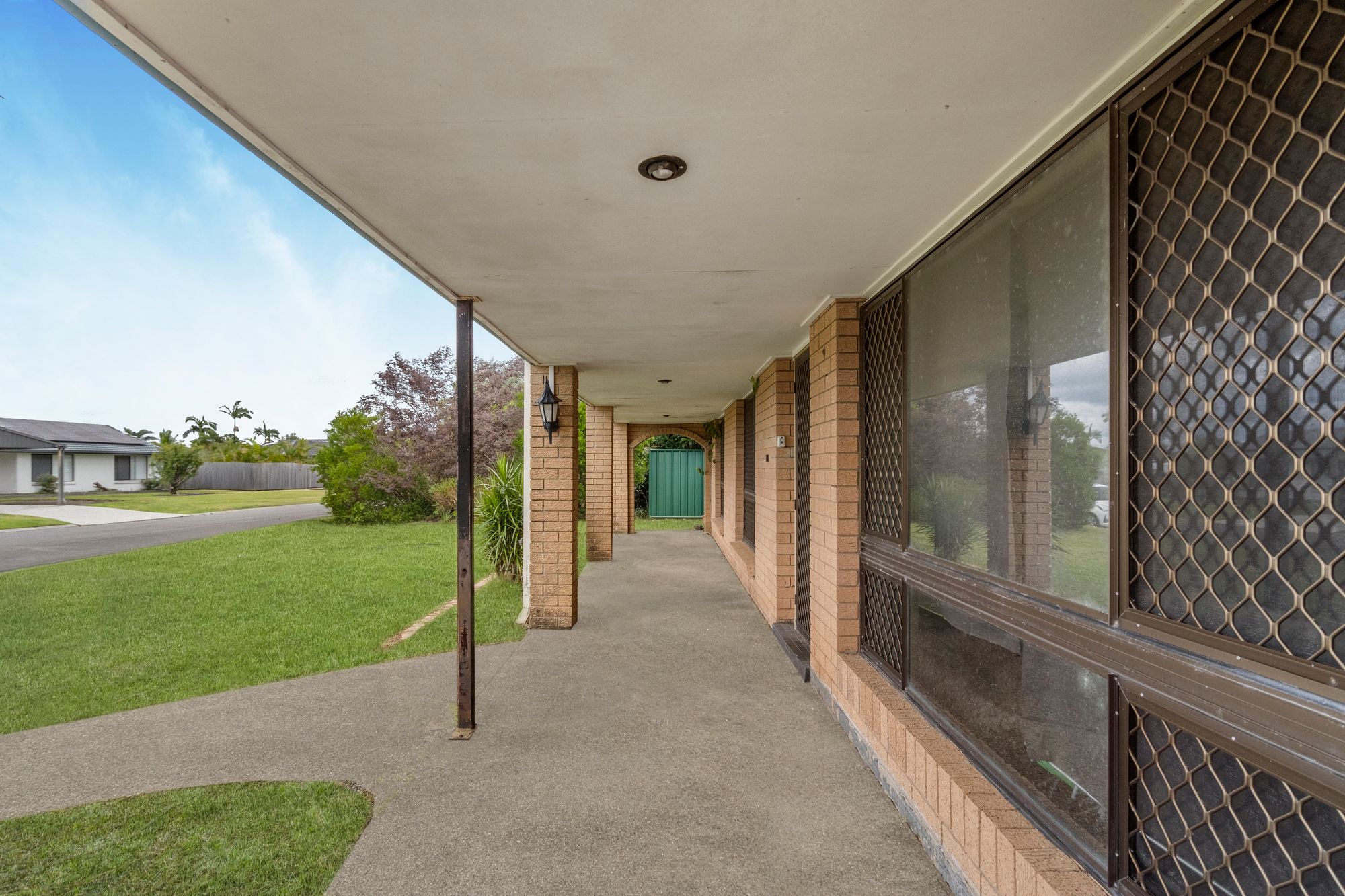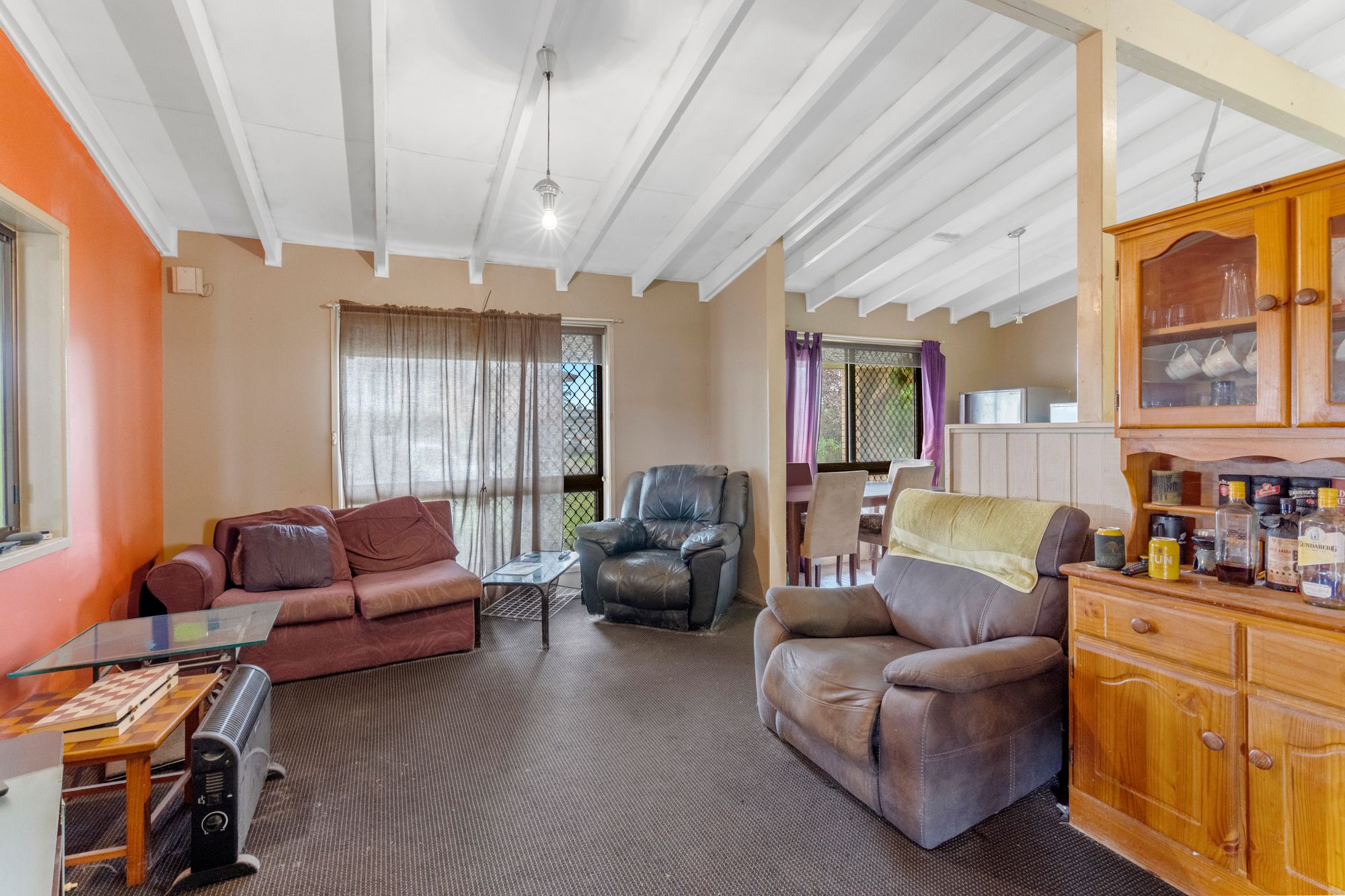 Inside, the home features a spacious open-plan lounge and dining area with exposed beam ceilings, ceiling fans, and great natural light. The adjoining kitchen provides electric cooking, ample cupboard and bench space, and tiled flooring. A separate multipurpose room or enclosed patio extends the living space, ideal as a rumpus, games room or home office.