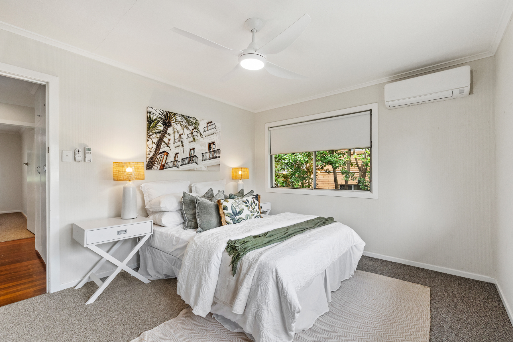 Three well-proportioned bedrooms are positioned upstairs, all with remote-controlled fan/light combinations and built-in storage. The master bedroom enjoys front-facing views and its own air-conditioning unit, while bedrooms two and three look out to the rear yard. The main bathroom includes a separate shower and bathtub, plus a modern vanity with storage, and a separate toilet for convenience. Timber floors throughout the living areas and plush carpet in the bedrooms create a warm and inviting atmosphere, while hallway linen and corridor storage add practicality.