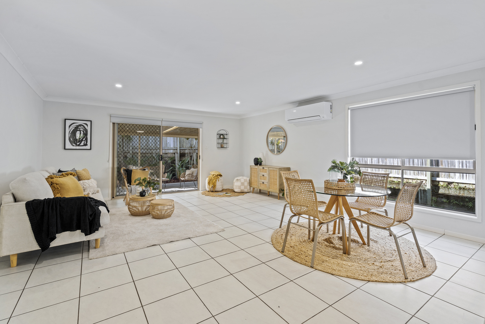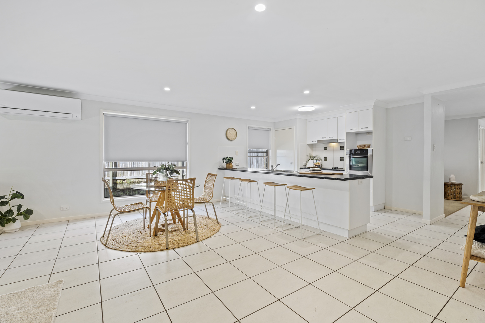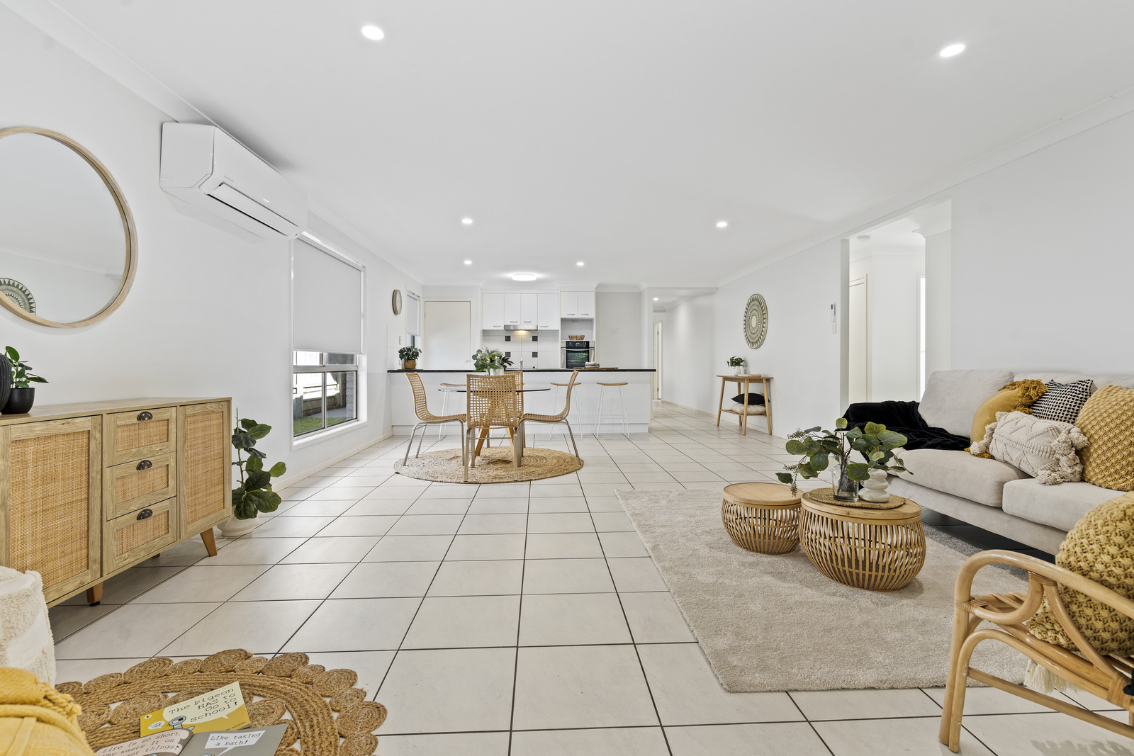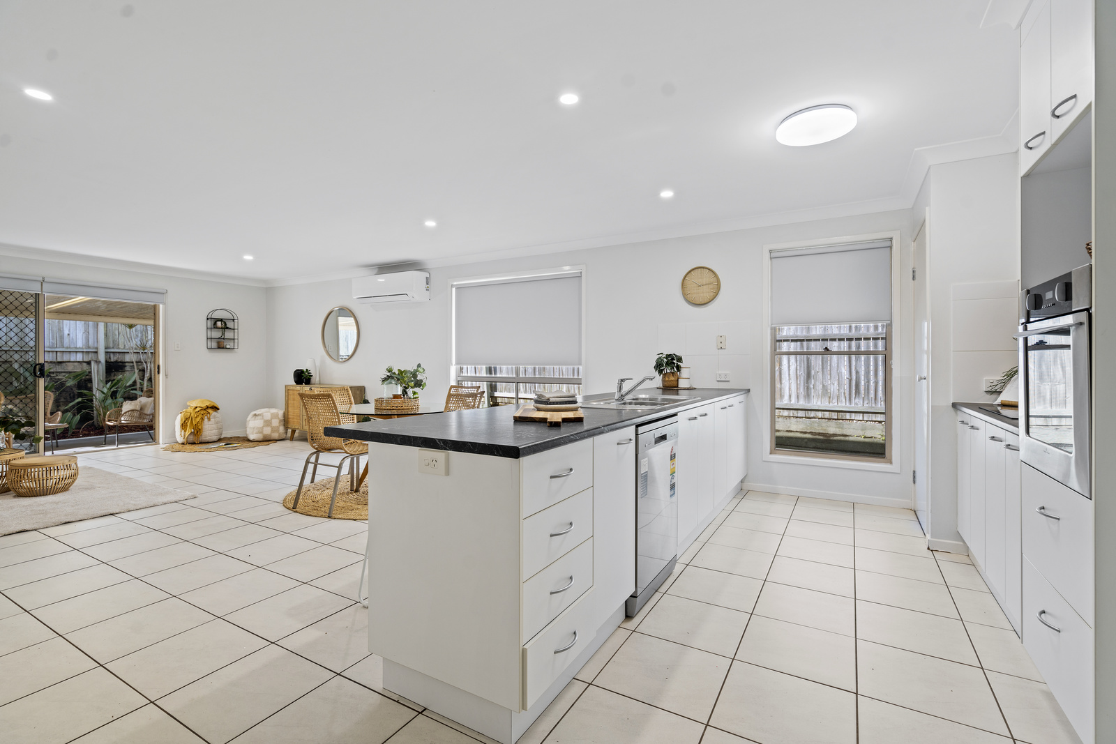 • Central open-plan kitchen, dining, and living area with air conditioning