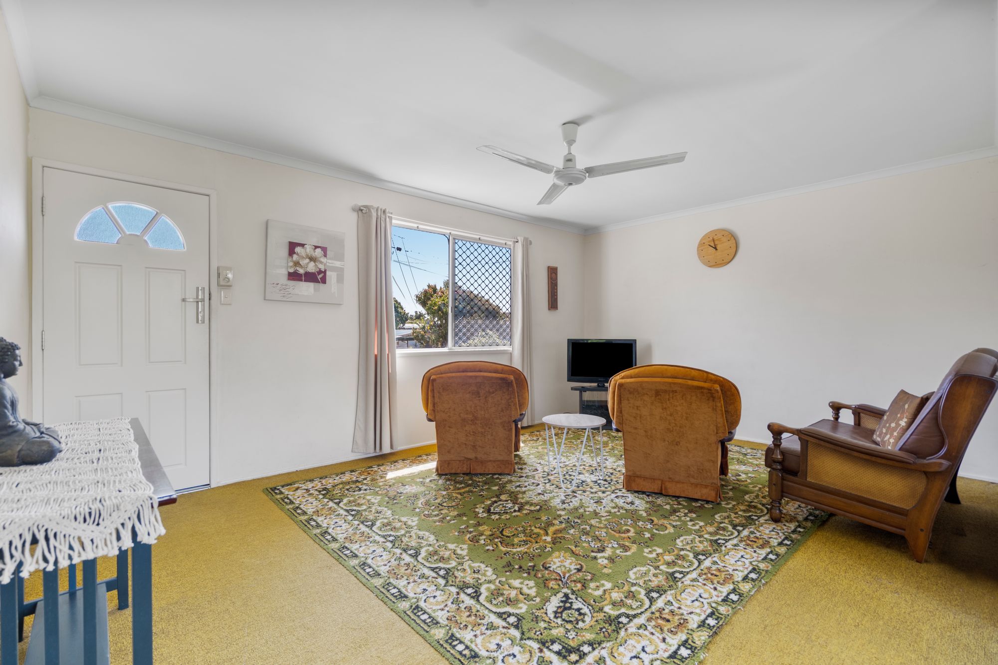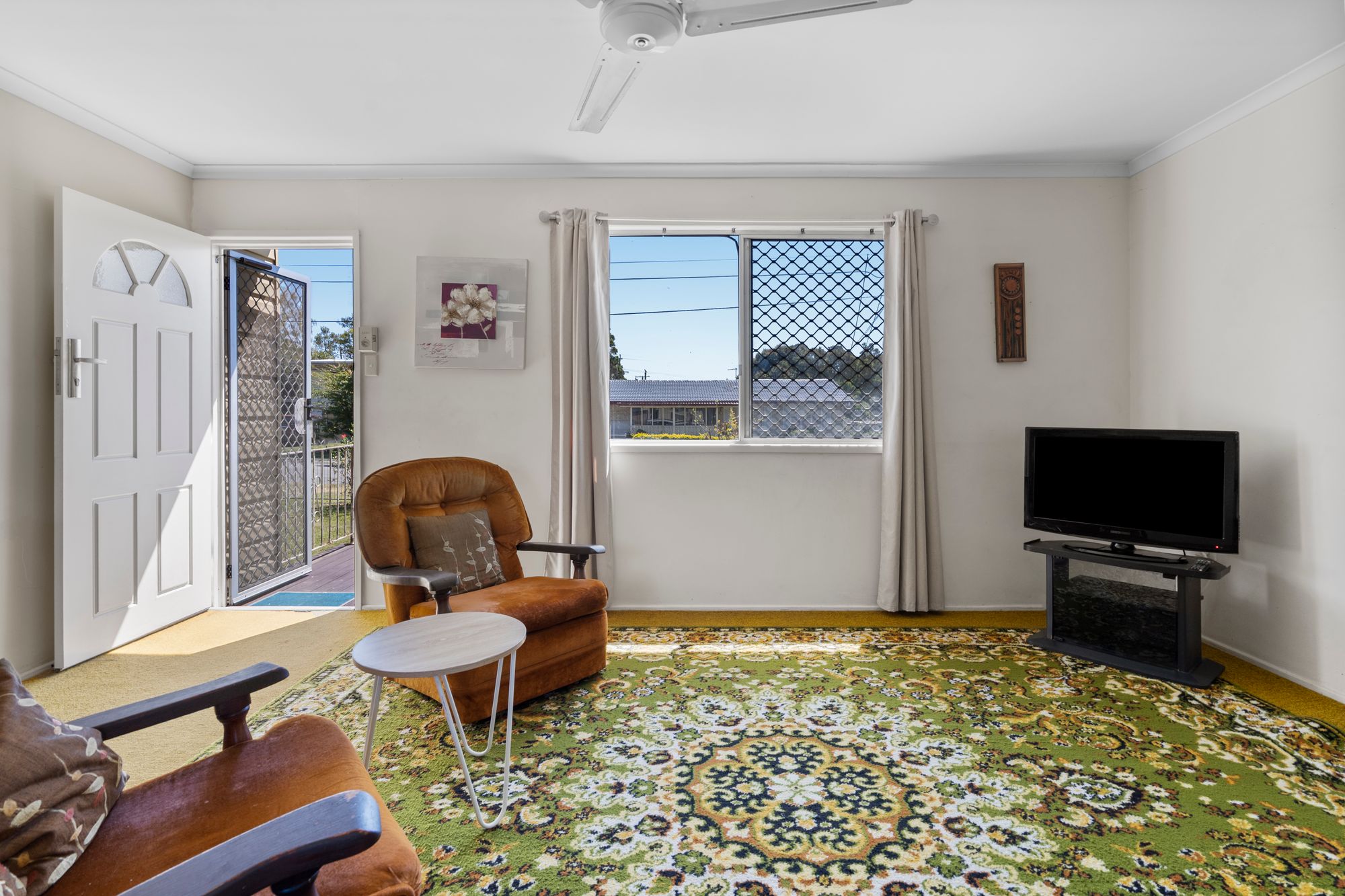 Light-filled living area with ceiling fan