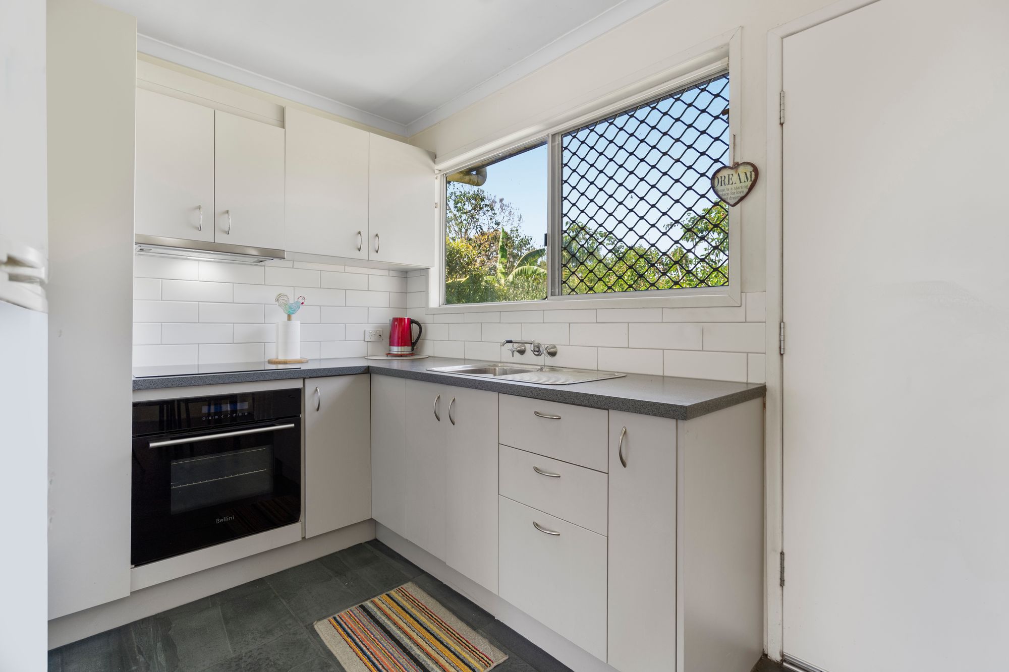 Nearly new kitchen with electric cooktop, oven, tiled flooring and adjoining dining area