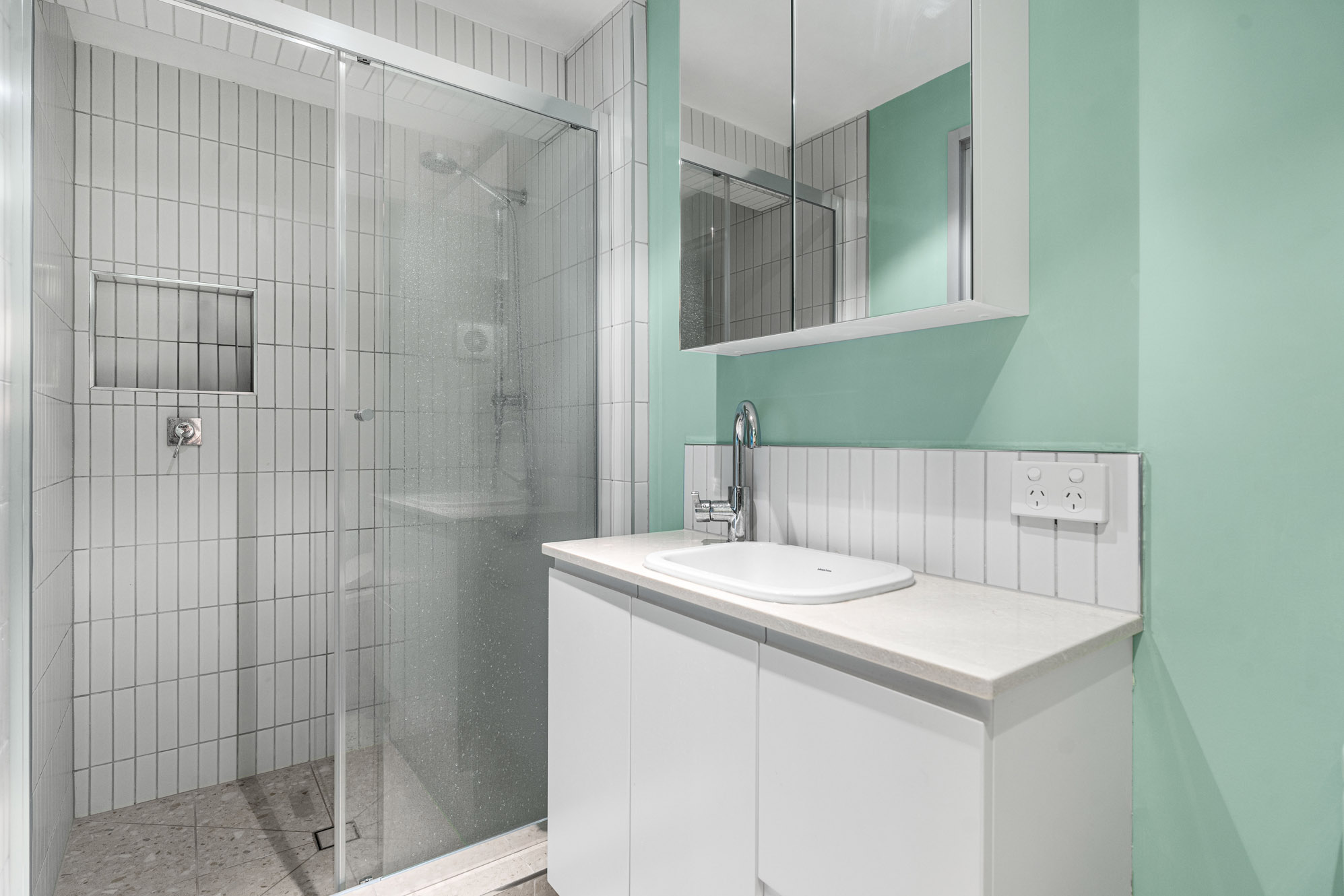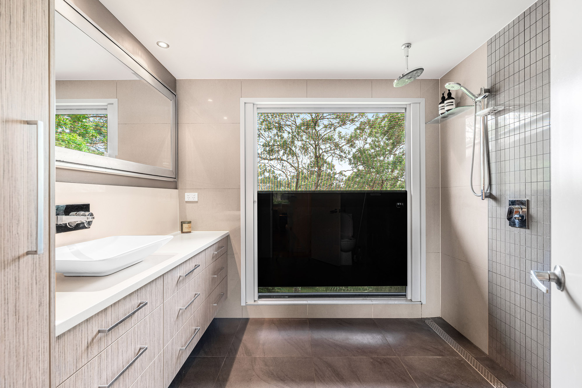 • Steps away is the stylish main bathroom with a frameless glass shower and leafy views