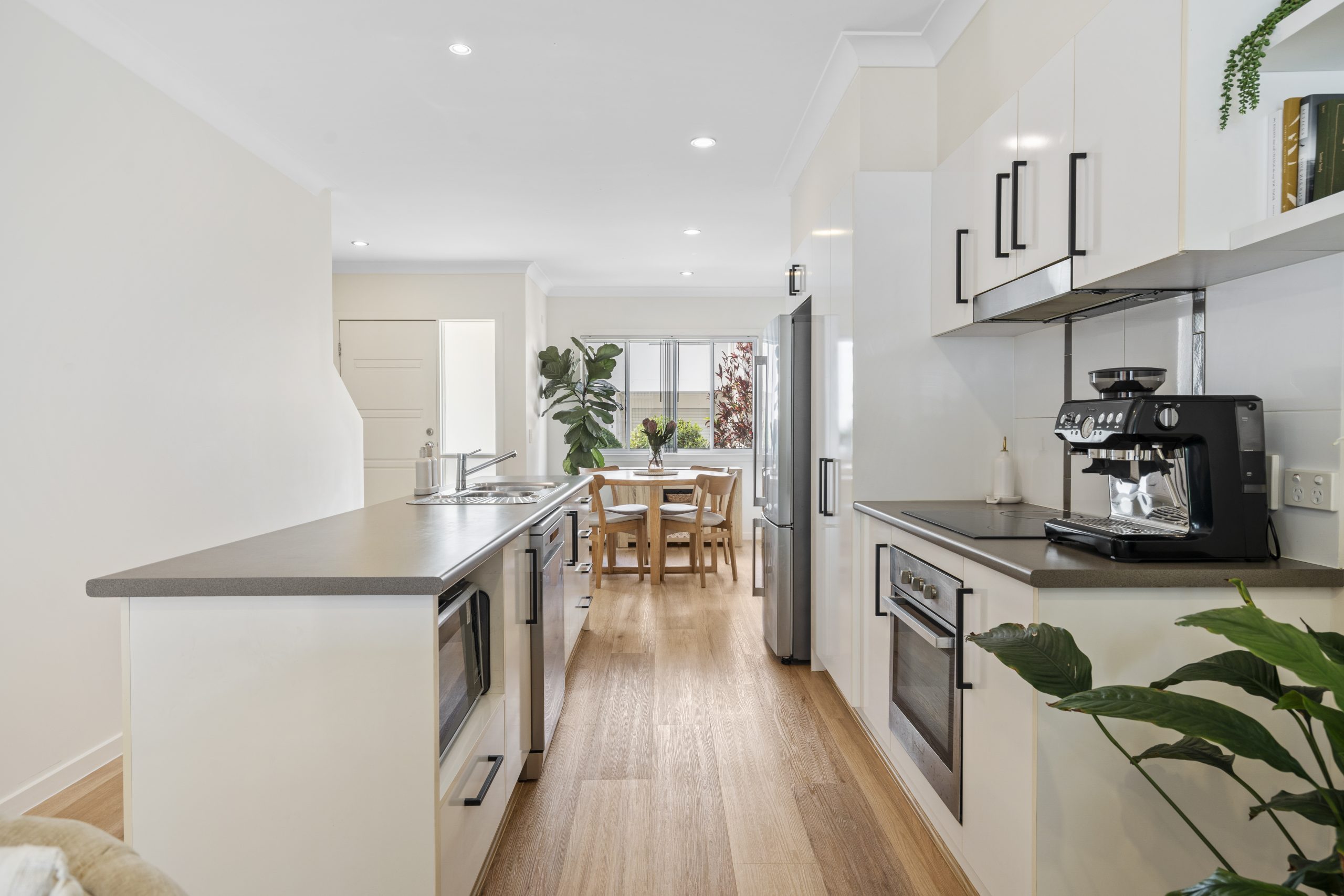 • Modern and functional galley-style kitchen featuring an electric cooktop and stainless steel oven & dishwasher