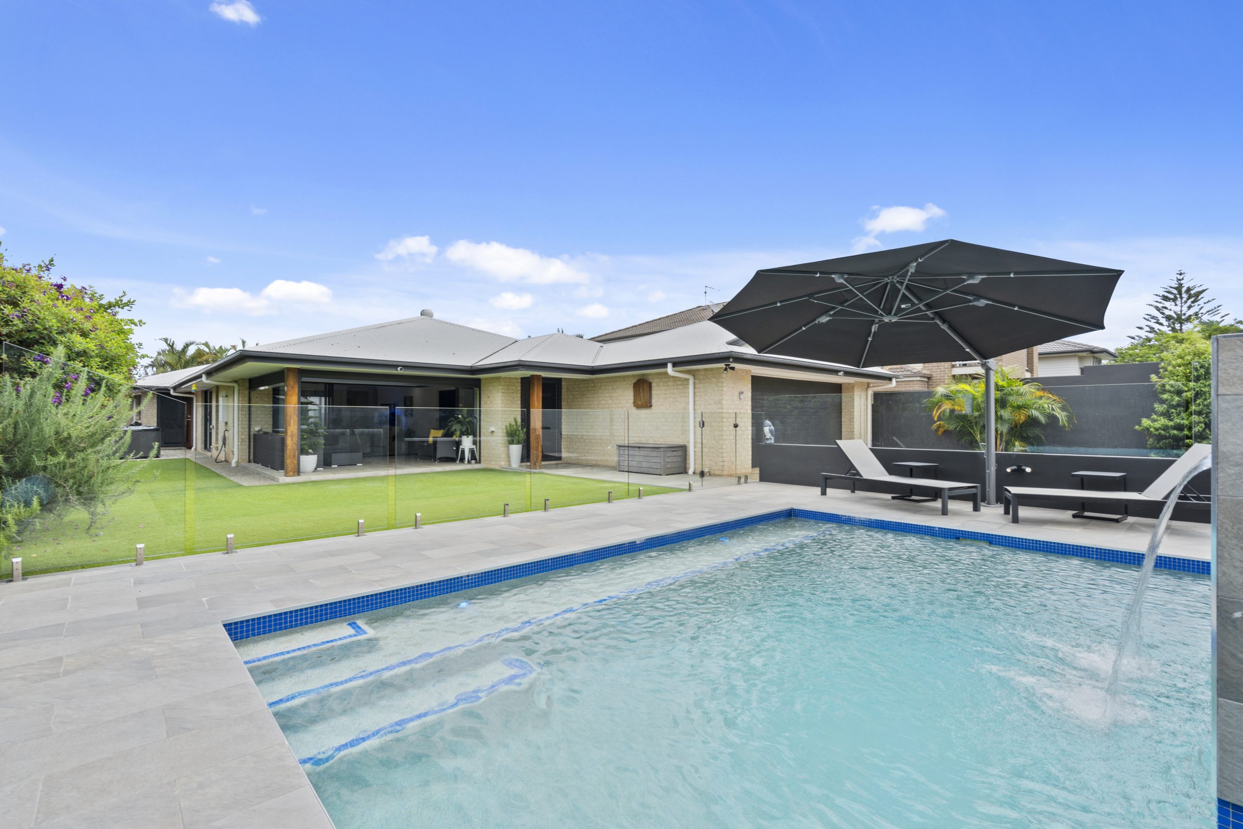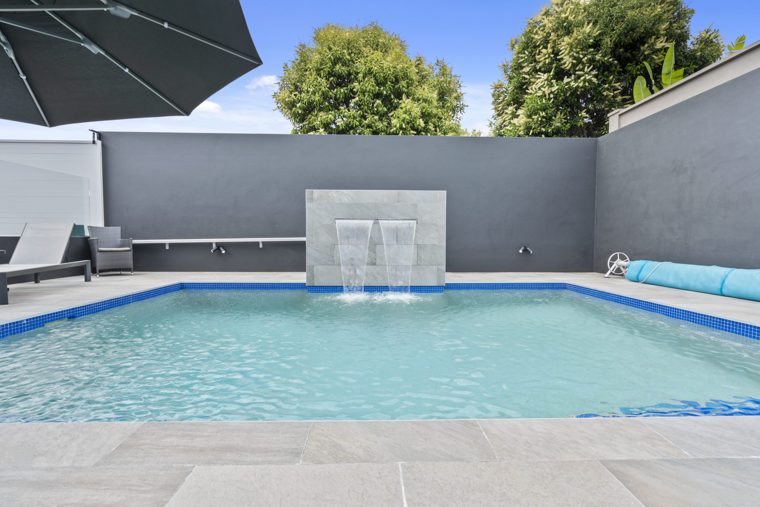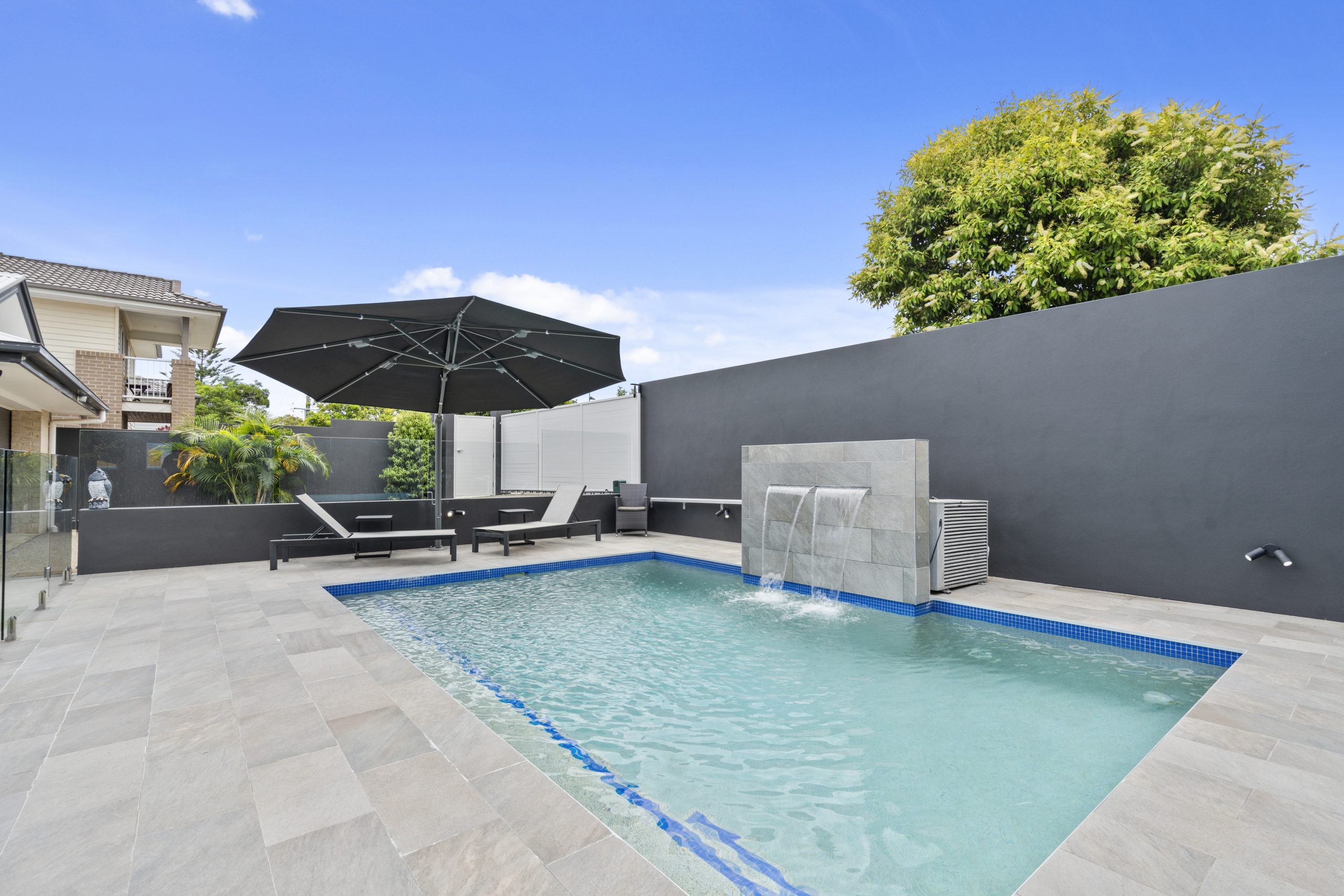 Large heated pool with water feature and shade