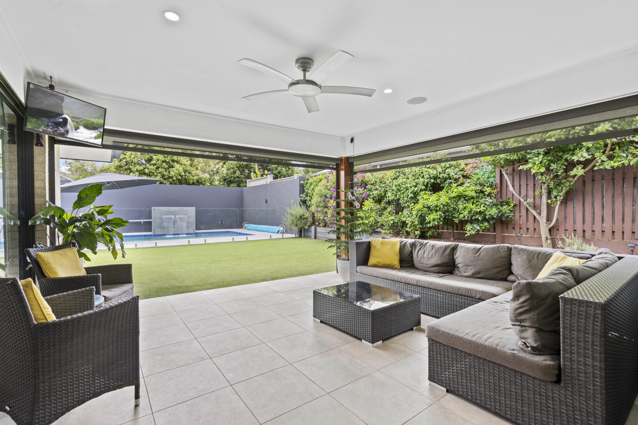 Outdoor entertaining area with sleek blinds for all year round comfort