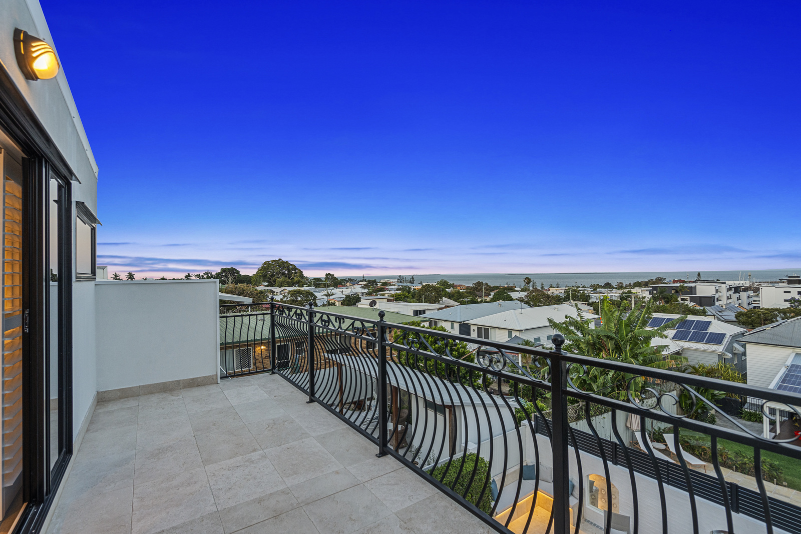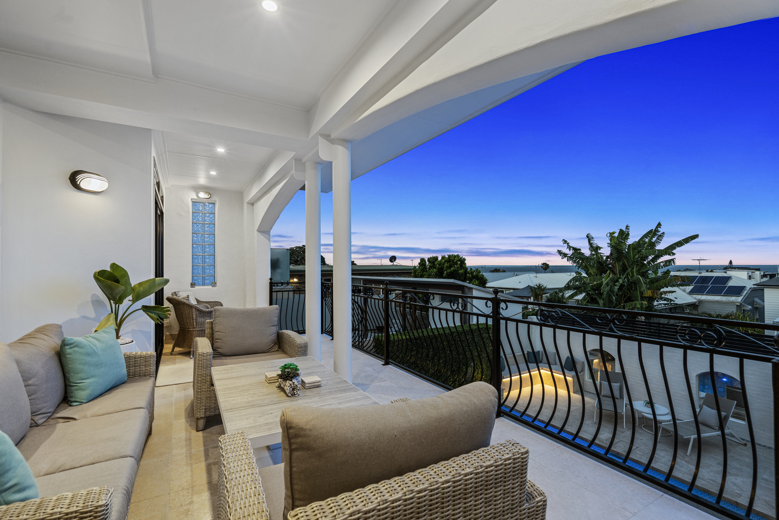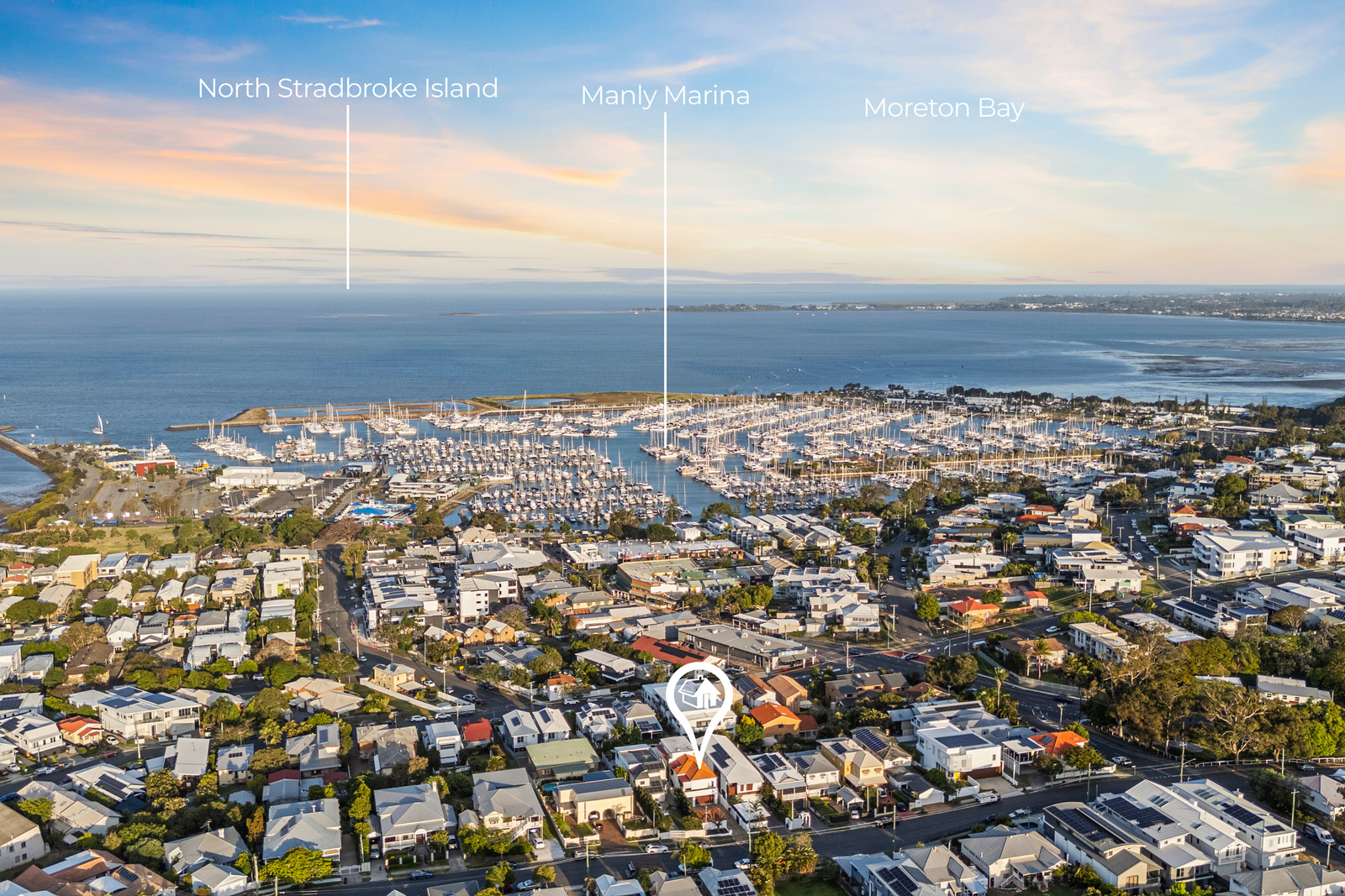 This immaculate Mediterranean-style home is situated on a 506sqm block and captures remarkable 180-degree views of the beautiful Moreton Bay, Manly Marina, and the bay islands.