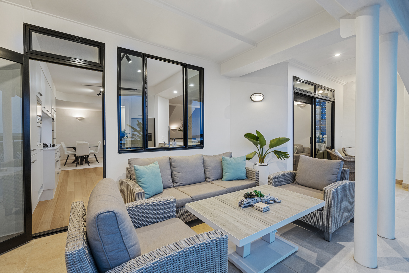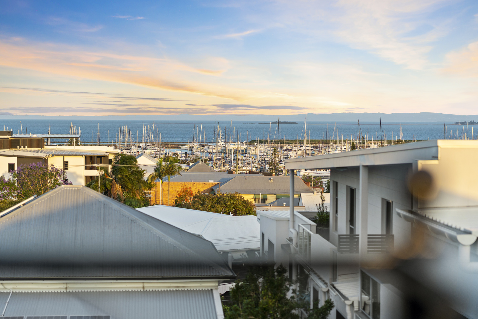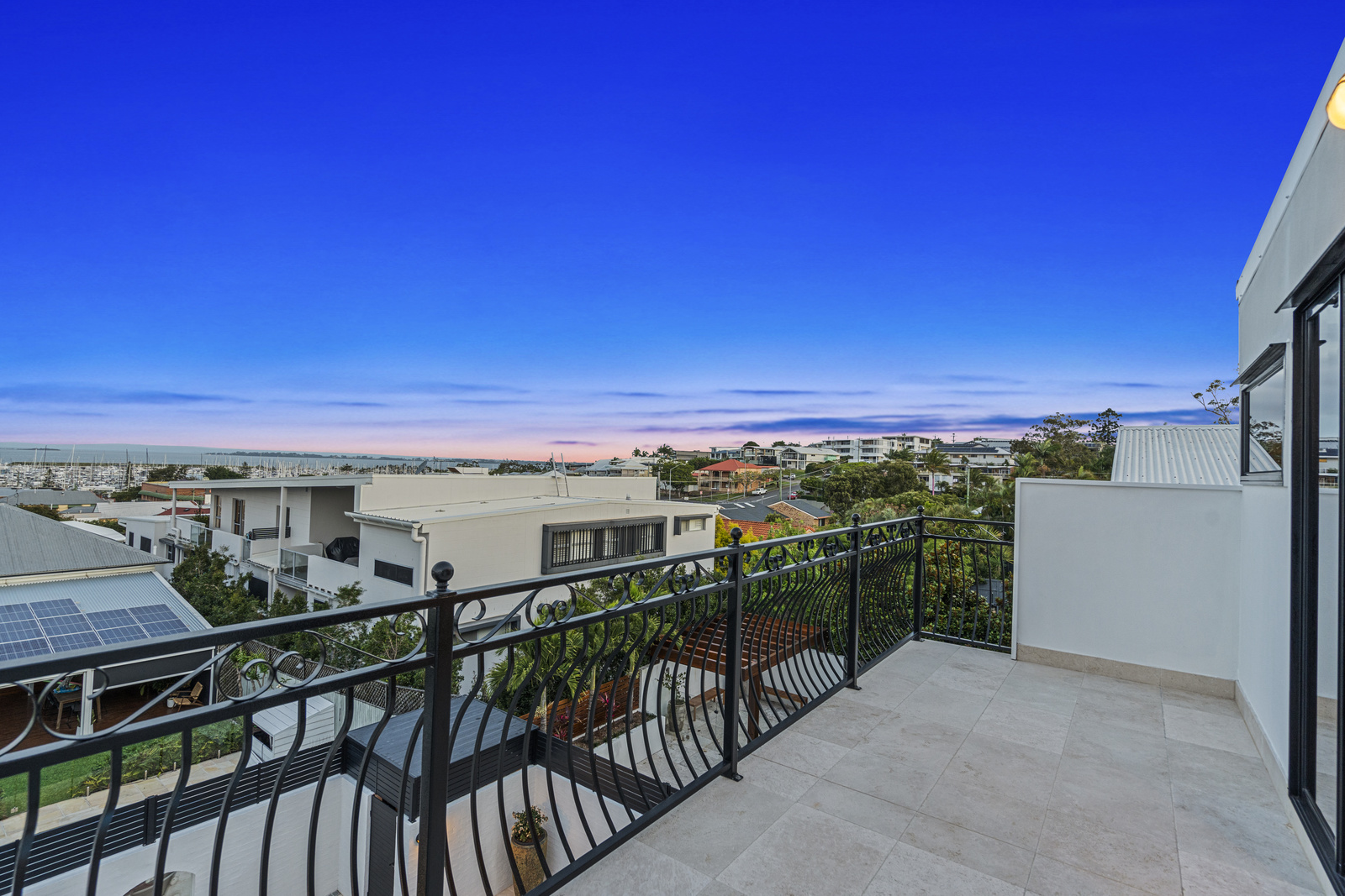 This immaculate Mediterranean-style home is situated on a 506sqm block and captures remarkable 180-degree views of the beautiful Moreton Bay, Manly Marina, and the bay islands.