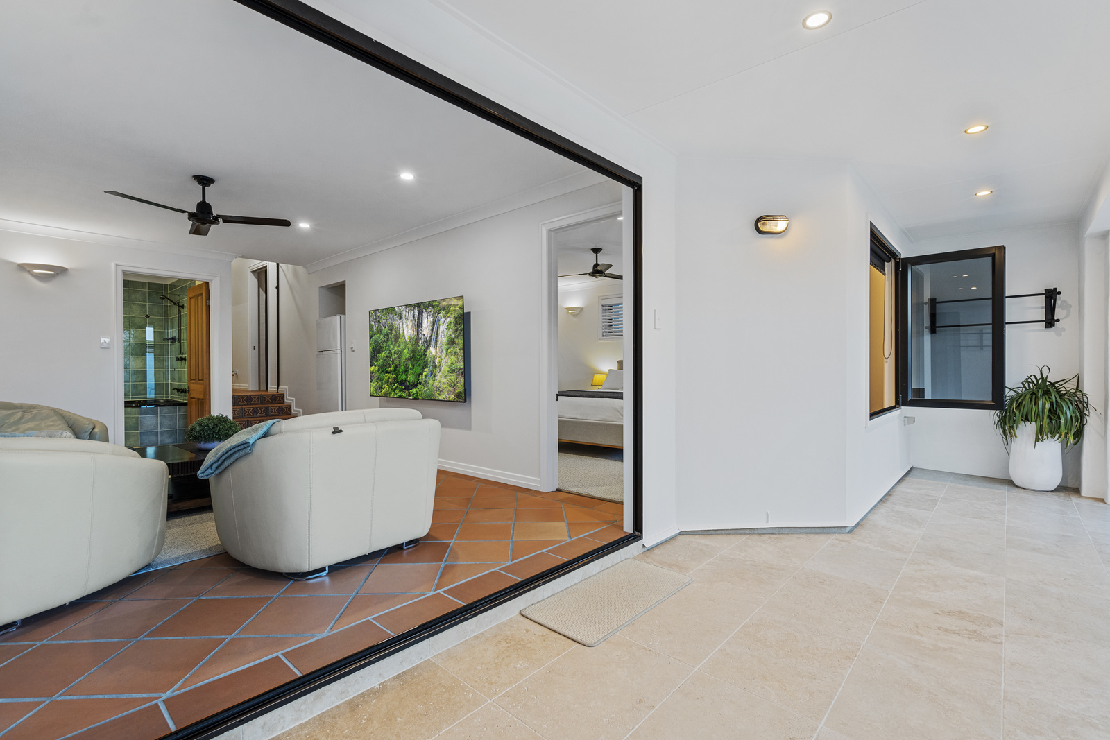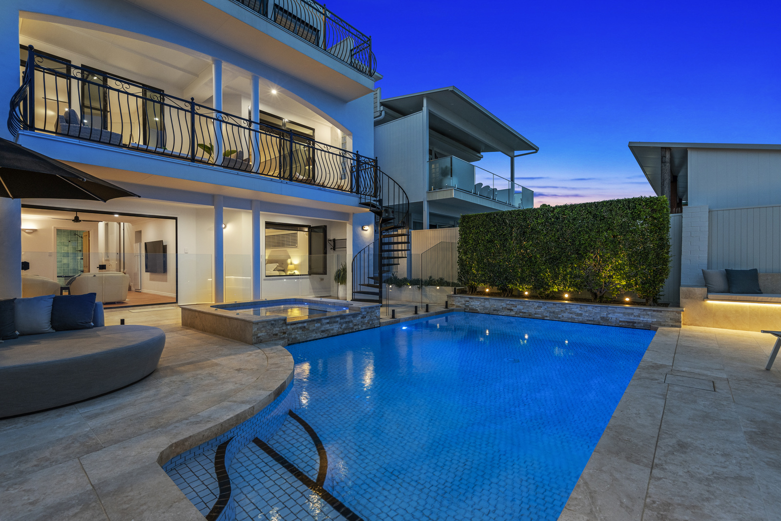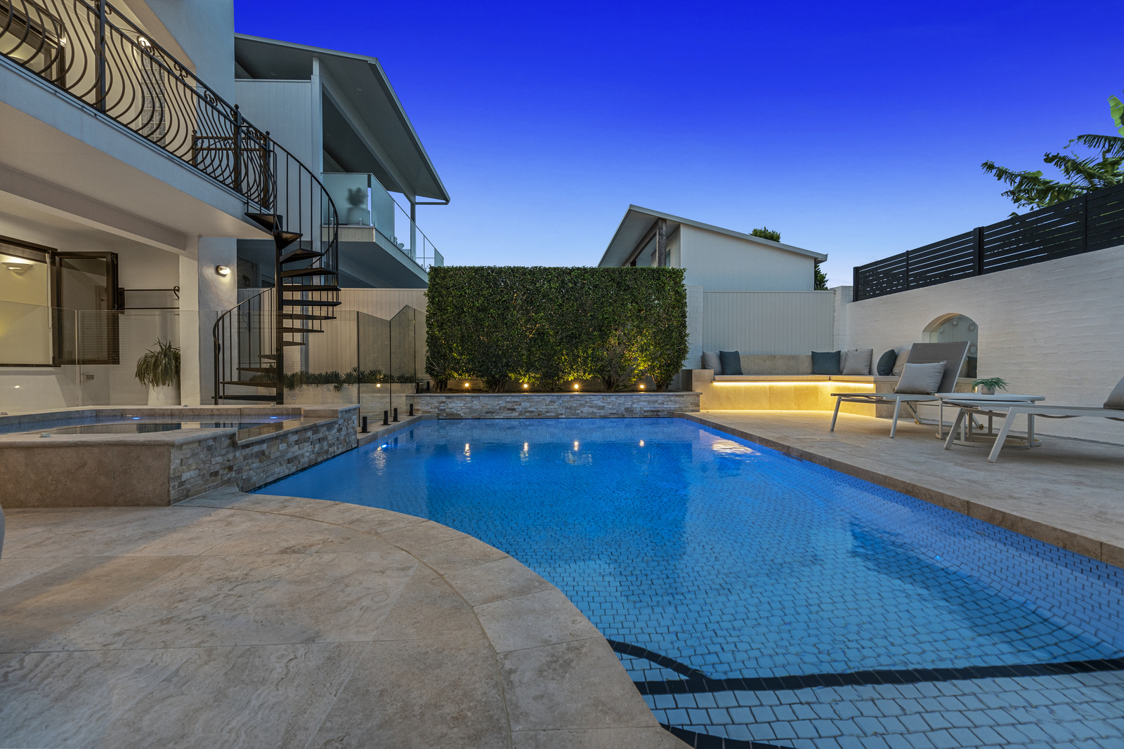 Upon entering, you are welcomed by an alfresco entrance reminiscent of a Spanish villa. The entrance level includes two bedrooms, a large bathroom with a corner bath, and a large rumpus area overlooking the fully tiled resort-style pool, and spa area. The outdoor area at 160 Carlton Terrace is truly spectacular, offering a serene retreat for relaxation and social gatherings.