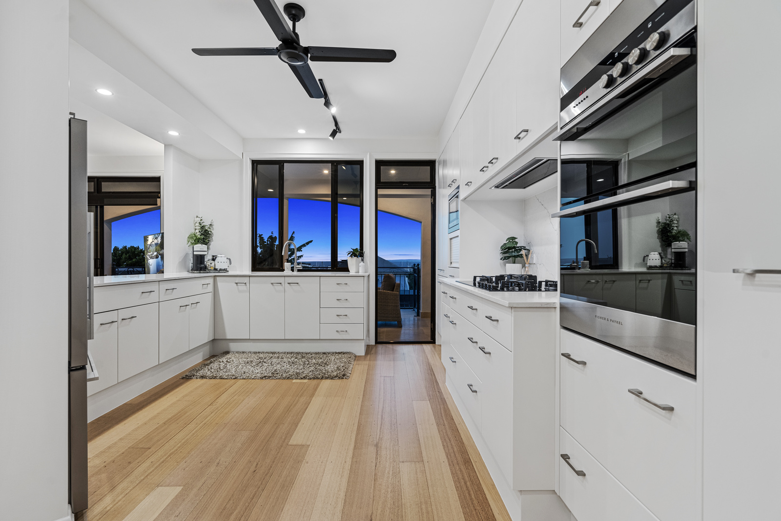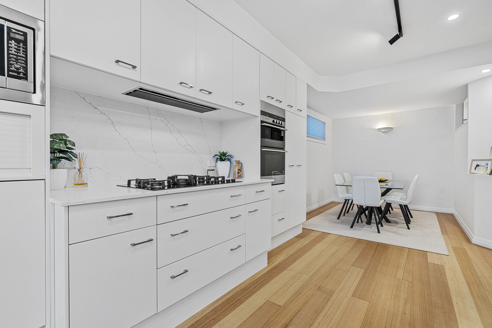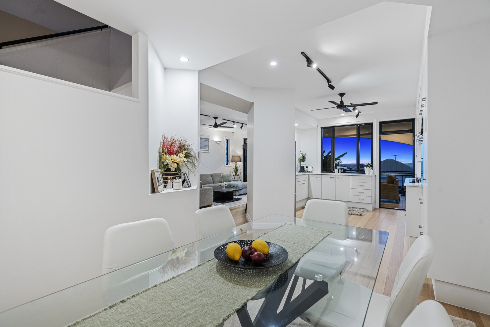 Continue up to the middle level via the spectacular spiral staircase or internal stairs to capture your first glimpses of the breathtaking views on offer. This level hosts the open-plan living area, which includes a dining room, lounge room, and a spacious entertainer’s kitchen that seamlessly extends to a covered deck capturing uninterrupted sweeping views of Moreton Bay and Manly’s iconic Boat Harbour. The gourmet kitchen is a chef’s delight, featuring integrated premium appliances, a gas cooktop, sleek neutral cabinetry, a striking marble splashback, breakfast bar seating, and ample storage and bench space.